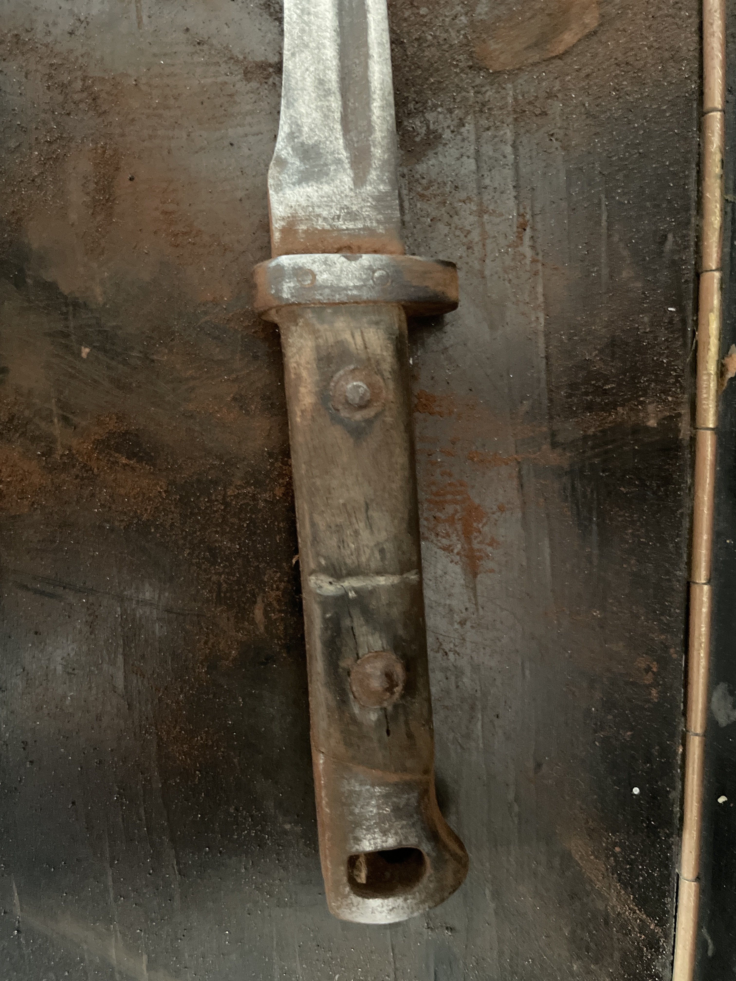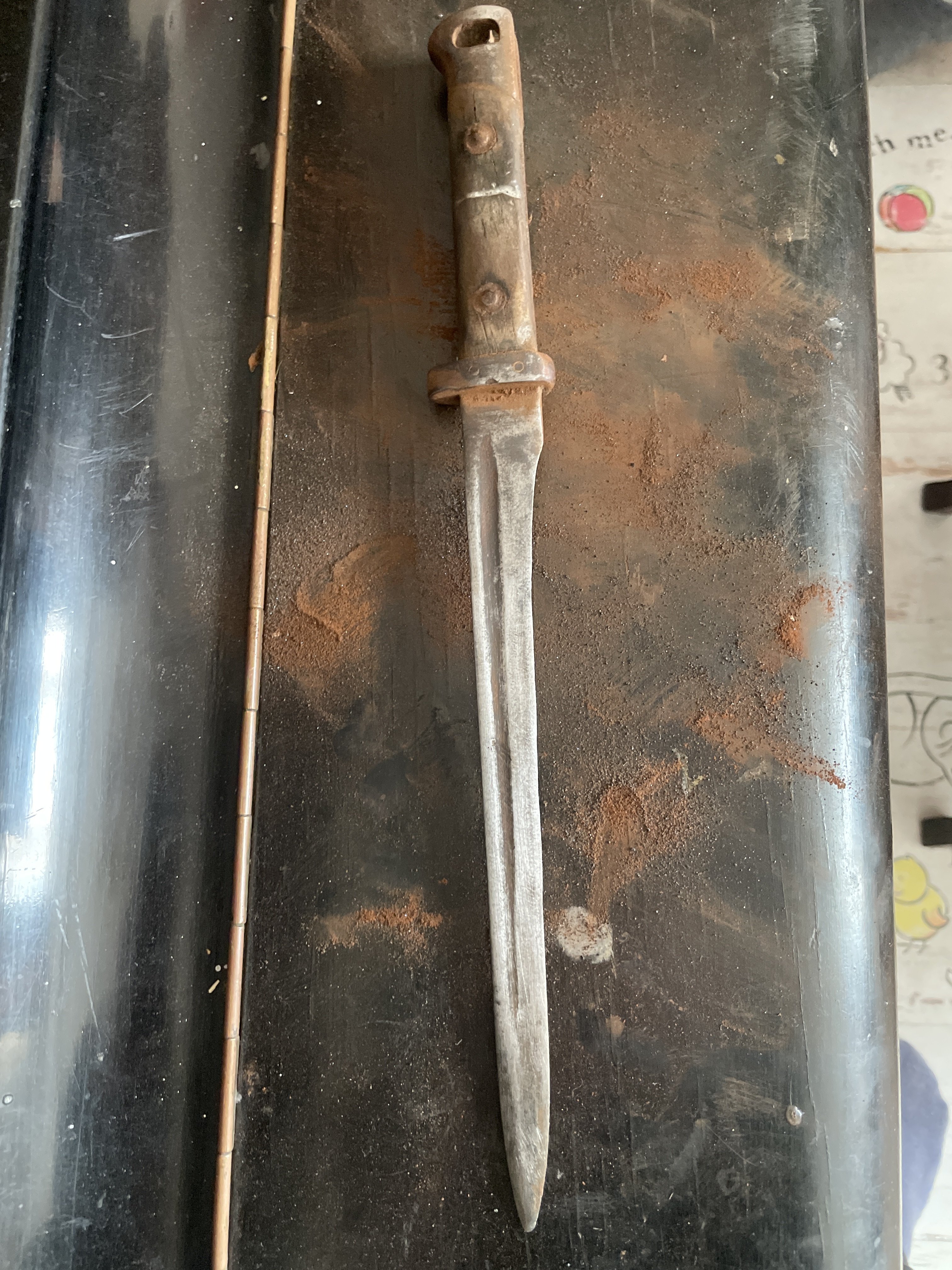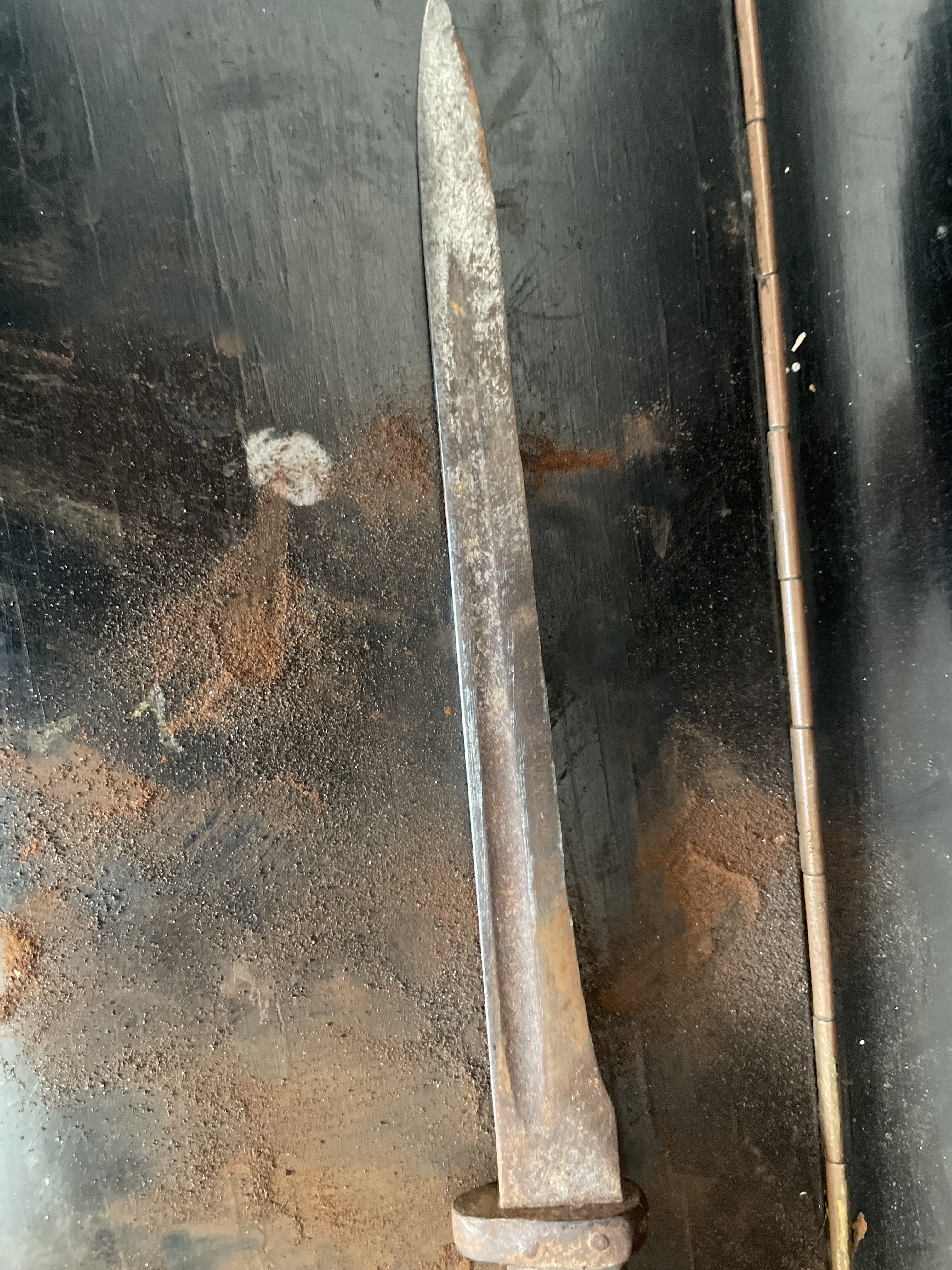 Добрий день камеради! Друг знайшов в свого дідуся штик, з його слів він часів першої світової. Єдине, ми не можемо визначитися з моделлю, тому просимо по вашу допомогу. Ніяких серійних номерів, штампів чи маркуваннь не видно . Приймаю любі відповіді російською та Українською.
