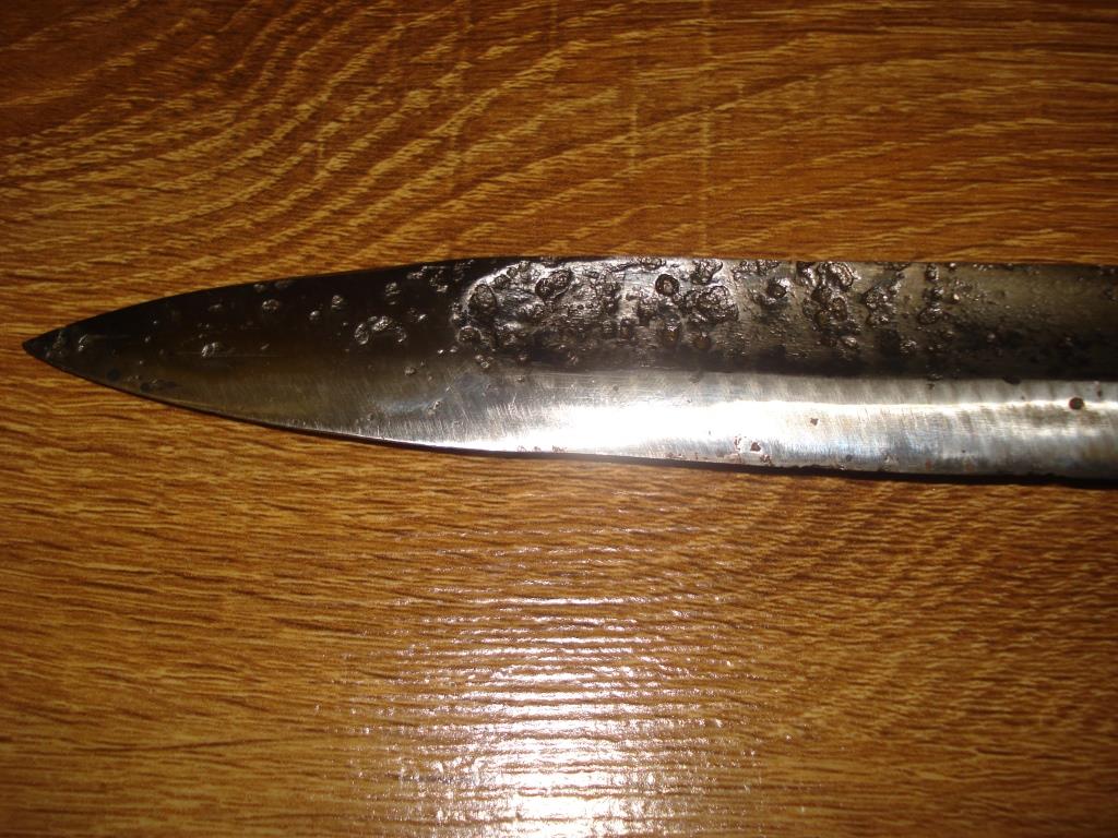 Доброго всім вечора. Попався ось такий штик. З своєї практики знаю що це поляк--принаймі думаю. НО---поляки вроді свої штики не воронували-а на ньому -руківї-є досить серйозний шар не то воронації не то оксидації---видно по фото. Цікавить питання, що це за модель конкретно--знайдений в такому стані в землі. Важкий -широкий-параметрами не поступається німцеві.