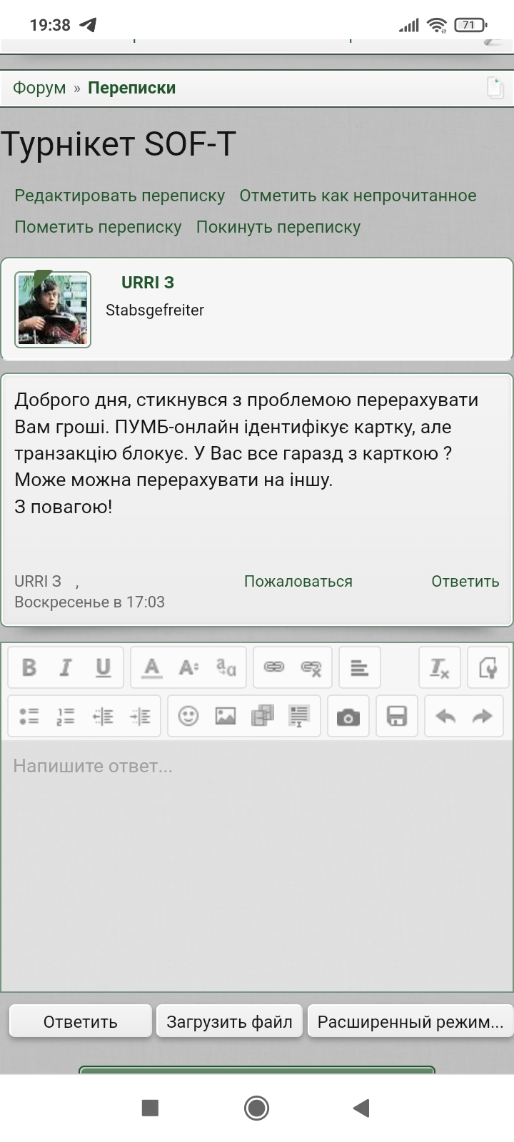 Доброго дня, нарахували штрафний бал за несплату лота без створення диспуту. У продавця якісь проблеми з карткою, застосунок картку ідентифікує але транзакцію блокує. Зразу написав продавцю в лічку, запропонував надати номер іншої карти, але він досі не відповів і з четверга минулого тижня на сайті не з'являвся. Чекав до останнього в надії що продавець вийде на зв'язок. Завжди намагаюся притримуватися правил форумах, прошу розглянути мою ситуацію. Скрин особистої переписки додаю. З повагою!