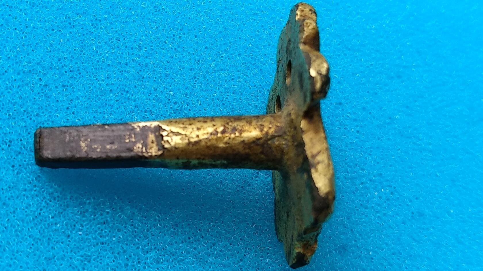 Доброго! Если середина полая (видится, что забита грязью и окислами), то 99%, что ключ от настольных часов, вангую, что фирмы Samson. Edmé Samson (1810-1891), художник по керамике. Фирма Samson & Cie была им основана в 1845 (фабрика находилась в Montreuil-sous-Bois возле Парижа), принимала участие во всемирных выставках 1867 и 1889 гг. С 1891 года Samson & Son. Производила фарфоровые часы с китайскими, японскими и саксонскими мотивами, а также бронзовые подставки и комплектующие к ним. Ну а Самсон, борющийся со львом - фирменный знак на ключе (на истину не претендую). С уважением,