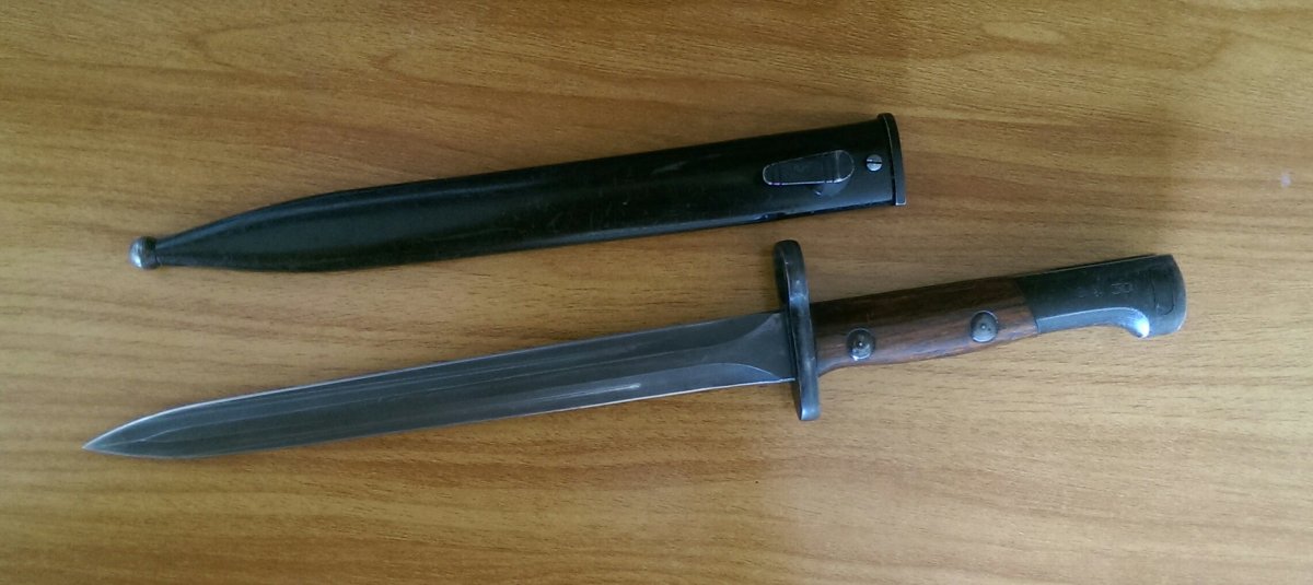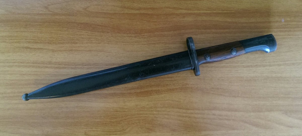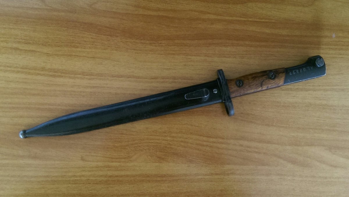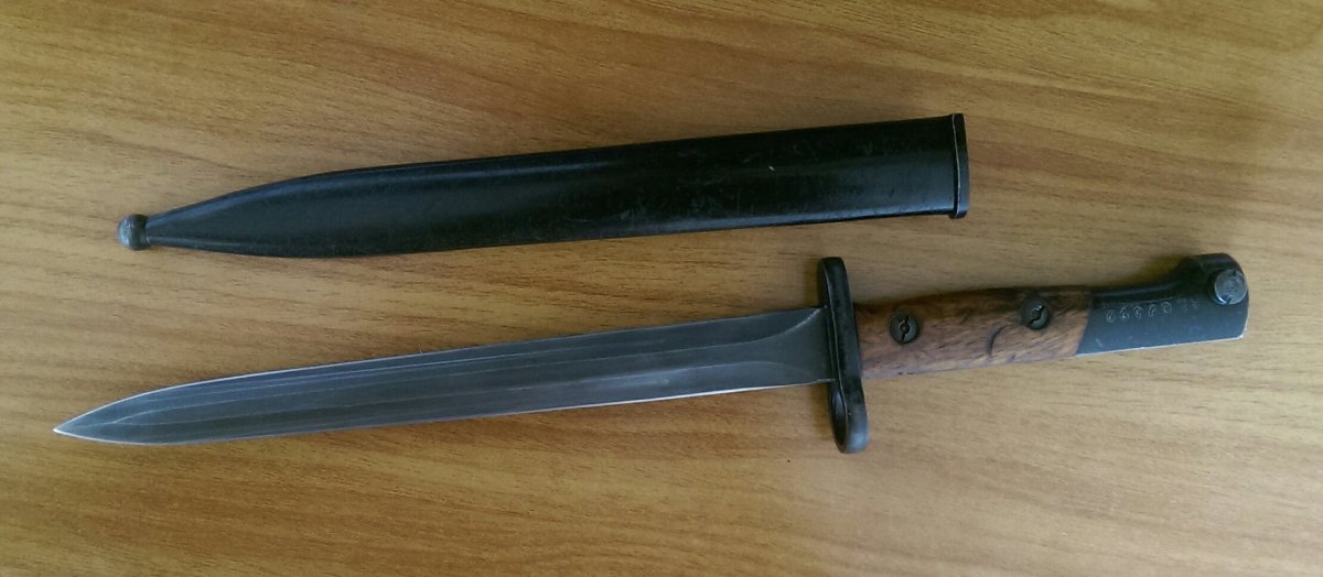 Штык Бельгийский,парник,образца 1949 года к самозарядной винтовке FN SAFN.Клинок штыка прямой, двулезвийный, шестигранный. Рукоять образована двумя деревянными щечками, скреплёнными с хвостовиком двумя винтами. В головке рукояти Т-образный паз (может быть с цилиндрическим расширением, может быть без него) и пружинная защёлка с внутренним расположением спиральной пружины. Крестовина прямая с кольцом для ствола. Ножны стальные с крючком и шариком на конце.На головке рукояти имеются обозначение модели винтовки,в данном случае полуавтоматическая калибра 30.06 - S.A. 30. В Крым и зону АТО не высылаю. 2650гр.