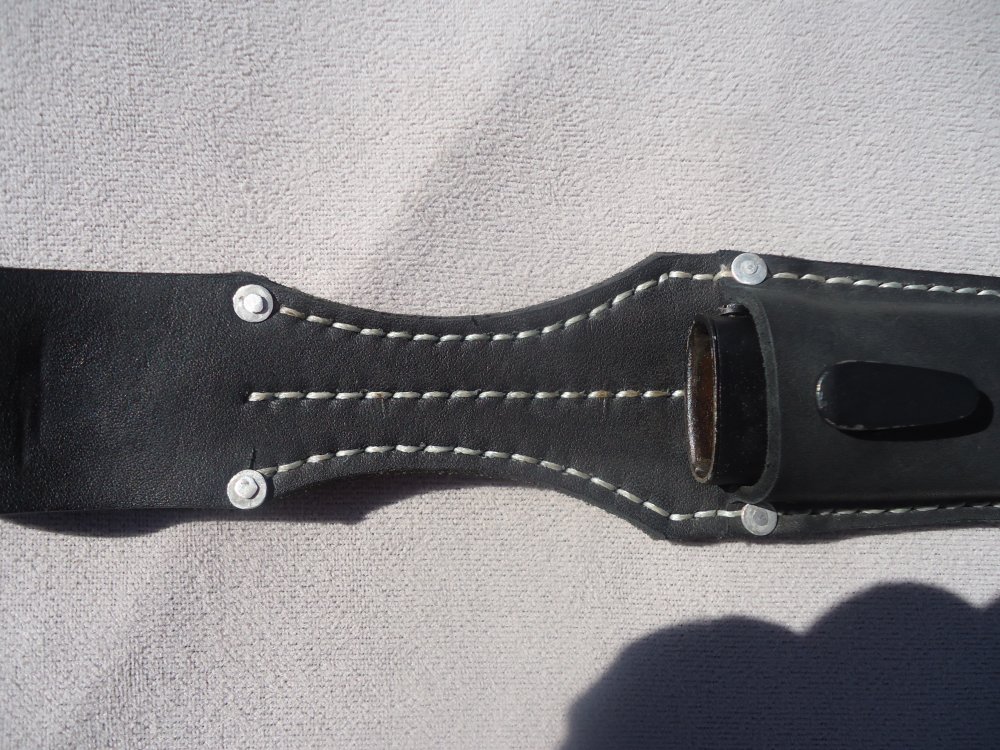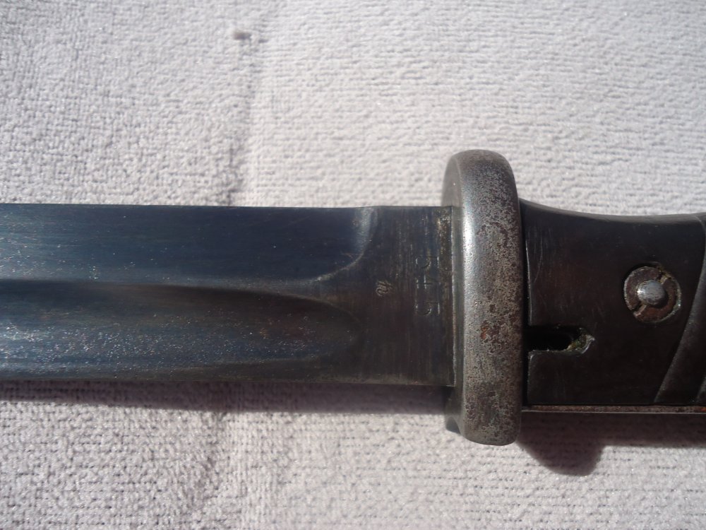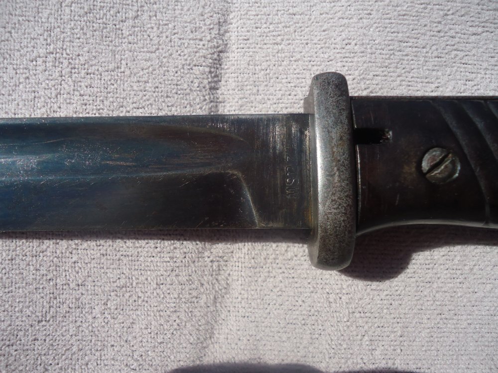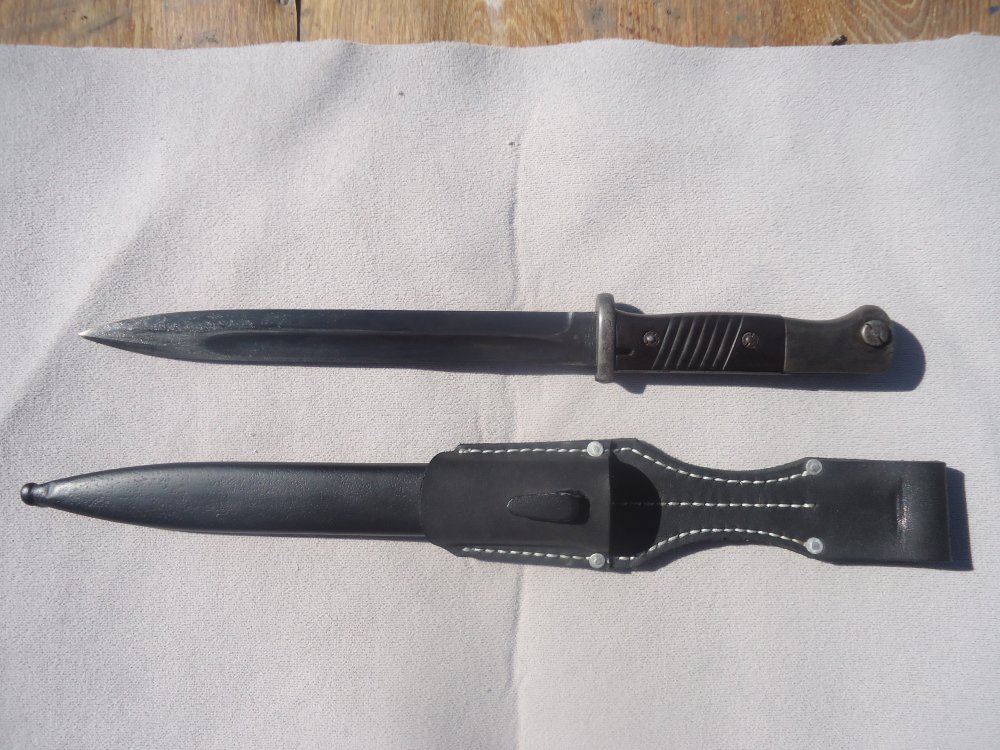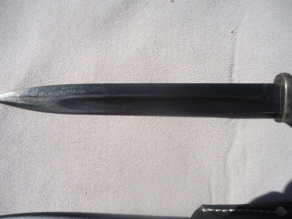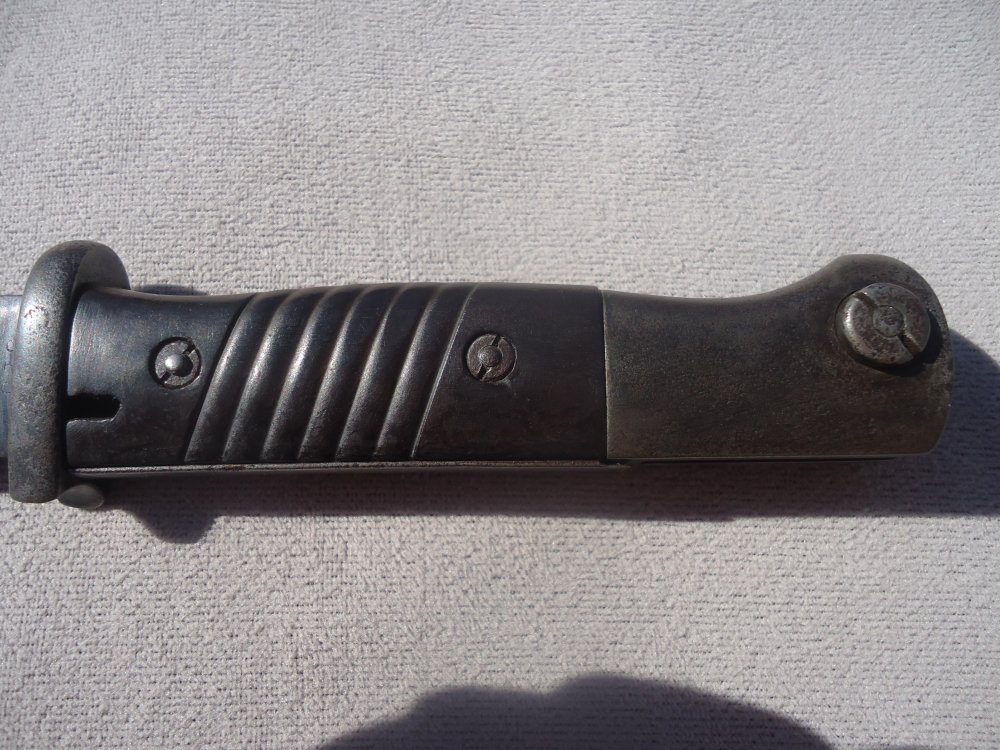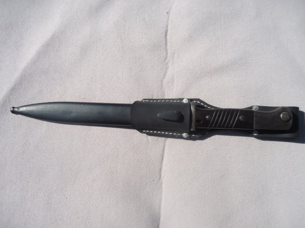 Это, простите, как Вы себе представляете??? Типа, кнопка на штыке настоящая, а сам штык - копия / фуфло. Так что ли? Длины не хватает минимум 1 см - ИМХО - сужу по геометрии... На ножнах - толстый слой краски, что говорит о ржавчине или шпатлёвки под ней (краской).