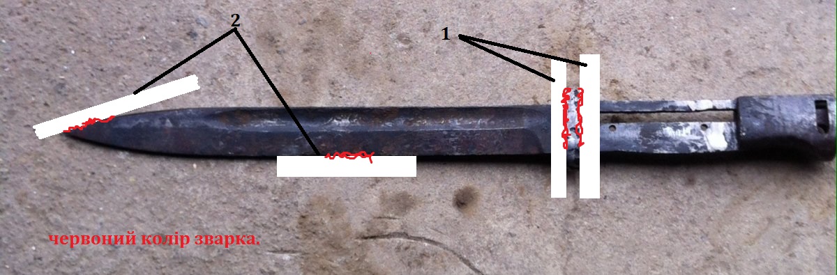 Не хочу втручатися в вашу роботу але, з метою все ж допомогти хочу вам дати пораду. Бачу що ви хочите зробити штик під хороший стан, тільки є косяки на гарді та кінчику леза. Щоб такого не було потрібно ставити в притик металічні пластинки та варити так щоб зварка лягала на гарду чи лезо та чуть наплавлялася на пластину. Пластина потому відірветься загибом в верх або при допомозі болгарки. Результат буде хороший та кутики гарди чи край леза не буде спалений. Як варіант відмітив на другому фото. Удачі вам в роботі.