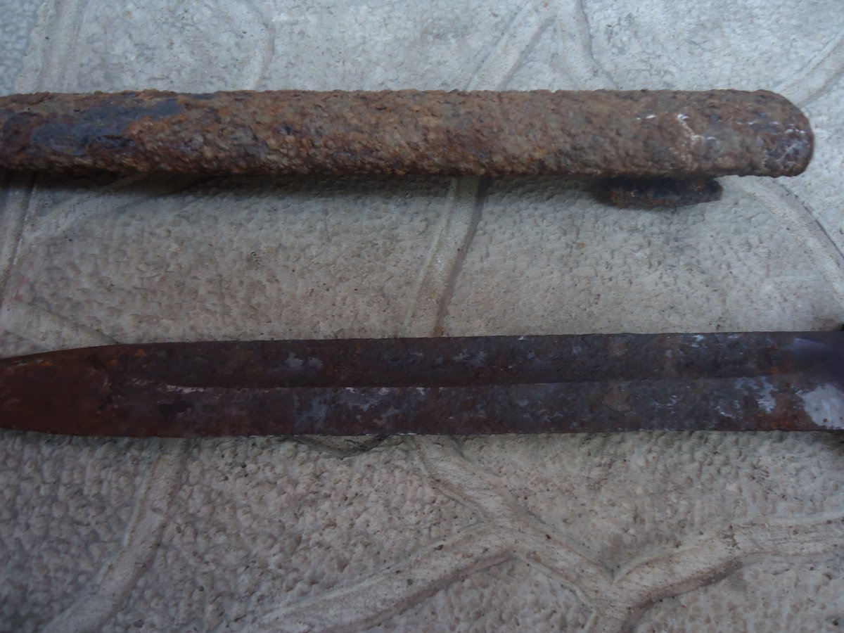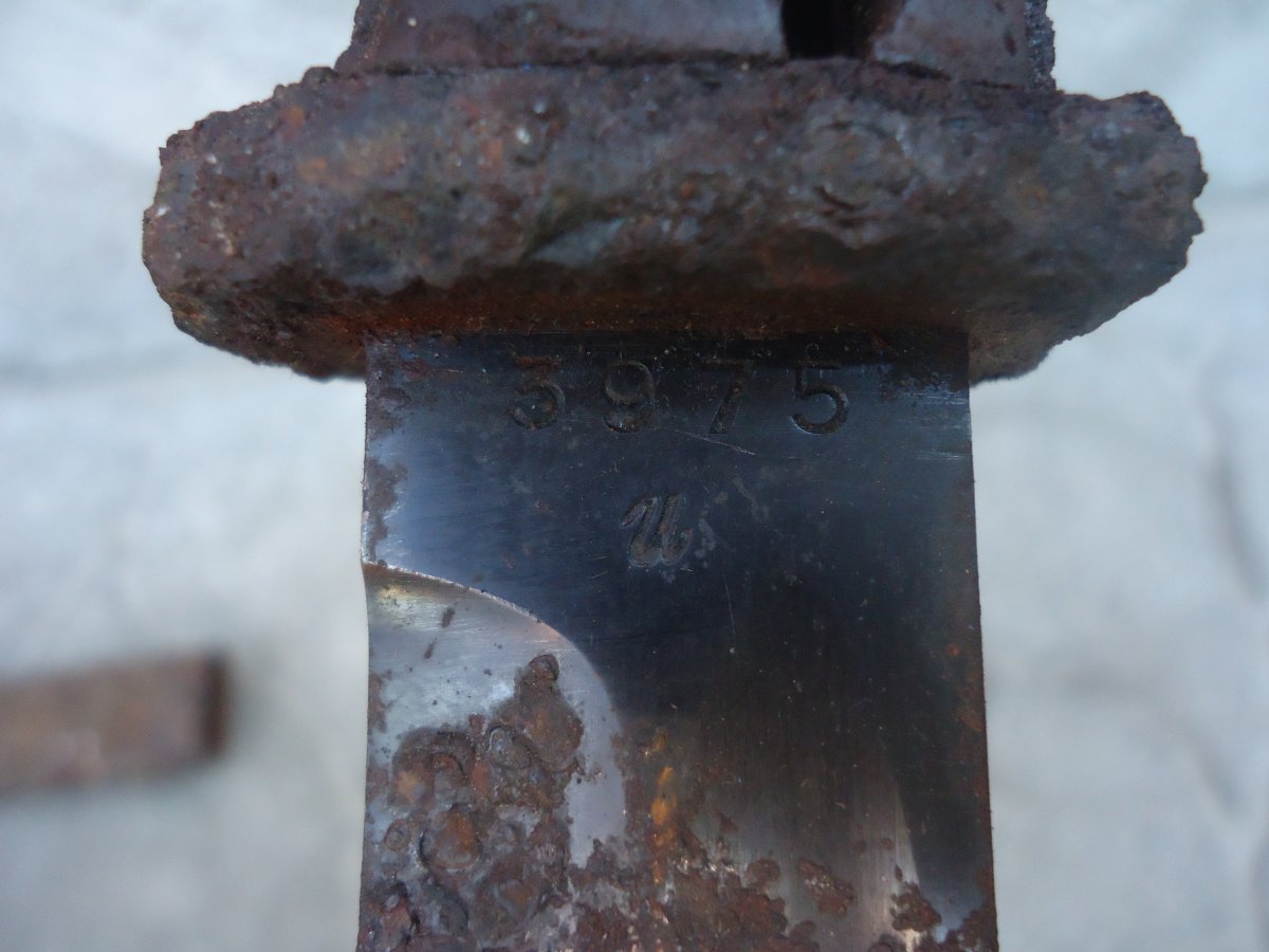 Копанные штыки всегда приносят огорчение,так как даже если клин в ножнах сохранится хорошо,рукоять обязательно будет в раковинах а ля лунный пейзаж.И куда его?Правильно-лучше оставить как нашли,слегка почистить от грязи,законсервировать маслом и в домашний музей.В таком виде штык будет "живой",с историей,а не реставрированное чучело.