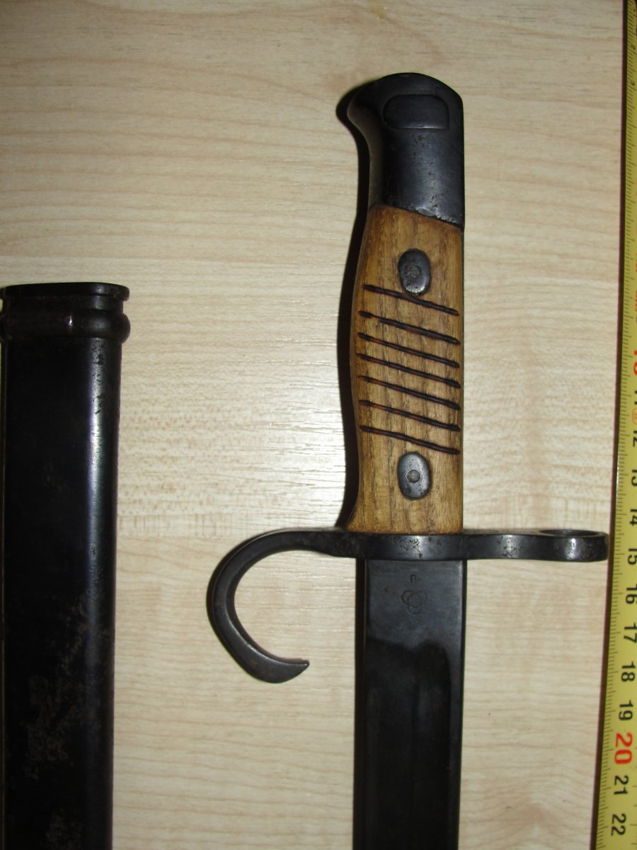 Подскажите информацию об этом ноже.Ко мне попал в таком виде,смущает дерево на ручке и "чернение".