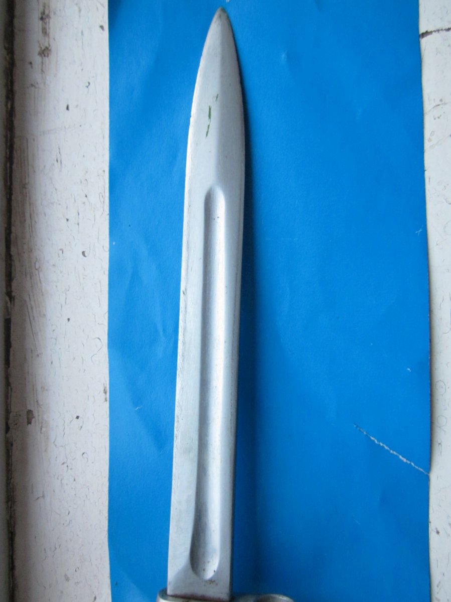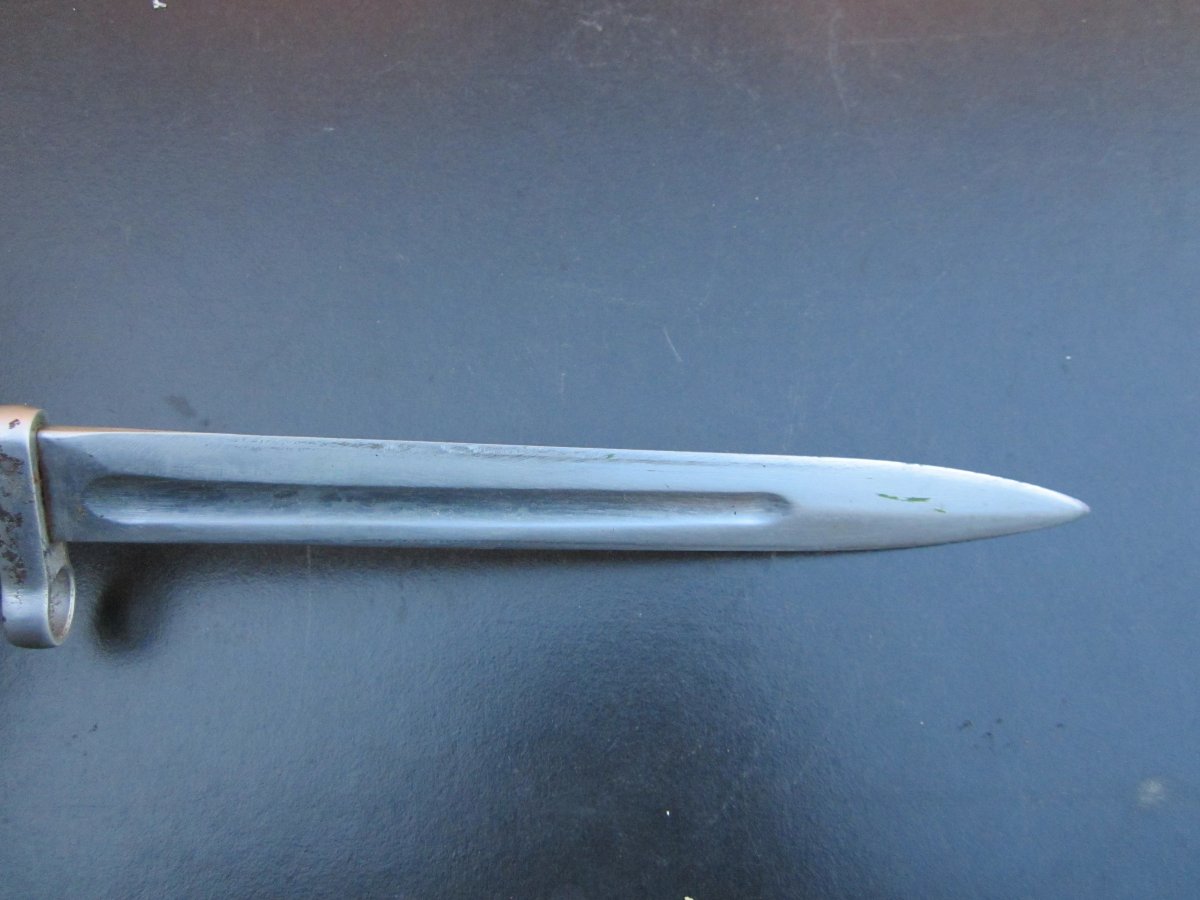 Добрый вечер,забрал у знакомого деда такой штык,кнопка отличная,не точеный,пружина в ножнах держит нормально,на клинку и ножнах клеймо звезда,по цене?