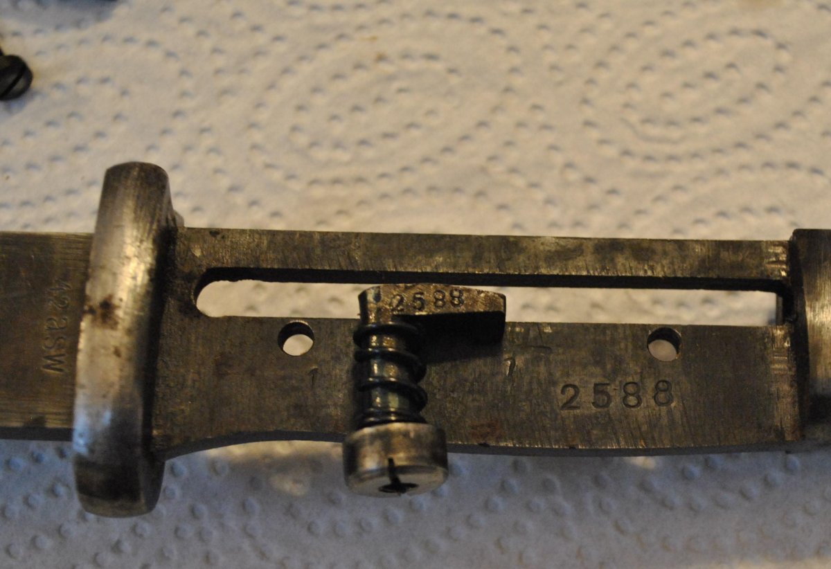 Доброго! Обсуждался с похожим клеймом на другом форуме, там AndyB тоже участвовал. Цитата его сообщения: When is a one piece handle with blade so its a german export to Spain some call it M1936, some are wout barell ring and flashguard, when 2 pieces so its Spanish M1943 bayonet. Думаю, он имел в виду, что немецкие для Испании иногда шли без кольца и огнеупорной пластины. С уважением,
