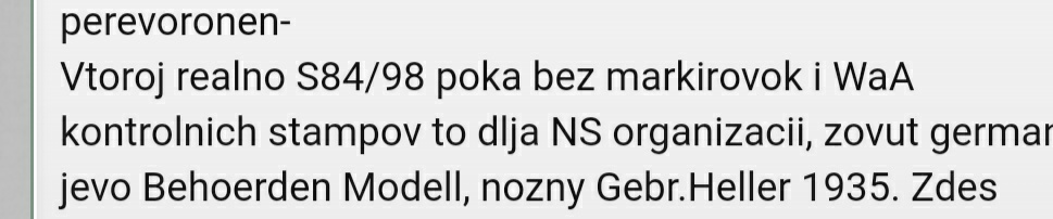 Nado skazat sto pervij v reale ispanskij styk M43, mozet byt sto nakladki byli v remonte izmeneny i ot germanskovo S84/98 kotorij prosel v Ispaniu, nozny germanskije.Realno perevoronen- Vtoroj realno S84/98 poka bez markirovok i WaA kontrolnich stampov to dlja NS organizacii, zovut germanci jevo Behoerden Modell, nozny Gebr.Heller 1935. Zdes nakladki novodel dumaju.s uv.Andy
