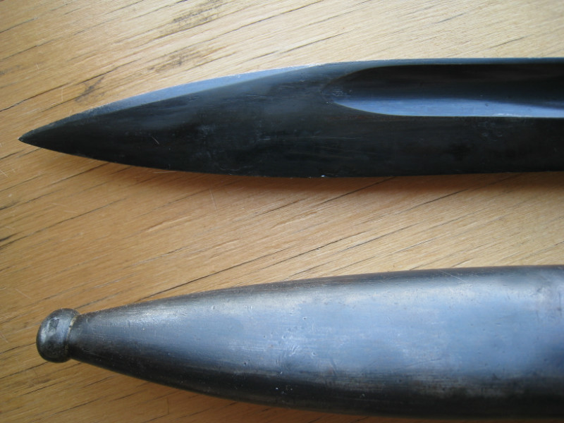 Вот последнее письмо: "никаких точений и прочей проблемности... если бы с ним было что-то не так я бы написал... про родное воронение мал что написано, нафоруме продавали как-то подобные, люди говорят что был такой вариант воронения достаточно редкий, такое воронение было как на ранних штыках так и на более поздних... реально редкое! никаких дыр мятин даже потертстей нет! вещь коллекционная" Во как... А вот про бакелит: "нет не ремонтный точно, такой бакелит шел на поздних как раз..."