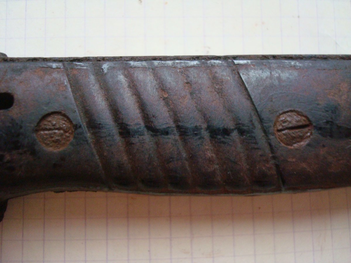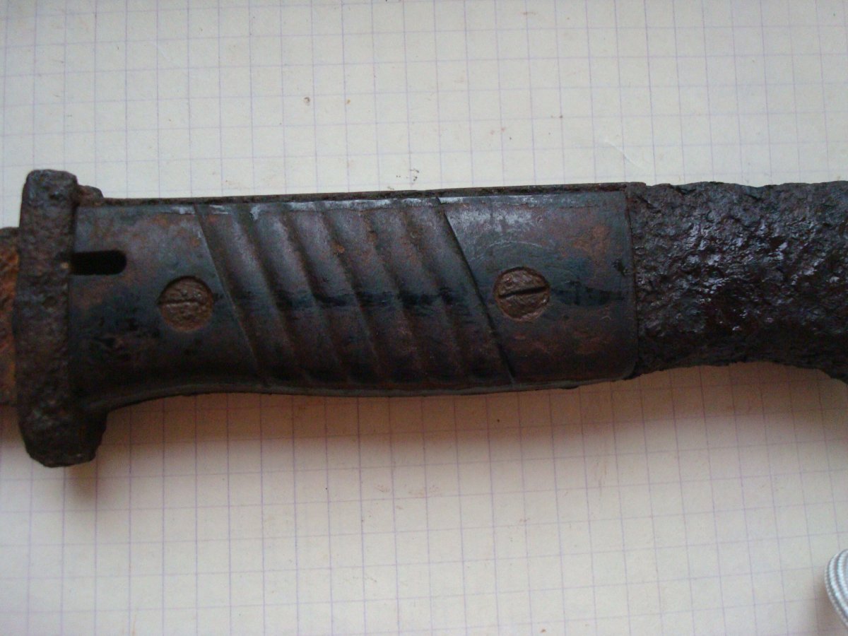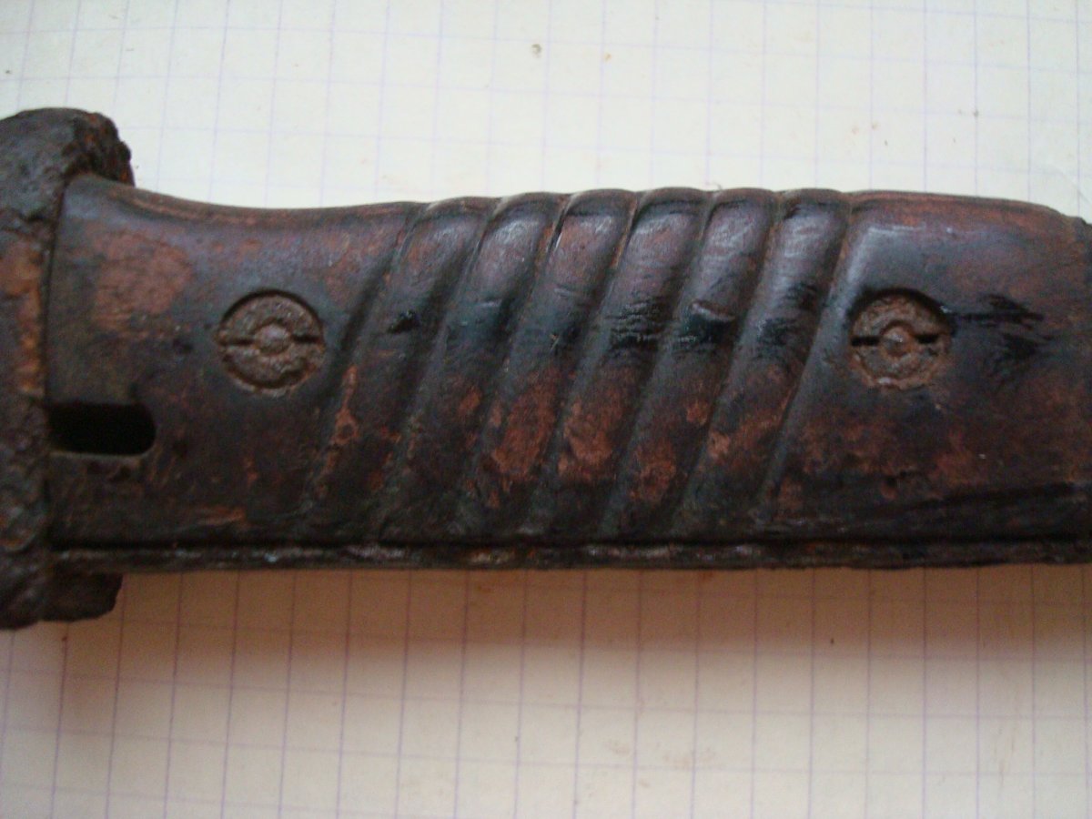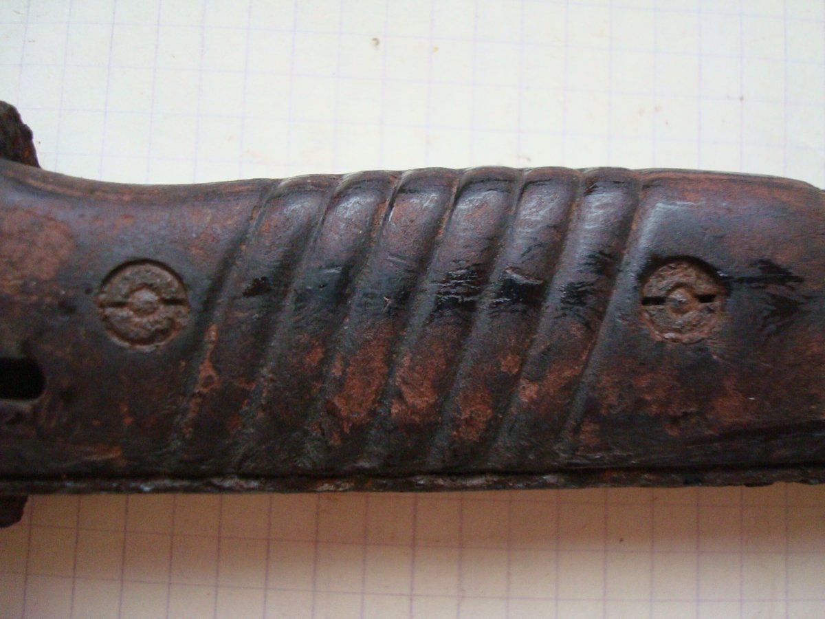 Доброе время суток. Попался такой штык-нож. Подскажите с чего начать, и как раскрутить, чтобы бакелит остался целый?! Зарание благодарен.
