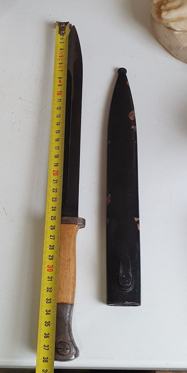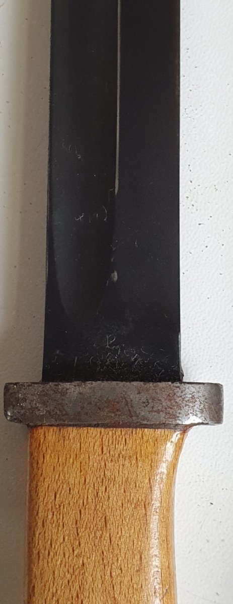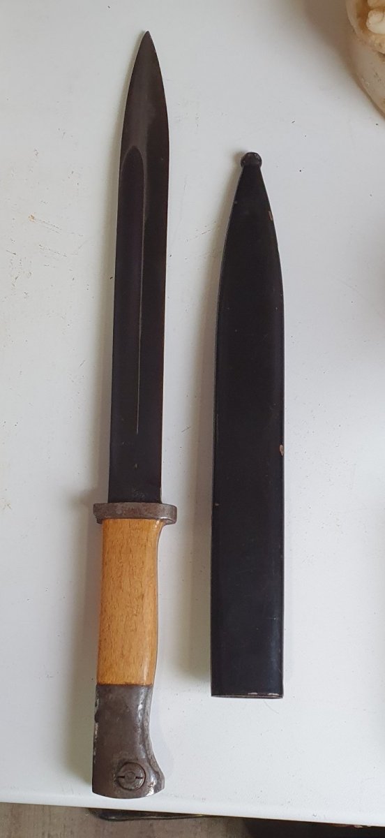Штык к98 производства F.W.Holler выпущен с 1934 по 36 год . Утрачены болты , огнеупорная пластина и воронение рукояти . Щечки новодельные , приклеенные . До переделки выглядел вот так .