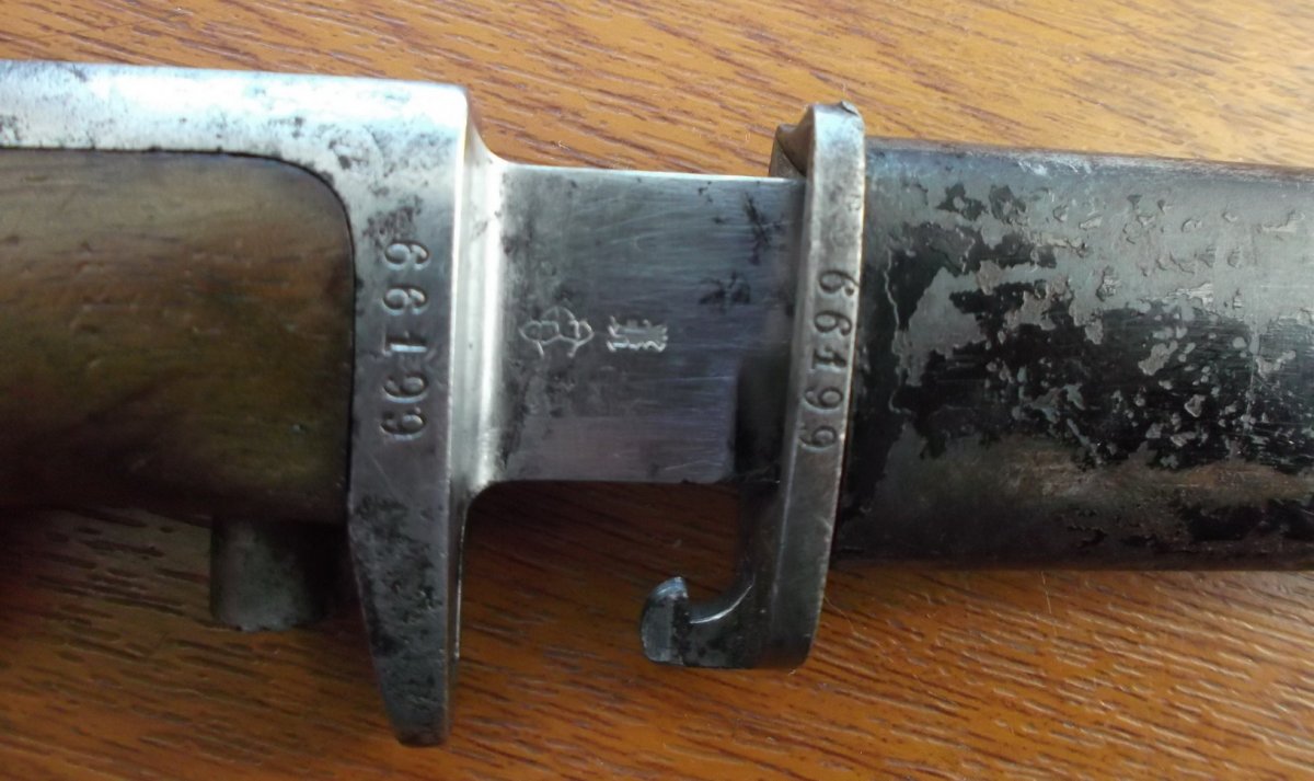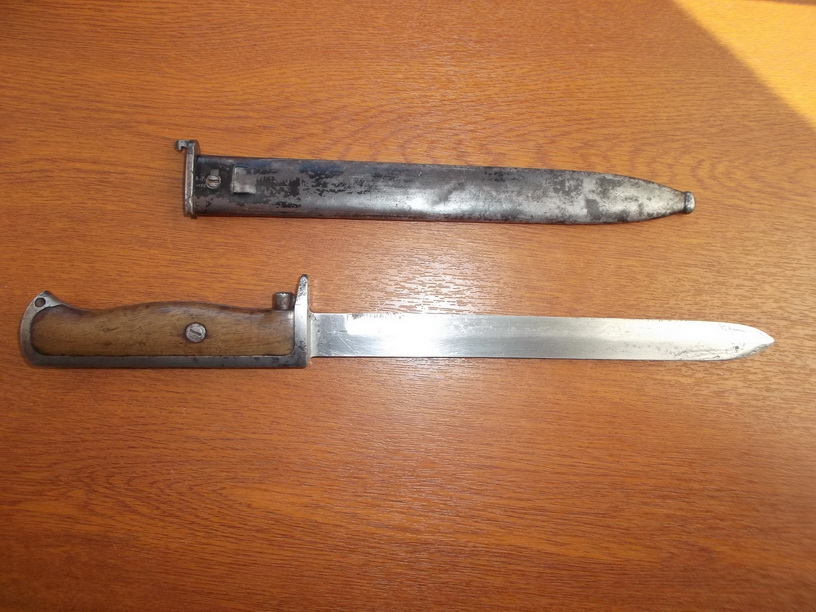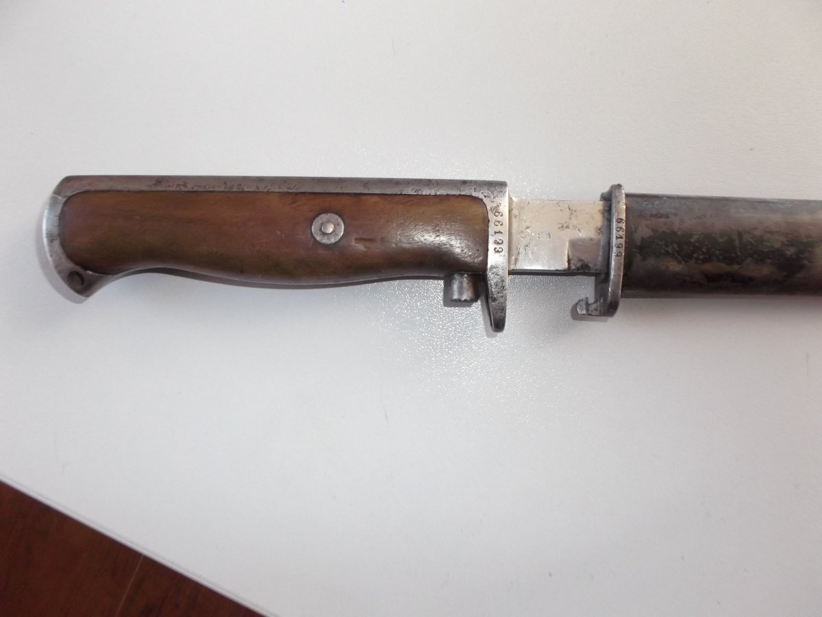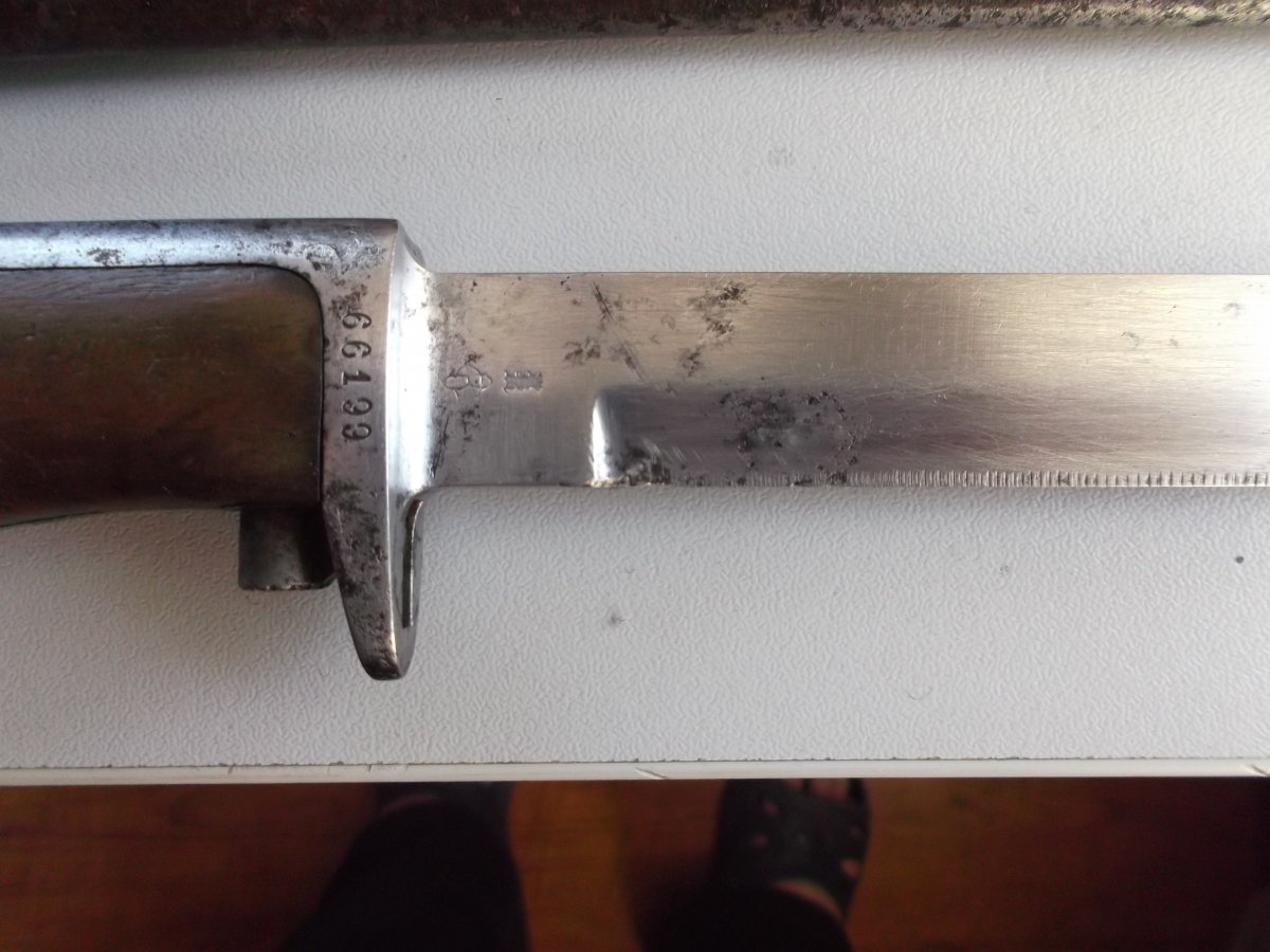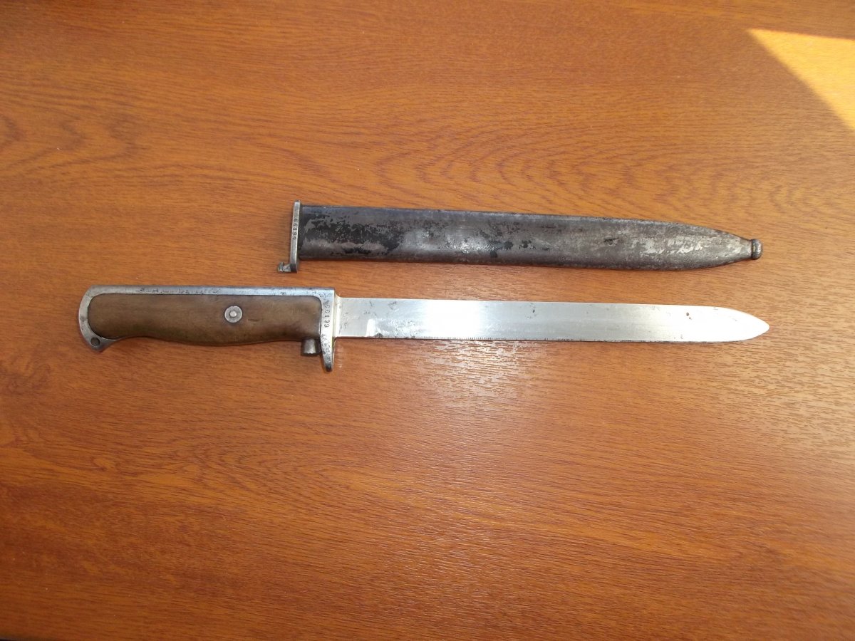 Здравствуйте уважаемые камради! Подскажите пж. по оценке этого штык-ножа.Кнопка работает отлично,на ножнах есть небольшая продолговатая вмятина и остатки черной краски.Ножны закрываются со щелчком.Очень крепкий штык для своих лет.Любые доп.фото.