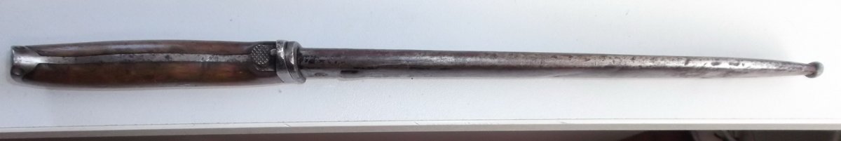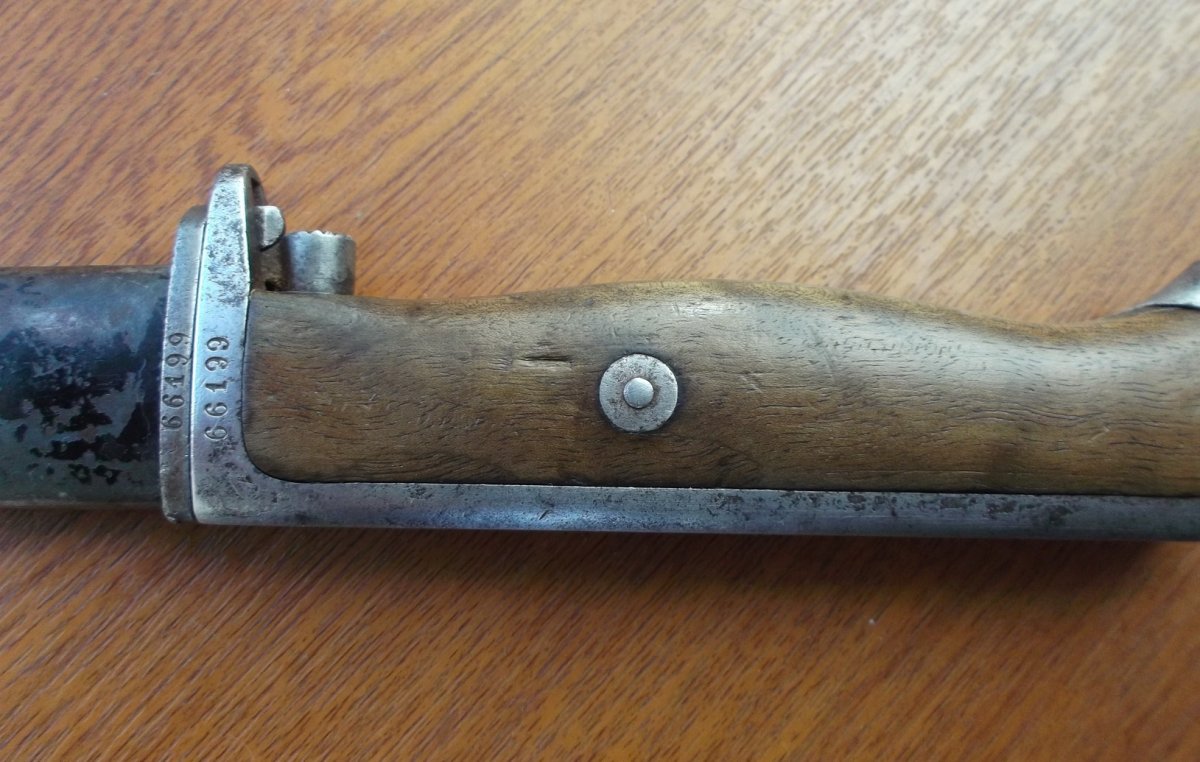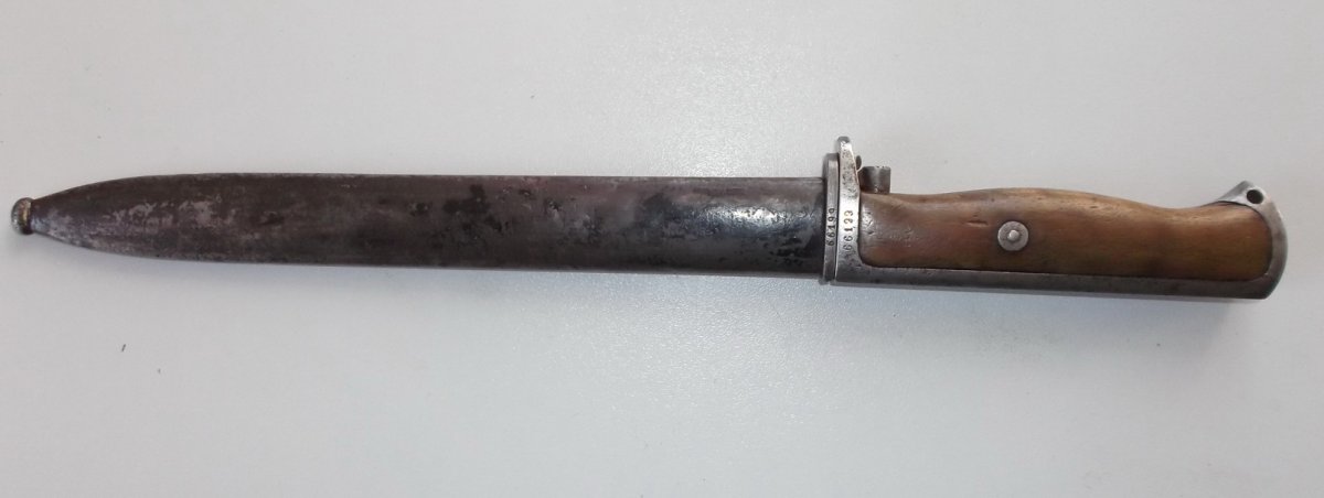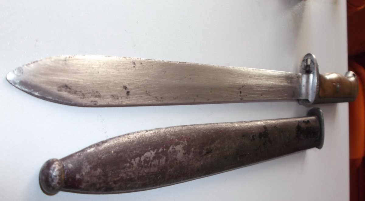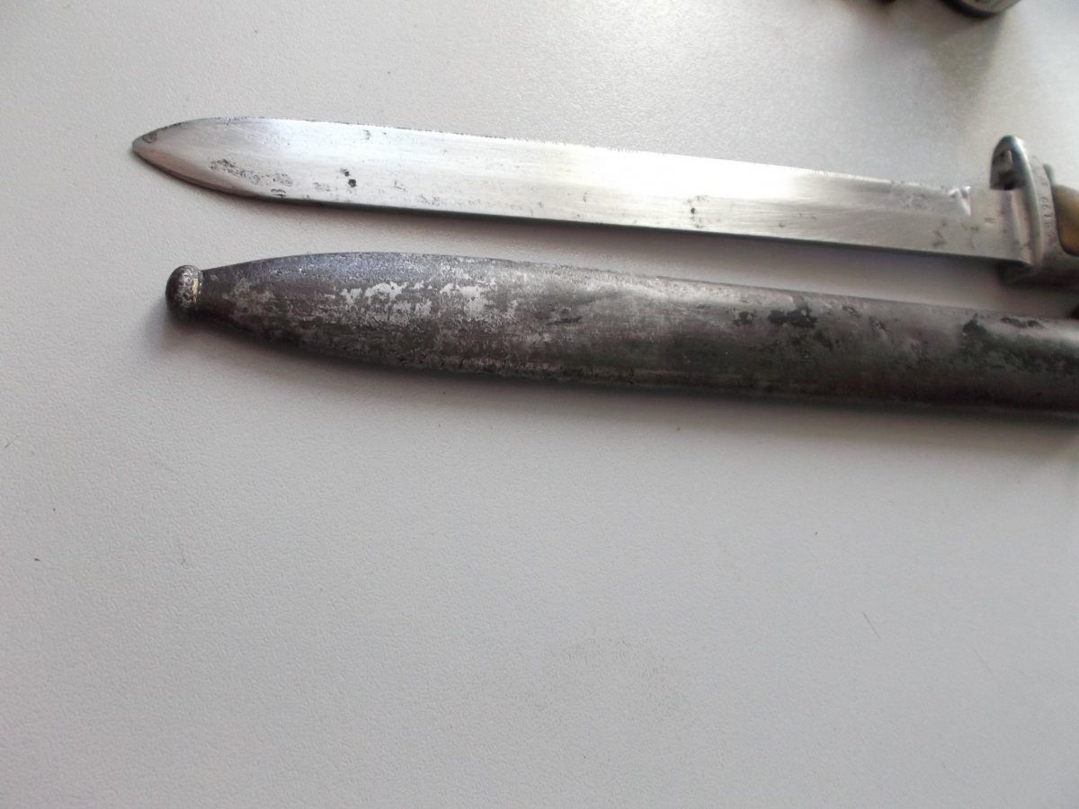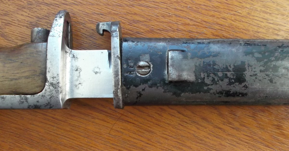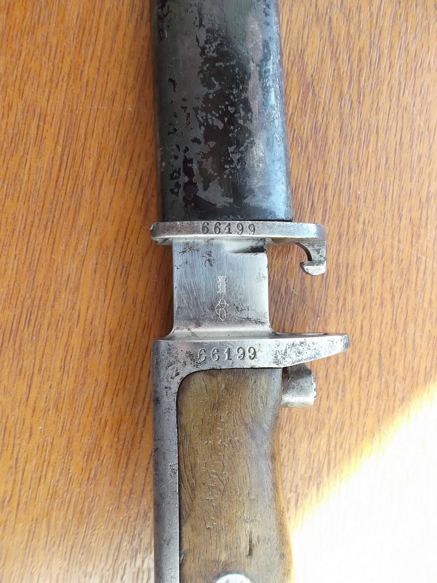 Здравствуйте уважаемые камради! Подскажите пж. по оценке этого штык-ножа.Кнопка работает отлично,на ножнах есть небольшая продолговатая вмятина и остатки черной краски.Ножны закрываются со щелчком.Очень крепкий штык для своих лет.Любые доп.фото.