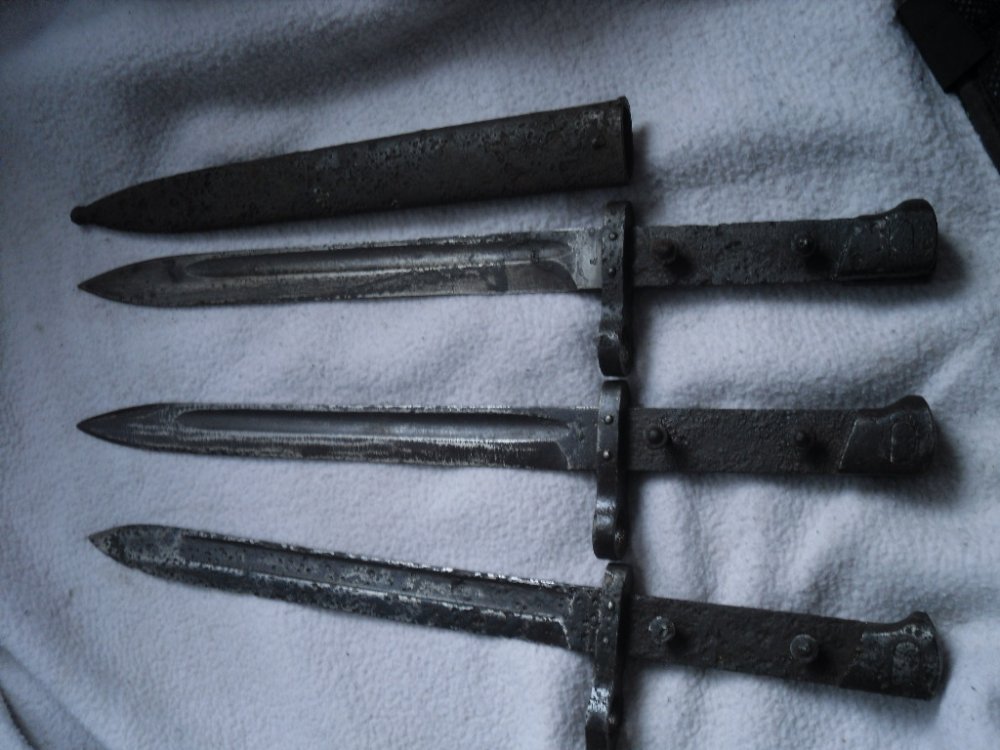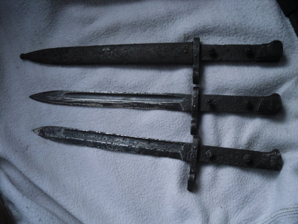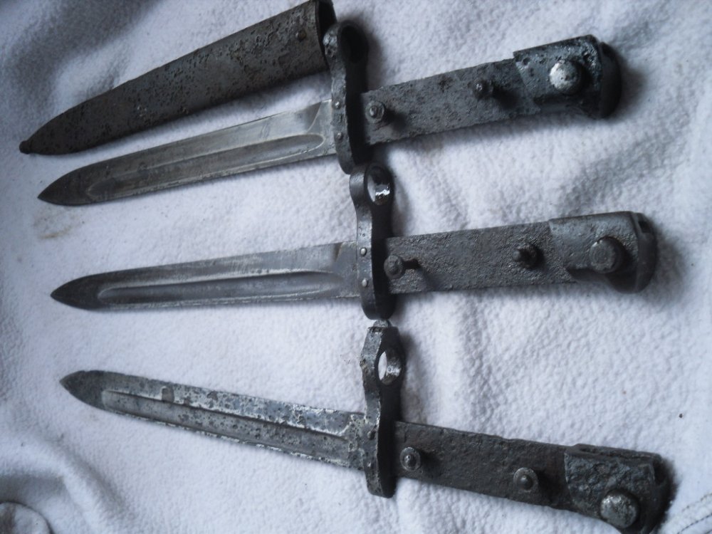 Прошу Вашей помощи в оценке на данные штычки. Один был в ножнах копаный, один с чердака и походу кавалерийский с мушкой на кольце. На всех кнопки работают.