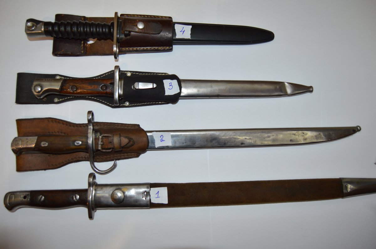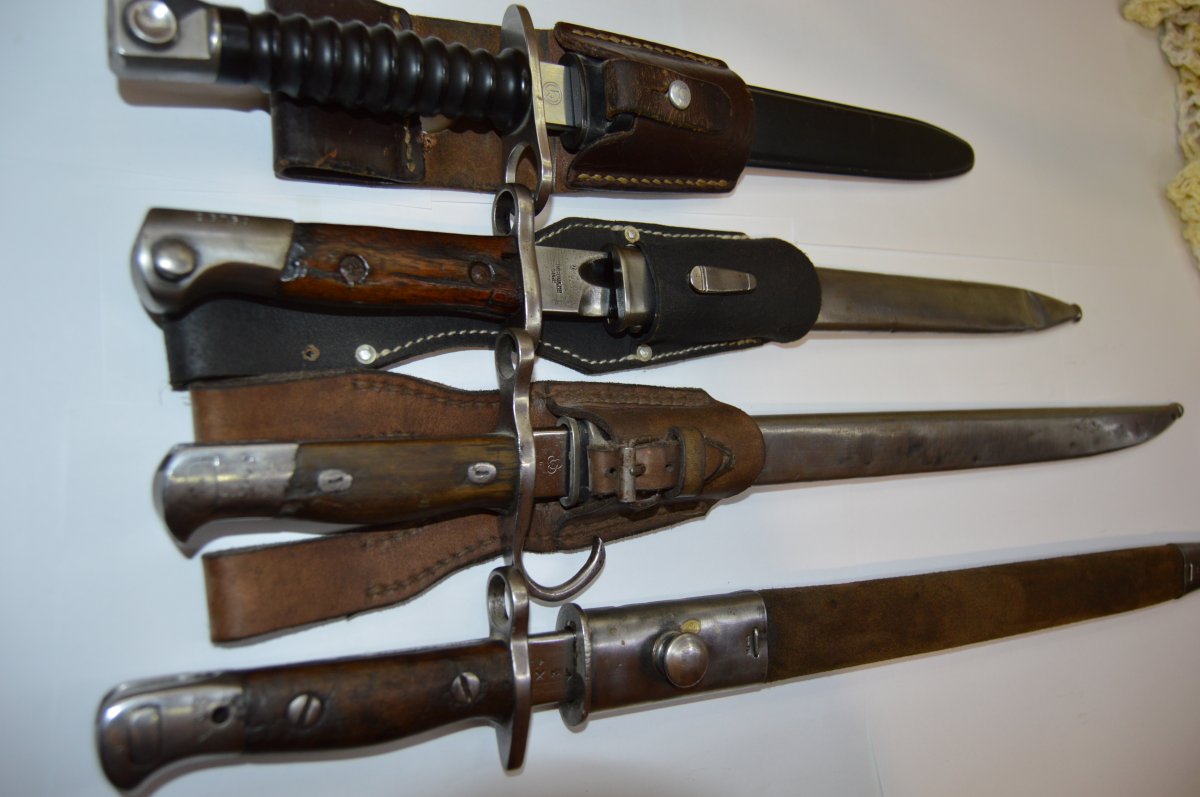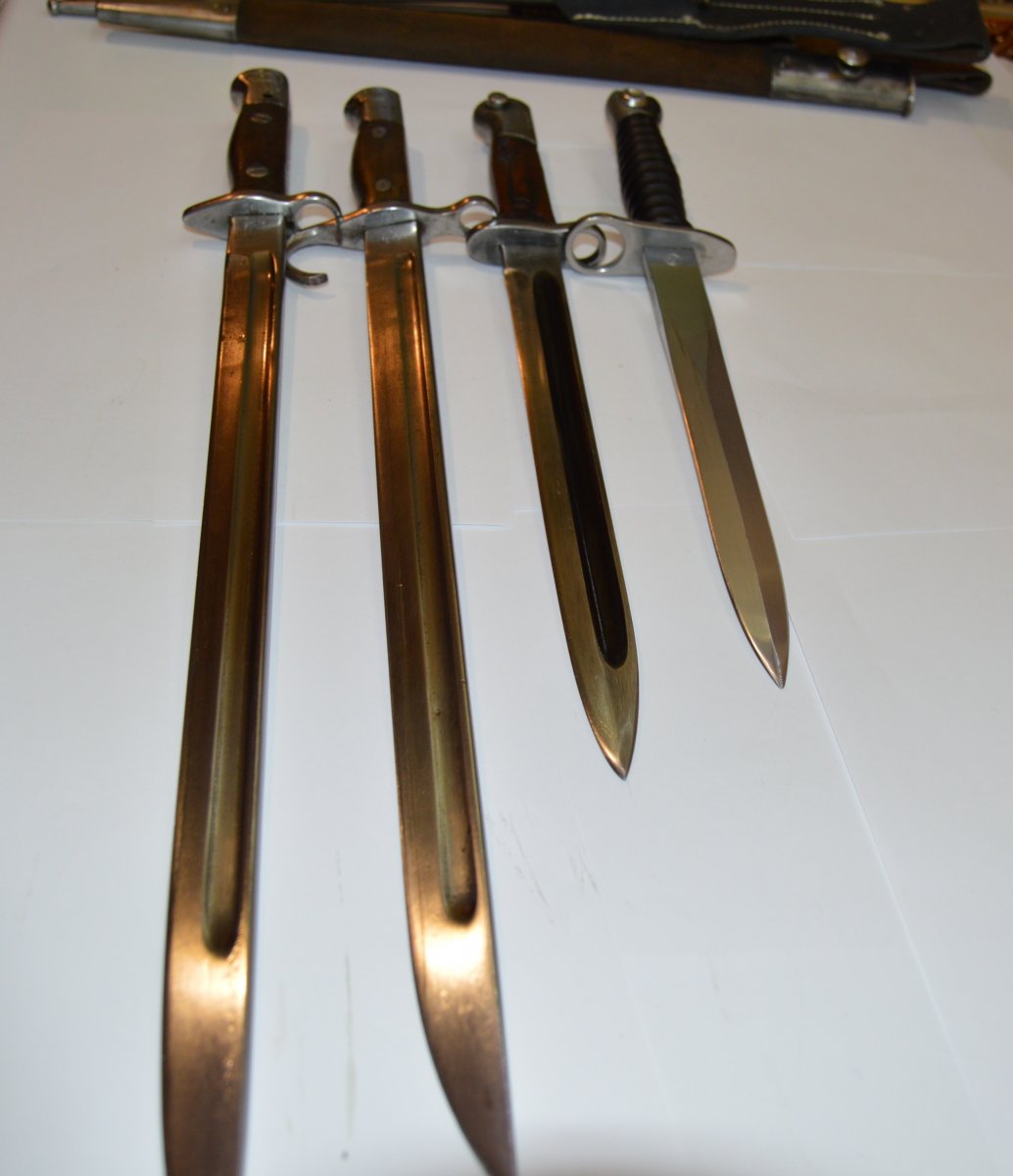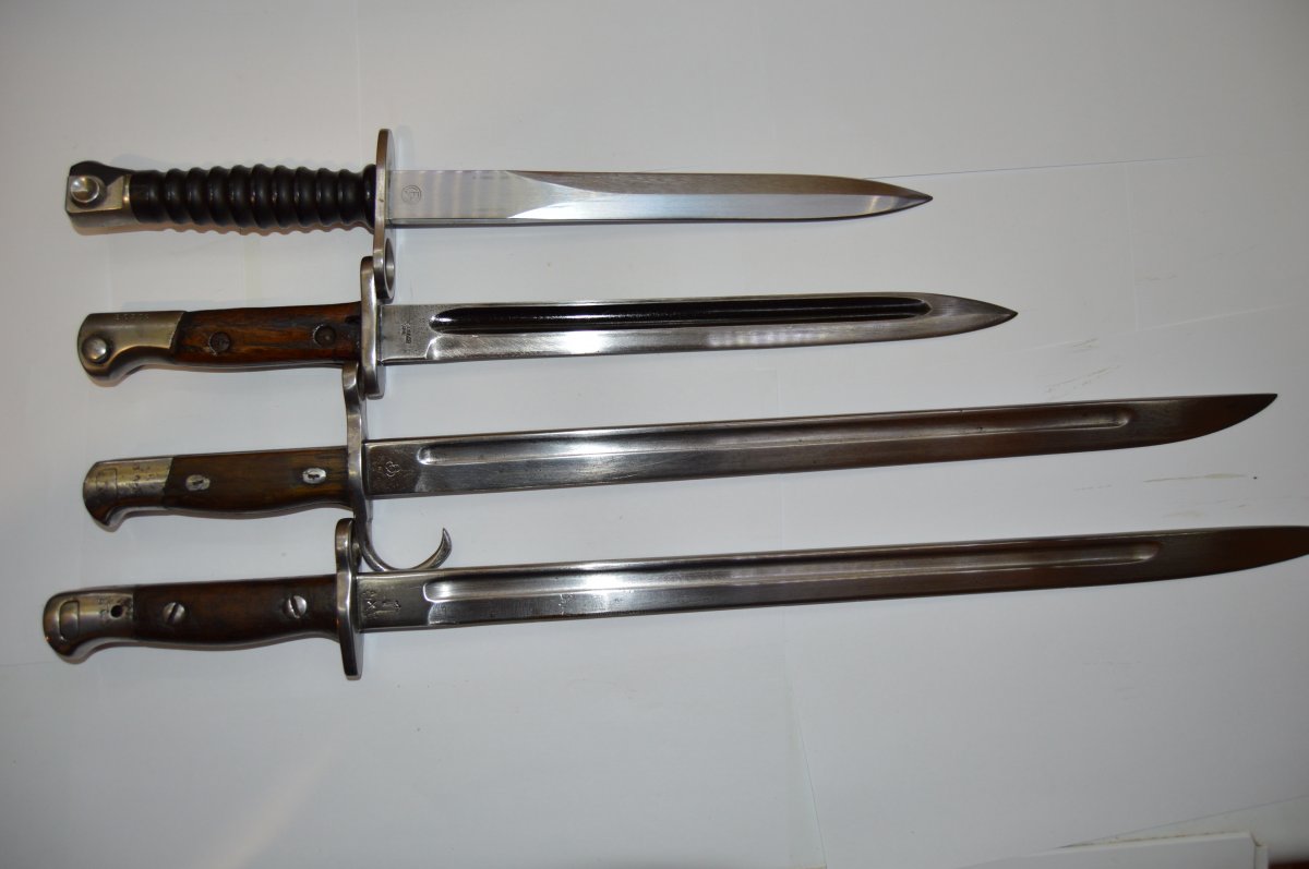 Продам штык-ножи. 1. Ли Энфилд 07 с удлинеными ножнами. Цена 6000 грн. 2. Арисака времен ВОВ. Цена 6000 грн. 3. Маузер К98 для Португалии 1905 года. Цена 4000 грн. 4. Швейцарец 1957. Цена 2500 грн. Цена за весь комплект 16500 грн. Состояние на фото. Вопросы и предложения в ЛС.