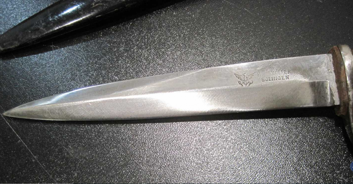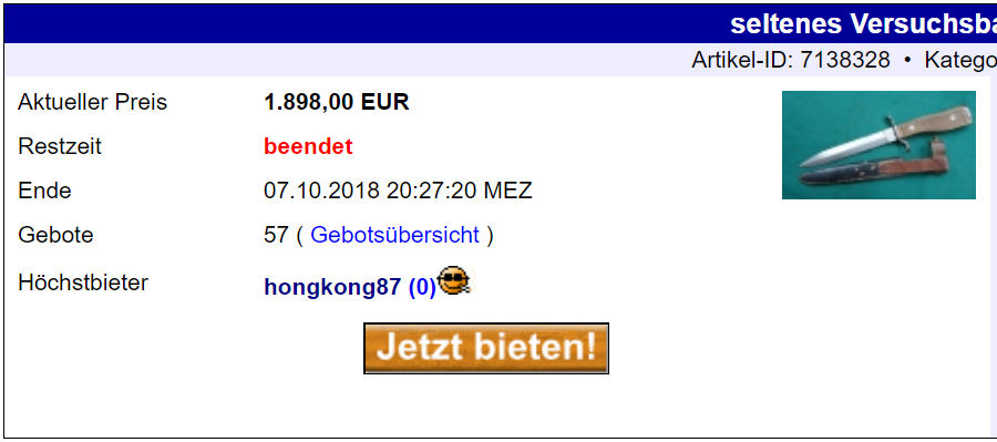 как вариант в Китай, всё может быть,, и тем неменее, сколько они не стараются, так у них ничего путнего и не выходит,. - Паралельно ещё несколько (с виду невзрачных) раритетов промелькнуло, которые так-же весьма удивили ценой (это что касается темы ножей). Grabendolch aufpflanzbarer HUGO KÖLLER - Solingen 1.222,12 EUR а так-же altes Deutsches Armeemesser WK1, EUR 683,90 которые на первый взгляд, как минимум должны были стоять в два раза меньше.