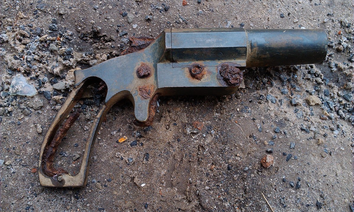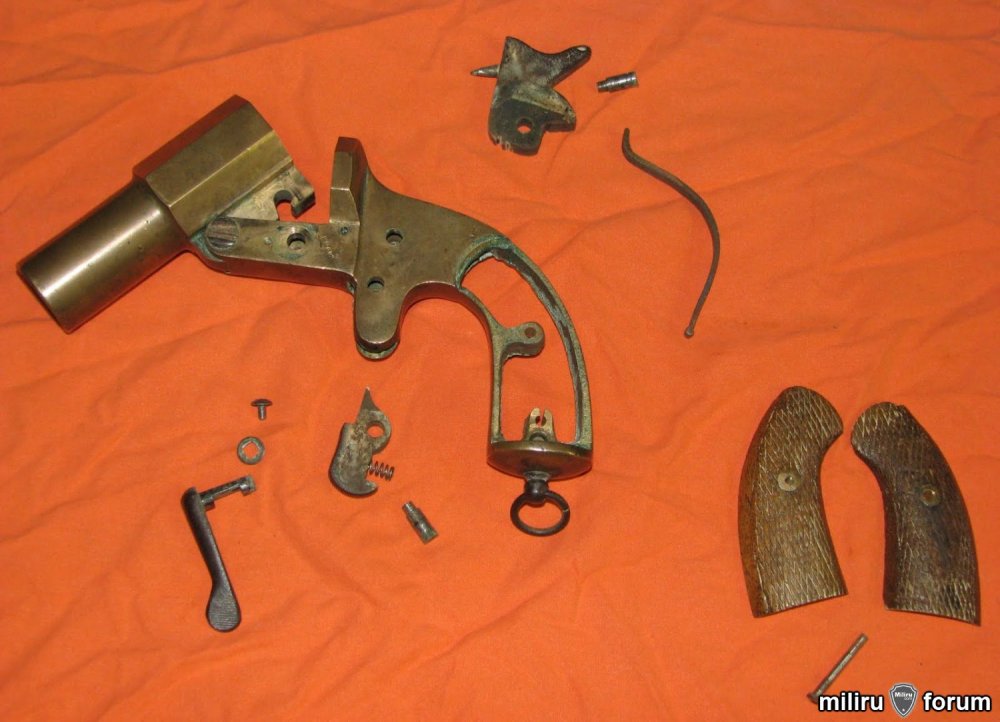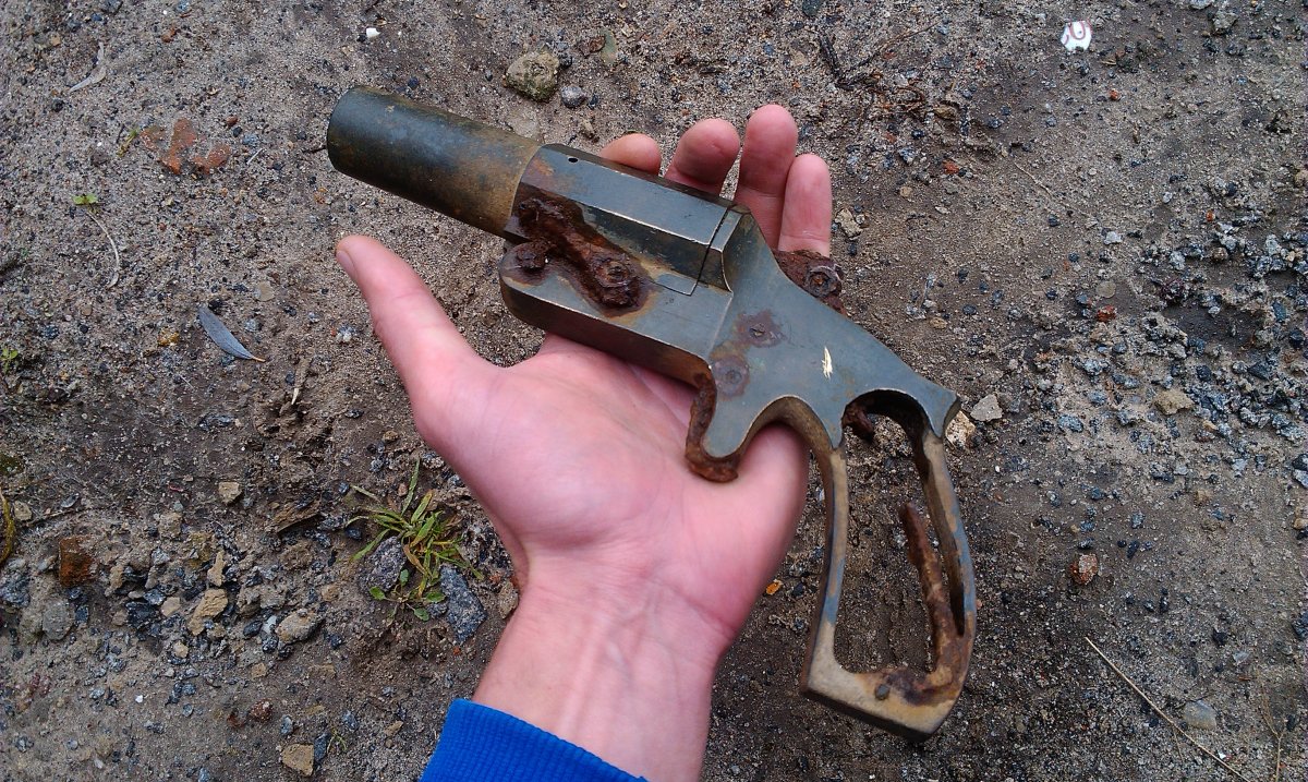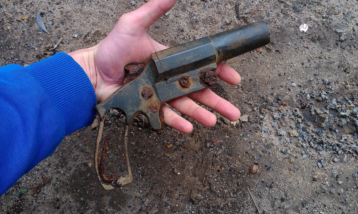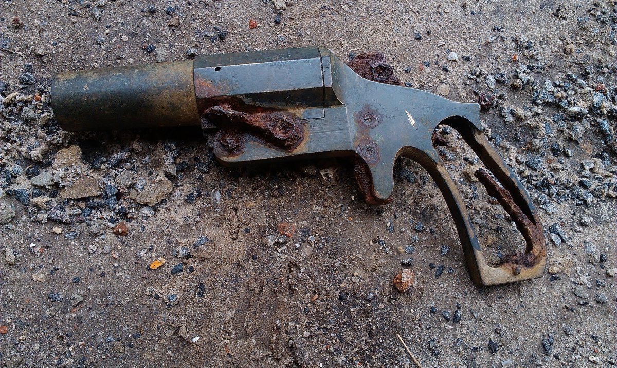 Добрый вечер. Посмотрите что было найдено в 2009 году http://popgun.ru/viewtopic.php?f=149&t=35772&start=210 (сообщение от 20.04.09 года время 18.06). Его так и не определили,хотя привели снимок интересного сигнального пистолета. ОЧЕНЬ ПОХОЖ на Вашу находку. А вот и тема по нему https://www.chipmaker.ru/topic/21789/ А вот и рисунок тульского сигнального пистолета, только чуть меньше Вашего в габаритах, а так тоже похож.