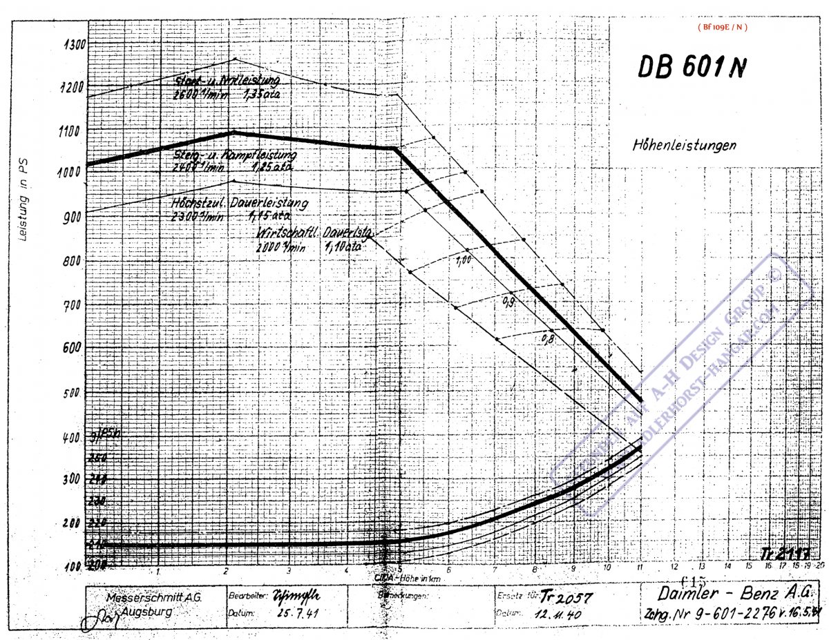 (+1) означает граница толлерантности/допуска (ну сами посудите в - (минус) Verdichtung то никак не может уйти)))) Я так понимаю это всё из LAH-Archiv, а у Udo там Leistungsdiagramm на 601N нету, или точнее заменена от 601А причом позней серии с уже заменой на новые Leitschaufel. Реальная выглядит так: Причом должен заметить, что N-Motor вышел самым капризным из всей 601серии. О чом собственно и поясняют множественные Anweisungen sowie Mitteillungen des technischen Außendienstes Fa. DB, или сокращенно А-ТА по части этого мотора. А его Ladedrücke in abgeschalteten Zustand lagen bei G=1,69ata f. Flugplatzeinstellung. По поводу ограничений, то на 601Е/605A их как таковых небыло, впрочим как и на всех немц. моторах. Эти т.н. ограничения взялись в восполённых мозгах плагиатов "зюзюлькиных, фазанофых, медфедей" да ижи с ними. Были т.н. рекомендации, которые и вошли kak Musterbrief в HB. Не более. Сами же тэсты моторов это и подчоркивают тем, что к прим. 601-605-603-610 и т.д. могли гонять на тэстстэнде до 50мин без выхода из строя. Потому все эти т.н. ограничения и прописали в НВ лиш давая рекомендацию пилоту, а не ограничивая его в действии реального времени/сетуации. Вот к прим. совсем недавно прочол в motorseitige Leistungssteigerung f. Fw 190 m. 801D (März 1944. SO-Archiv Bad Eilsen) об увиличении продолжительности Notleistungsentnahme с 10min до 20min. Что собственно тоже является лиш рекомендацией и не более.