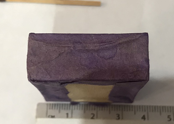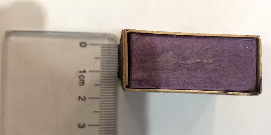Вітаю! Ось розмір коробки 1969 року: 5 см, 3,6 см, 1,5 см. фото трішки спотворює перспективу по відношенню до лінійки. 1980х років, розміри такі ж.