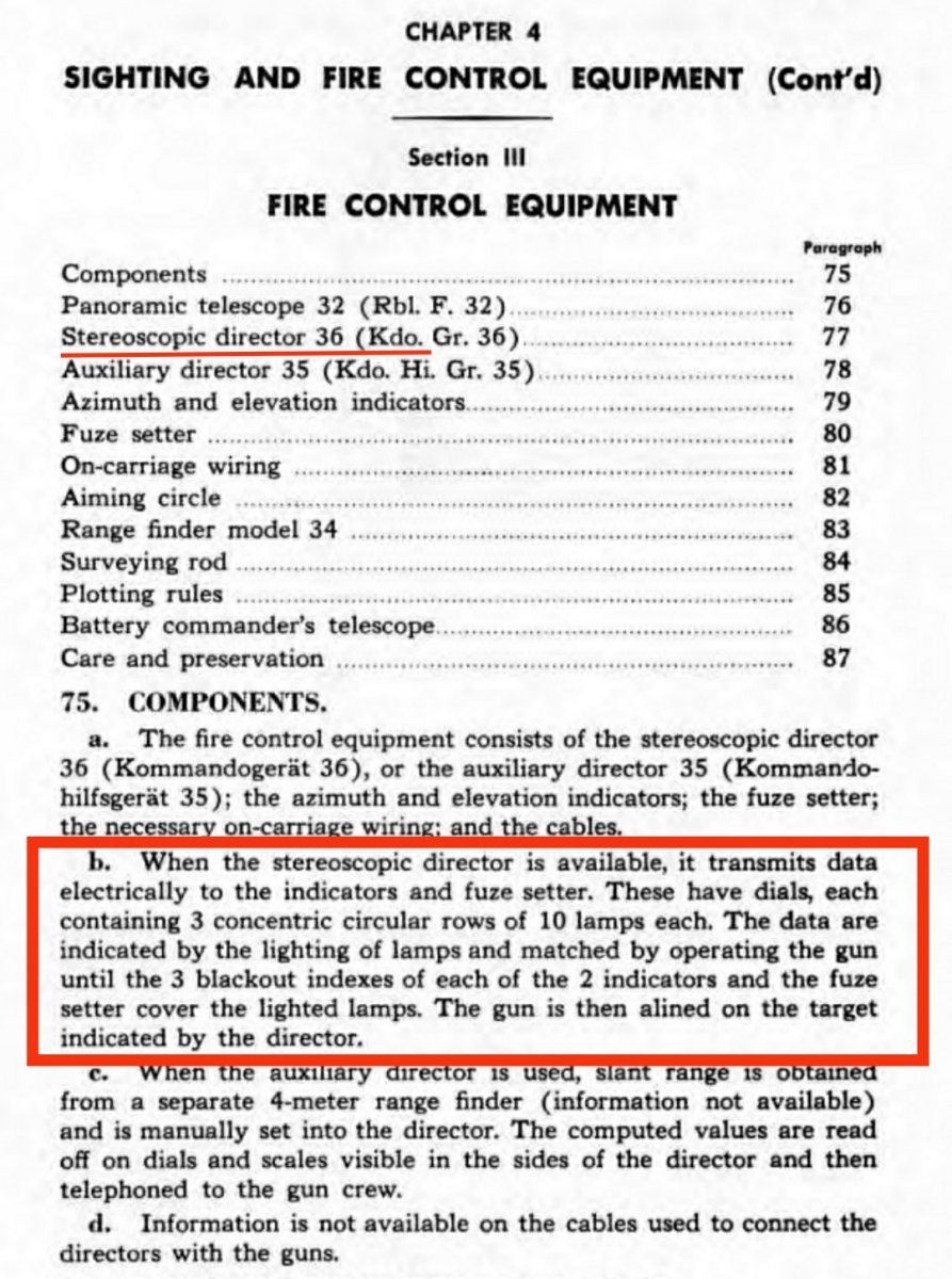 Мимо, НЕ зенитный прожектор. Советские документы требуют особого подхода. Люди которые с ними сталкивались прекрасно знают что информация в них очень часто "зашифрована" так чтобы не только вражеские шпийоны, а и свои не догадались о чём идёт речь. Но тем не менее они несут некую информацию. Человек который готовил это разведдонесение для штаба чётко всё разделил. Отдельно указал батареи МЗА, отдельно указал батареи ЗА, отдельно указал прожекторы, отдельно выделил эту загадочную СИСТЕМУ 3ОС. Значит в этом была необходимость, указать наличие этой системы. Узнать что это за система помогли немецкие документы. Truppengliederung der 17.Flak.Div.(mot.). В котором и кроется секрет той загадочной системы. Ней оказалась Kdo.Ger, KOMMANDOGERAT (прибор управления зенитным огнём). В нашем случае Kommandogerat 36. То что не 30, а 36 нет ничего страшного. В сообщении выше правильно указано:" то это же не технический отчёт, а данные разведки, особой точности требовать нельзя." Фото и общая информация о этой СИСТЕМЕ 30С (Kommandogerat 36)