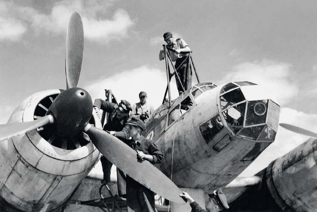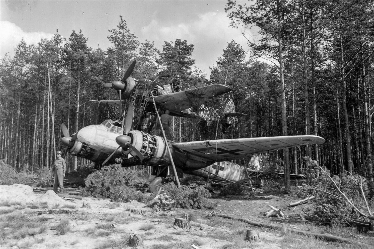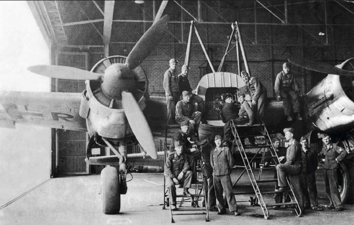 Послевойна. Середина 1945, аэродром Тирструп. Бригада механиков бывших Люфтваффе разбирает трофейный Ju88G из II./KG200
