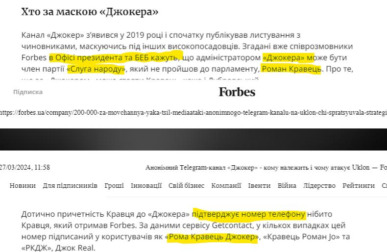 "Цілий "Форбс" написав, хто веде анонімну телеграм-помийку "Джокер". У повній відповідності до модусу вівенді нинішнього Офісу президента - це кандидат в народні депутати від "Слуги народу". Він на 153 місці в списку, і якщо когось зі списочників звільнять зараз -