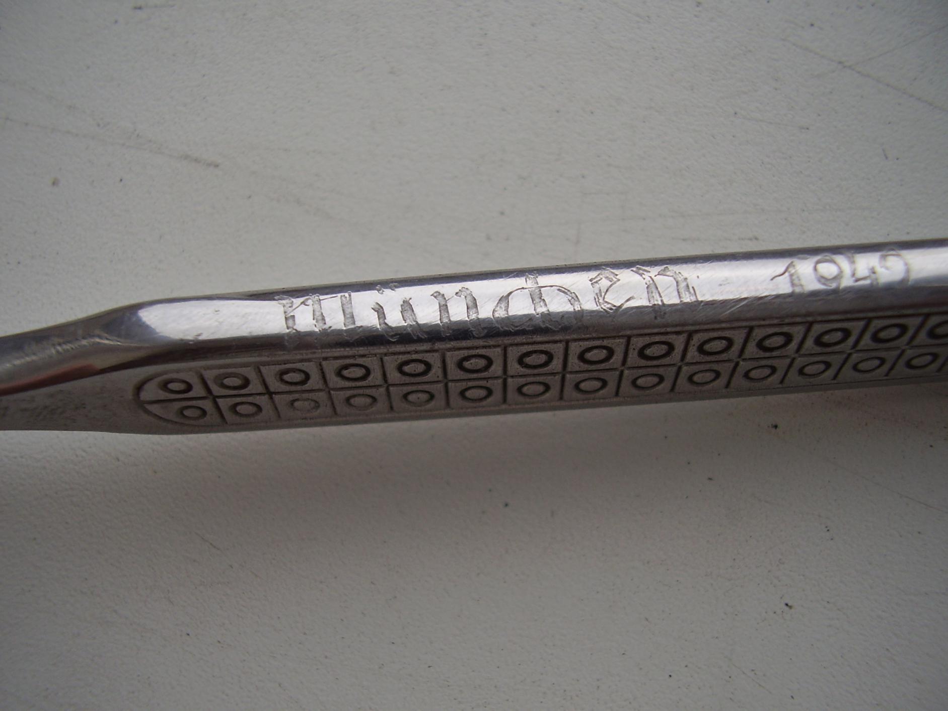 Длина 18 см, ширина лезвия у основания 2,5см. Меня также смущает рукоять с узором. На мед инструменте она не к чему, рисунок забивается грязью. Но как вариант надписи сделаны на память, слишком их много мне кажется. Ну и как вариант рукоблудие или дембельское творчество. По легенде приобретен не за дорого у населения.