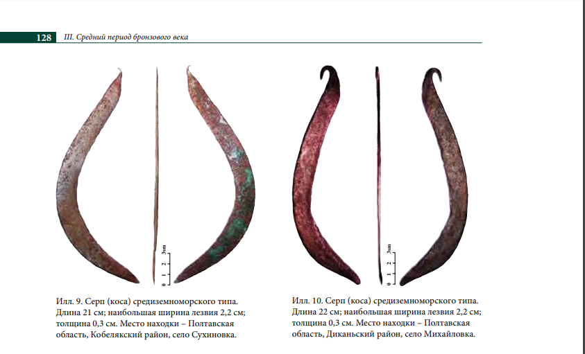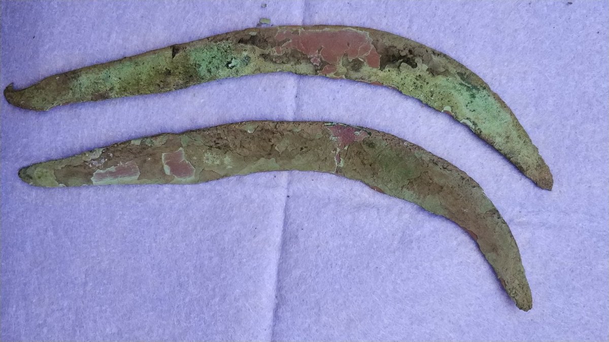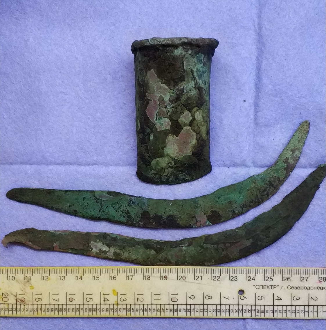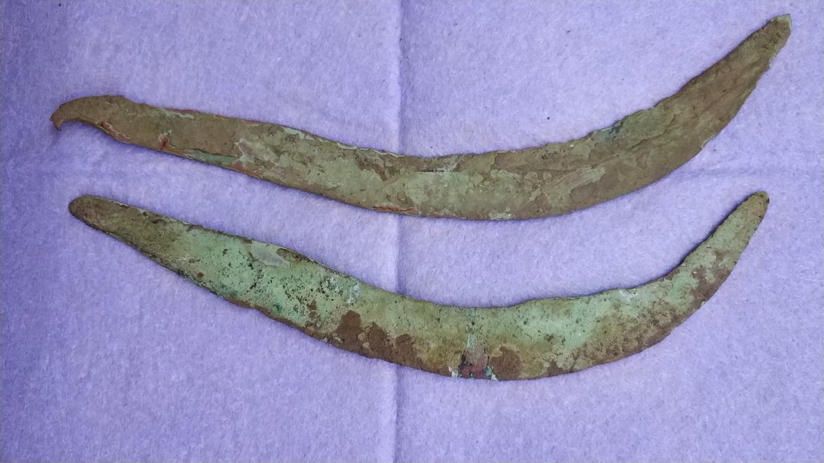 Здравствуйте! Недавно попался вот такой набор, все в одной ямке. Кто спец, подскажите, какого периода эти орудия? А то не понятно. Все называют их бронзовыми, а по факту материал практически чистая медь. Один серп я когда выкапывал, задел посередине лопатой и немного согнул. Руками металл очень легко выравнялся. Где нет патины - красно-коричневатый цвет как у меди. А медные инструменты вроде были у трипольцев, но их под Харьковом не было(где была находка). Хотелось бы определиться с владельцами И подскажите по цене, что оно может стоить? Спасибо