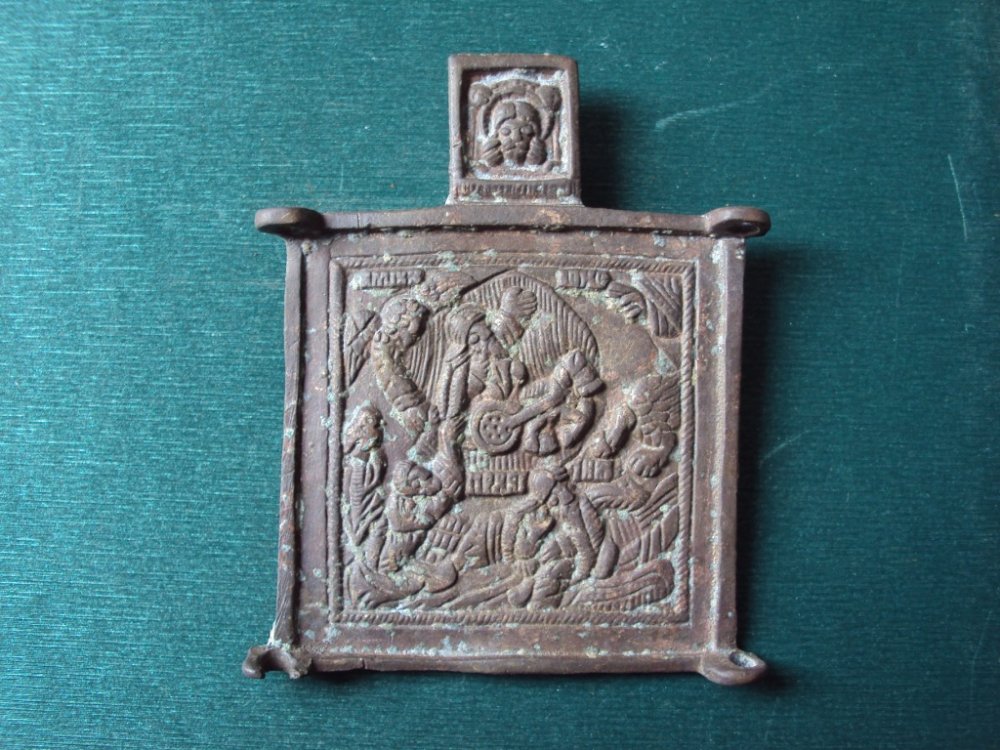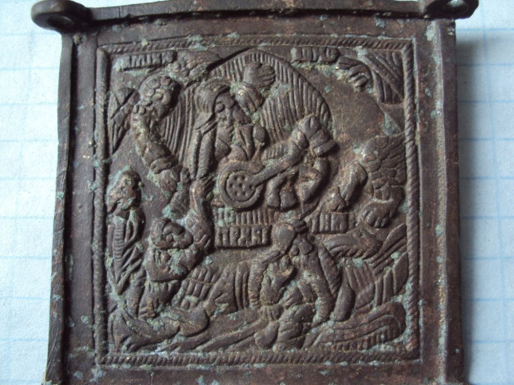 Уважаемые форумчане. Попался предмет, похожий на складень. Интересует каких времен и что за изображение. Всем заранее спасибо.