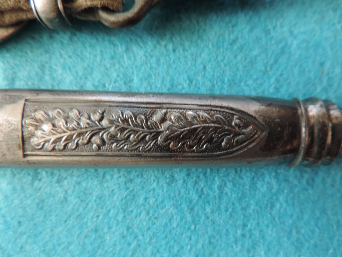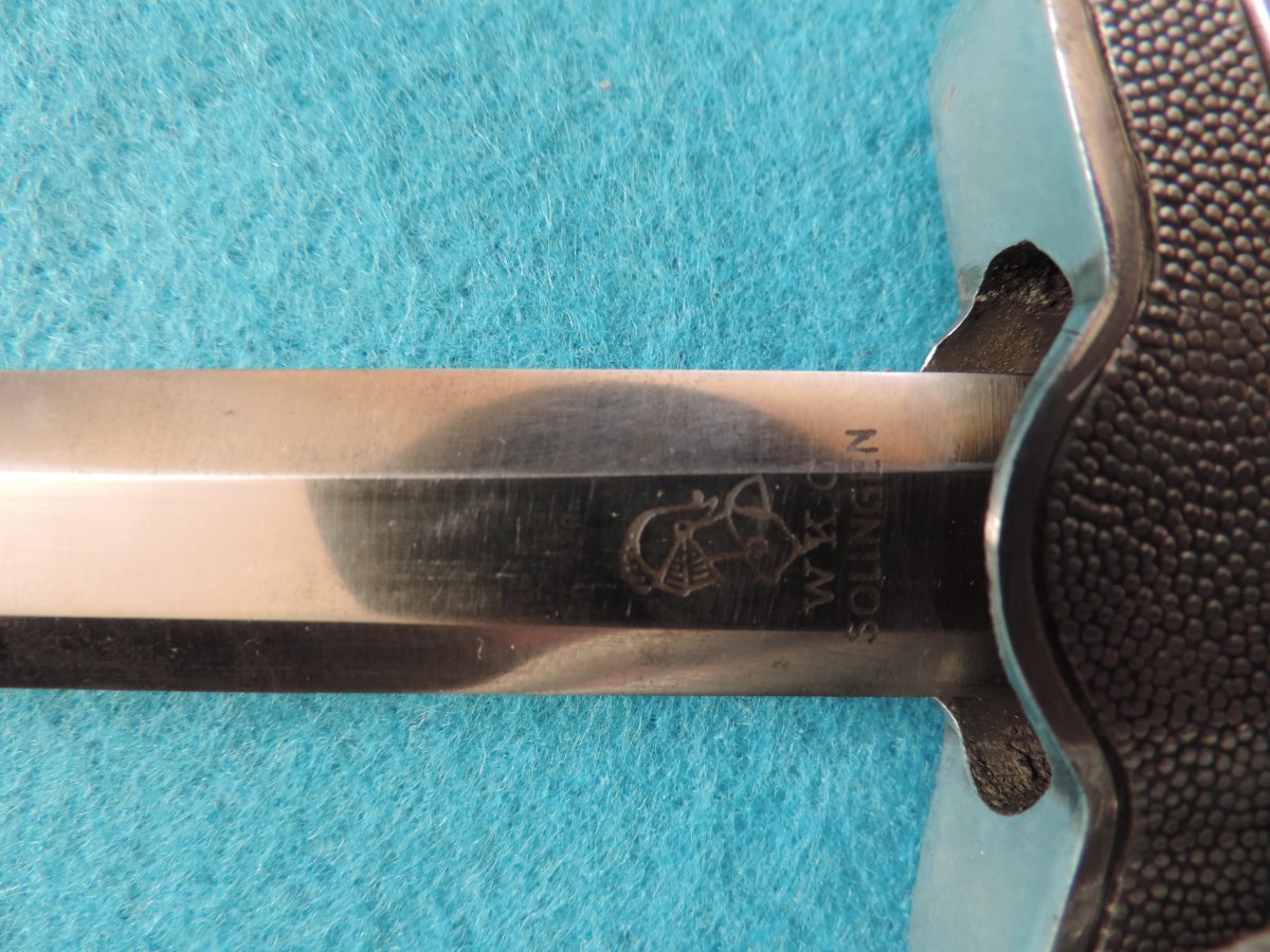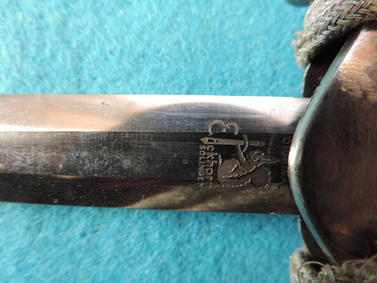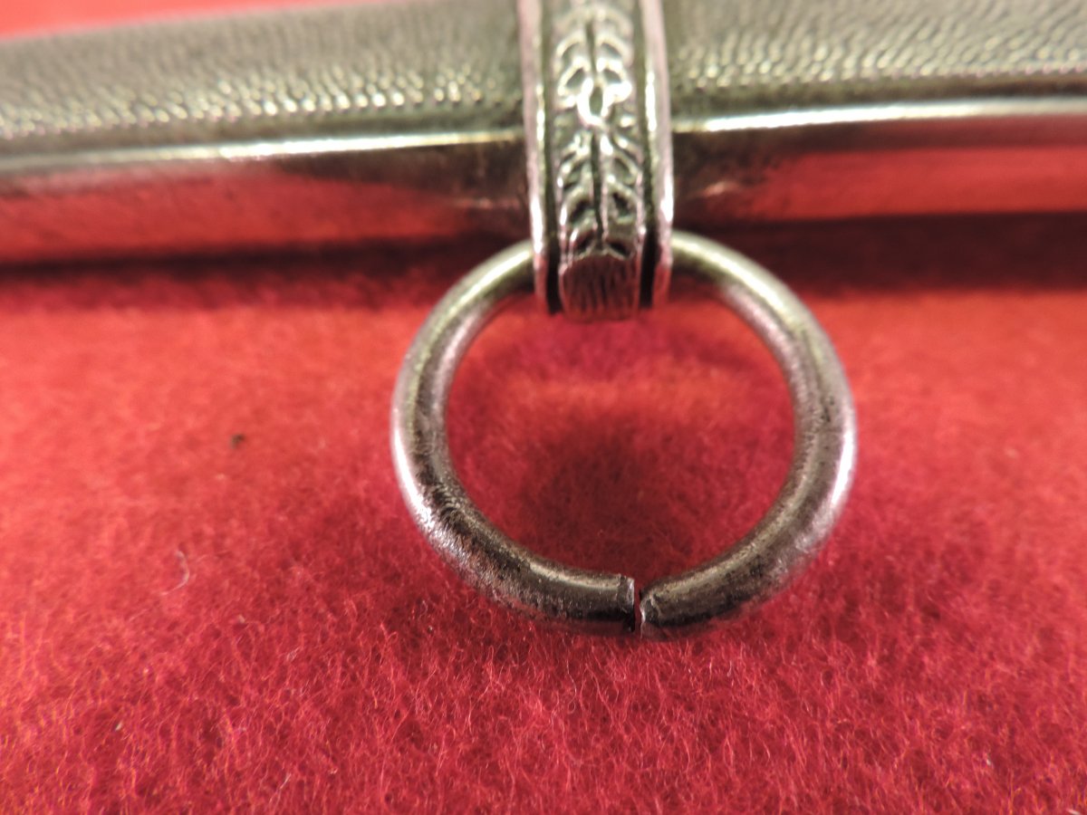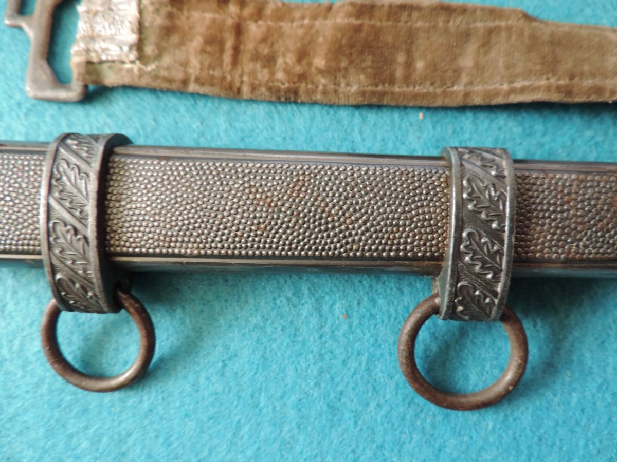 Не может... Это точно она! Цитирую Р. Зигерта. На одних и тех же ножнах встречаются идущие навстречу друг другу дубовые листья... Дальше. На ножнах познего периода про-ва устье запресованно, не имеет винтиков. Ну а так как "поздний", то и устье выточено "кривыми руками" - это норма.