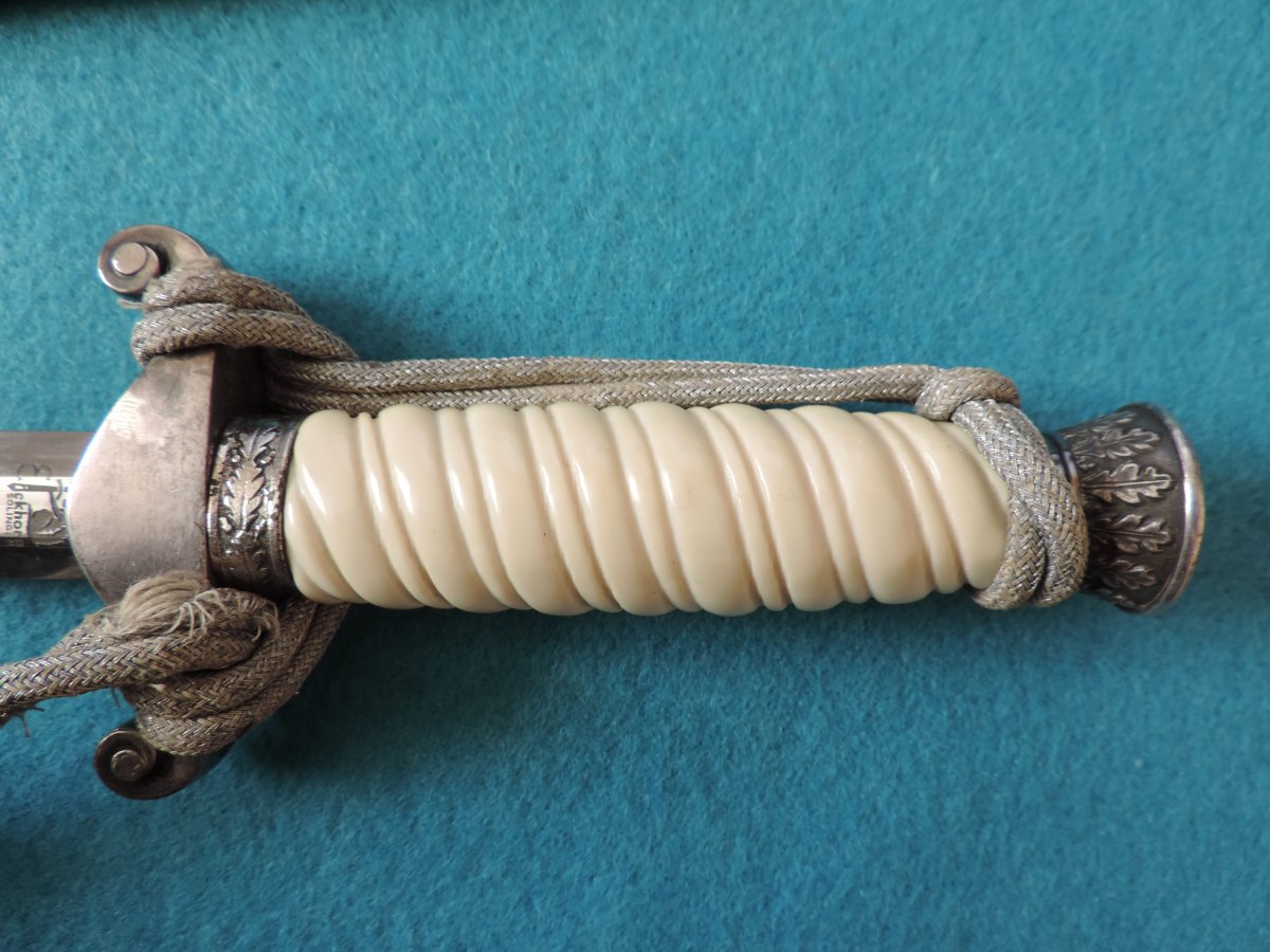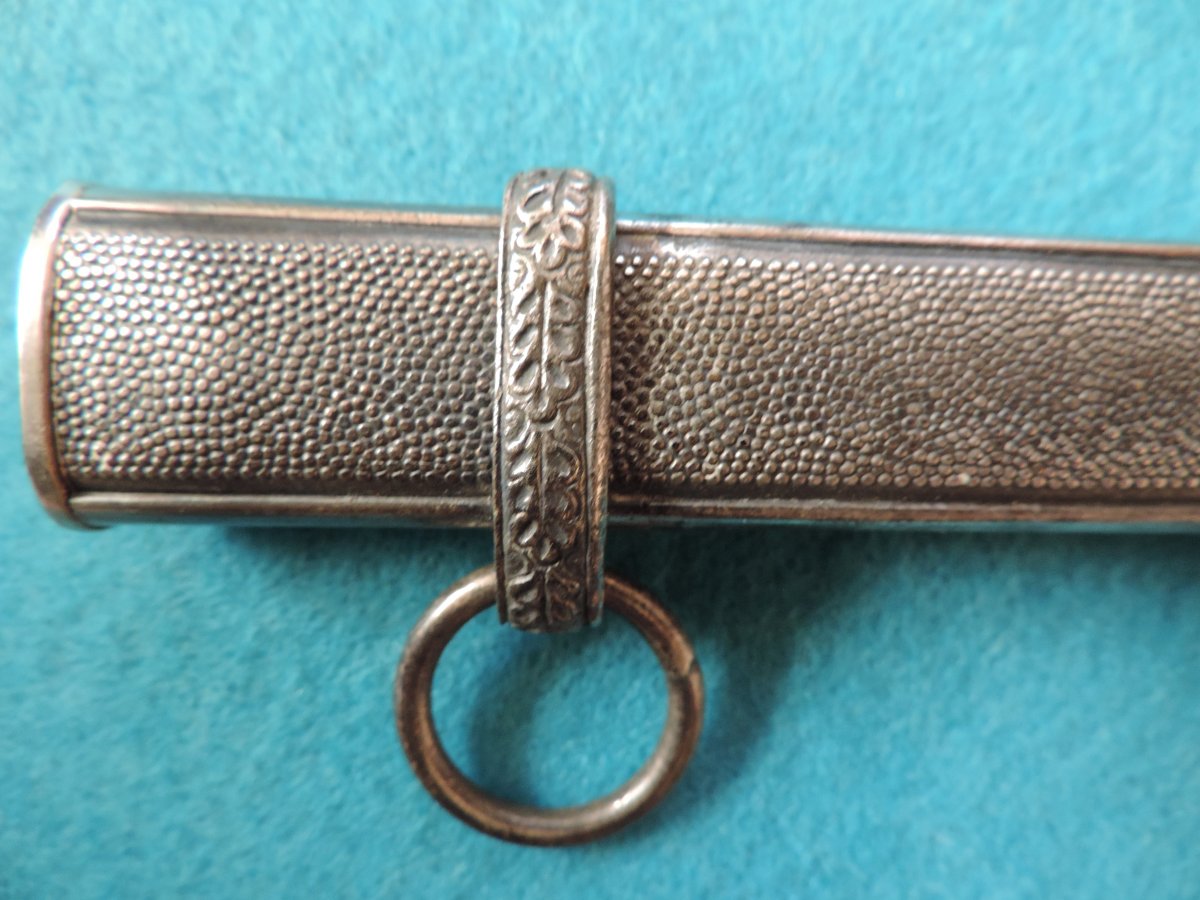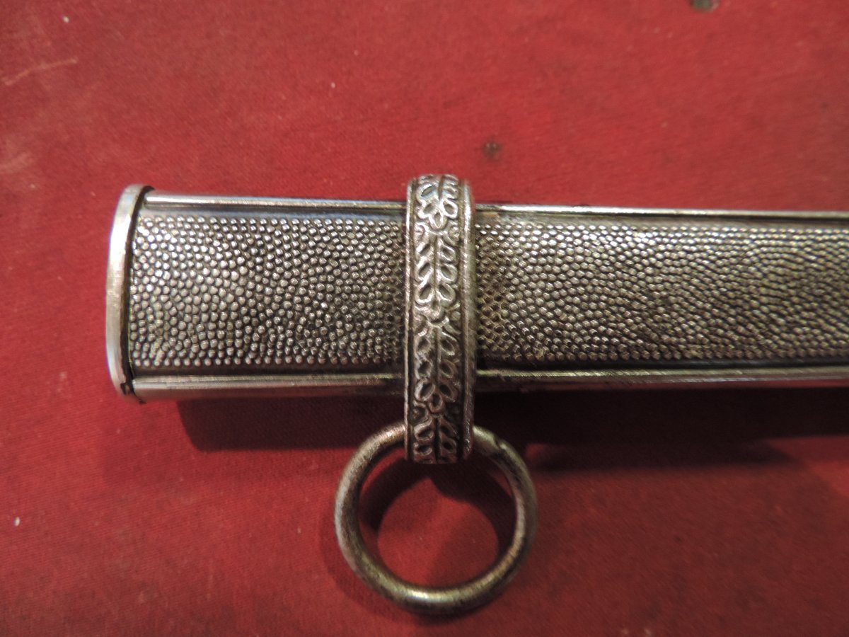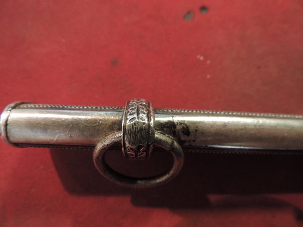 Не может... Это точно она! Цитирую Р. Зигерта. На одних и тех же ножнах встречаются идущие навстречу друг другу дубовые листья... Дальше. На ножнах познего периода про-ва устье запресованно, не имеет винтиков. Ну а так как "поздний", то и устье выточено "кривыми руками" - это норма.