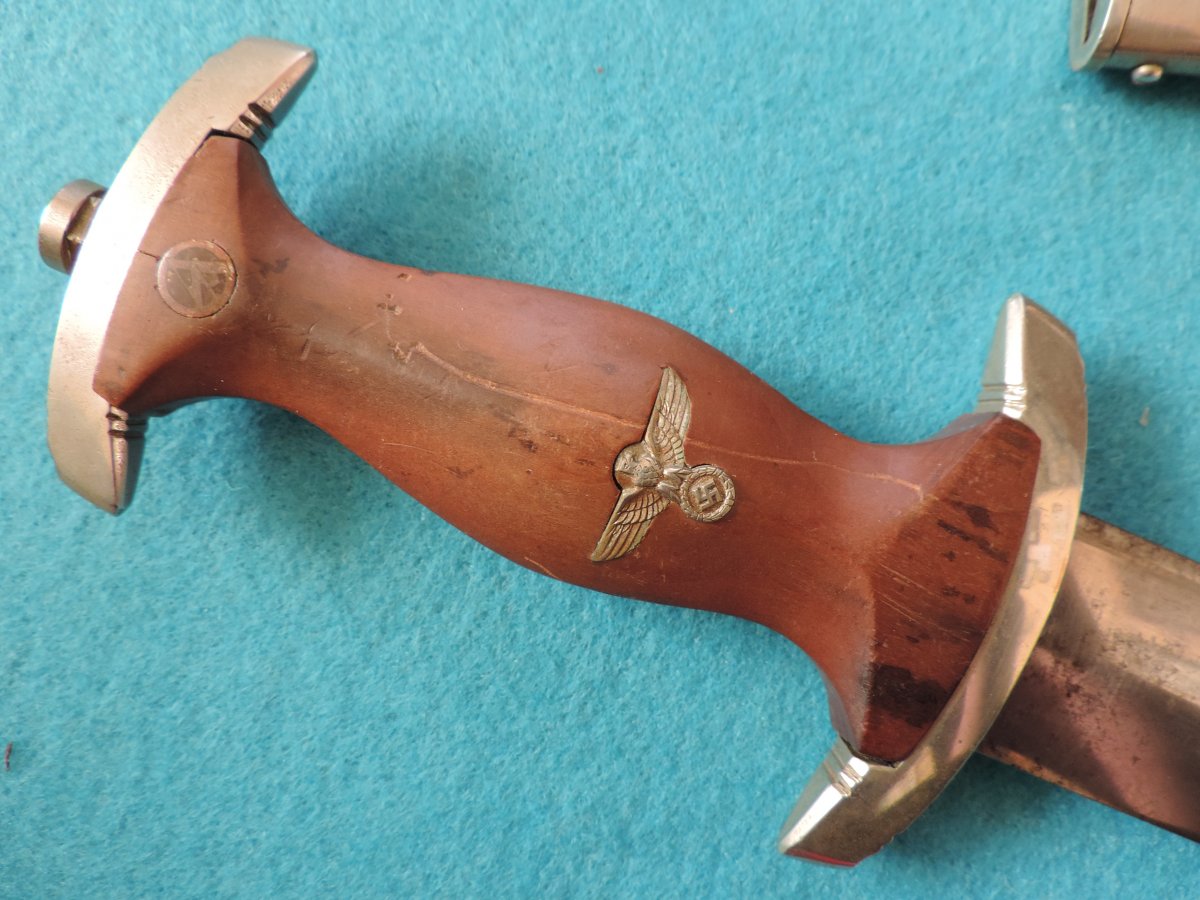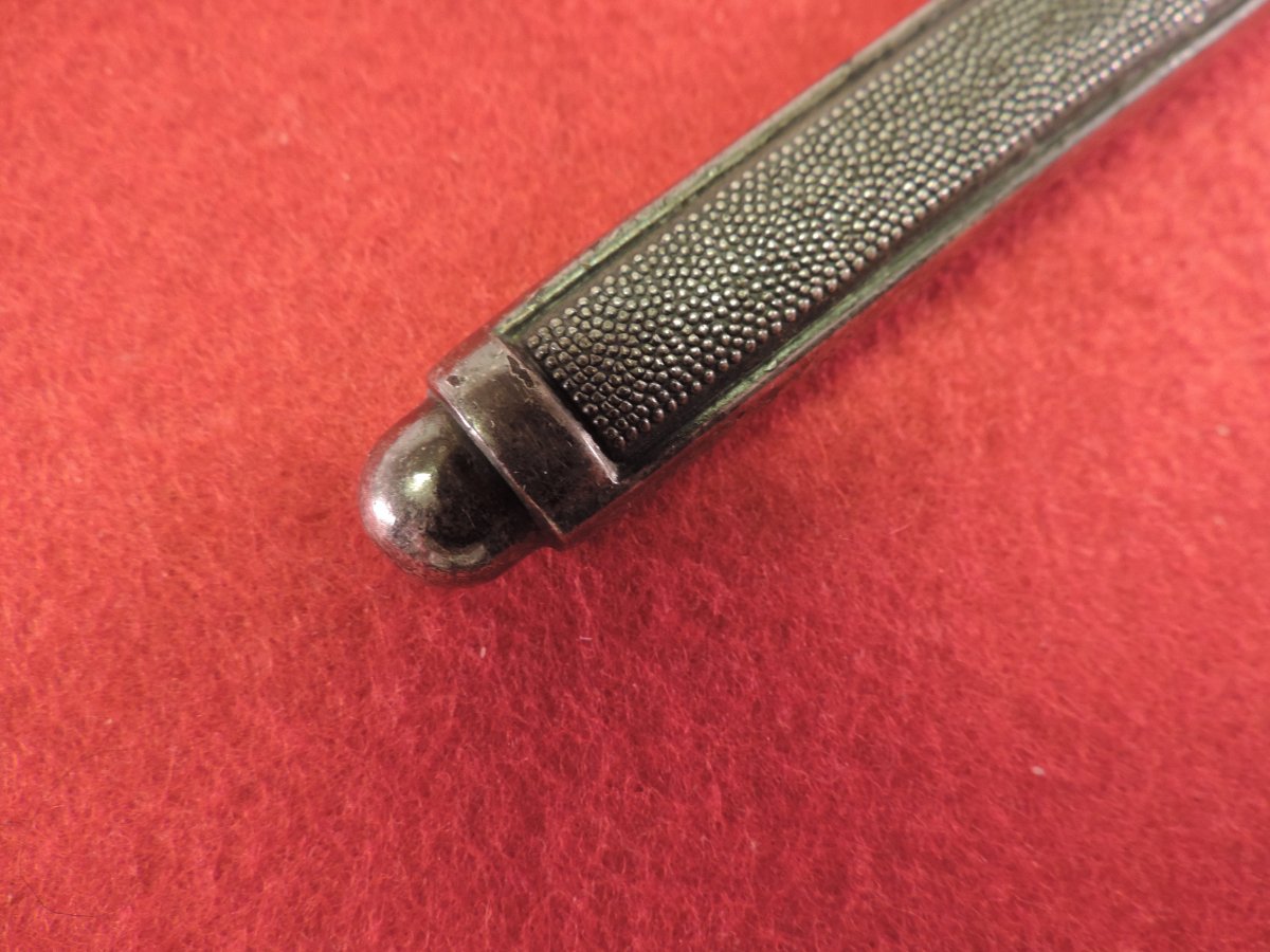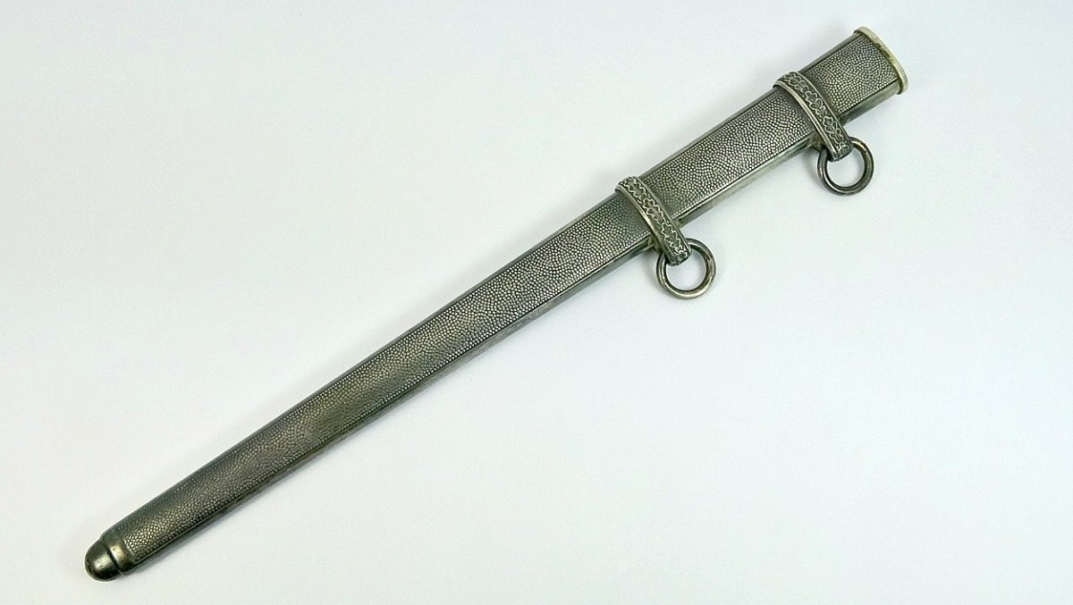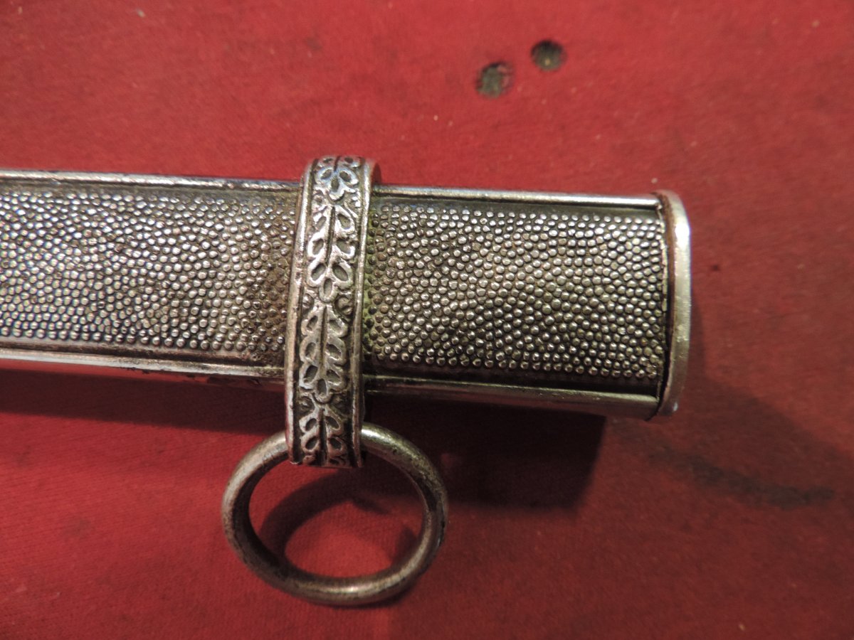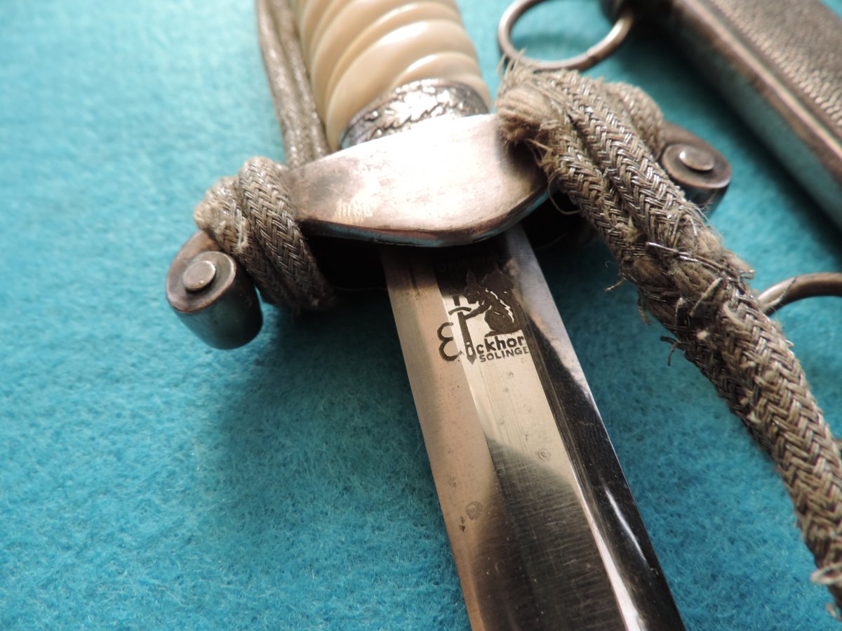 Не может... Это точно она! Цитирую Р. Зигерта. На одних и тех же ножнах встречаются идущие навстречу друг другу дубовые листья... Дальше. На ножнах познего периода про-ва устье запресованно, не имеет винтиков. Ну а так как "поздний", то и устье выточено "кривыми руками" - это норма.