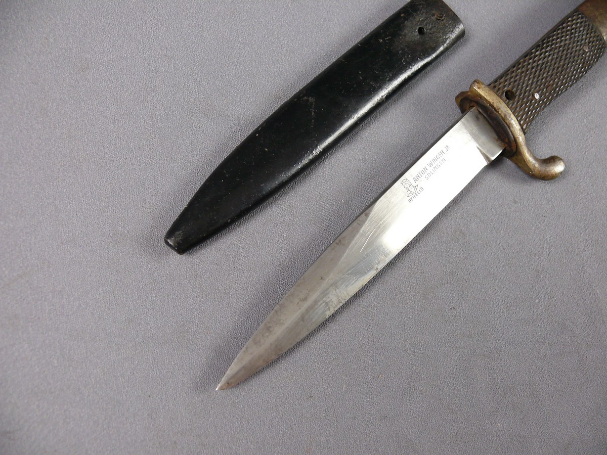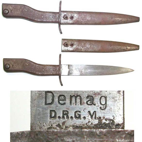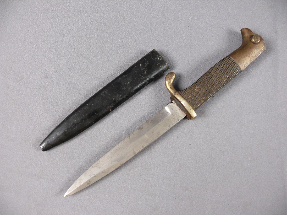 На данную ссылку сам попал случайно, мое мнение, что это какие-нибудь ребята с Арбата начала 90-х могут быть. которые новые иконы под 17 век чернили в бочках с огурцами. Немцы народ практичный и их изобретения мне как реконструктору не сразу бывают понятны. Нож или штык это нужно исходить из функционала, заложенного в нем. Или это красивый выпендреж фронтовой или нужен был молоток. Плюсом такой рукояти есть ее вес и можно как оглушить так и использовать по прямому назначению. Так вот отличие между ударом в дерево, например, между Глок 78 и укороченным 98м свиноколом есть. У глока перехват удобнее, а у К98 благодаря массивной рукоятке рука удар даже не ощущает. Удобнее когда без паза под штык или если он залит. У кого есть такой "курц парадник" попробуйте поманипулировать им- многое встанет на свои места. Дерево на простом окопнике для дешевизны и для того, чтобы меньше скользил в руке от крови (хотя это не помогает тоже), а тут попробуй потом очистить насечки. Еще смущают размеры 15 см лезвия- коротковато для примкнутого штыка. Исходя из разборной конструкции- могли лепить из того, что есть или пожеланий заказчика и это больше нож, которым неважно куда бить.