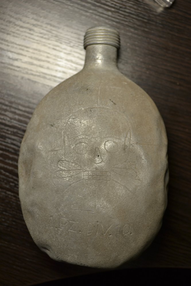 Сколько стоит фляга Вермахта? Сохран чердачный. Клеймо ZSB 42. Нацарапанная аббревиатура 1.Pz.Div.10. и мертвая голова. Колба мятая, но не течет.