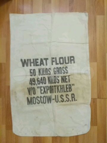 Вот пример надписи на таком мешке (как утверждает продавец, начала 80-х) - https://19.img.avito.st/image/1/Eubb6Layvg_tQXwK8_xQr0tLvgl7Sbw, а это - https://54.img.avito.st/image/1/s9FvXrayHzhZ6Z01BTTi6Jj9Hz7P_x0 - "Довоенный экспортный мешок V/O Exportkhleb из под пшеничной муки... РЕДКАЯ ВЕЩЬ!" без указания года "рождения".