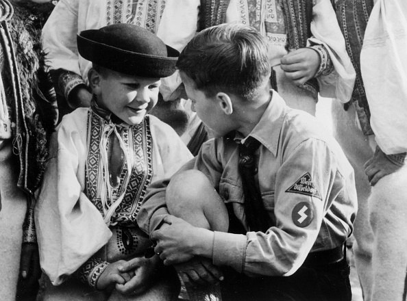 1) Soldaten mit Frauen Kinder in Tracht Bevölkerung in Jugoslawien 1941 2) Soldaten mit Bevölkerung Kinder Frauen in Russland Ukraine 3) Soldat b. Schneiden Haare alte russische Mann Bevölkerung Russland
