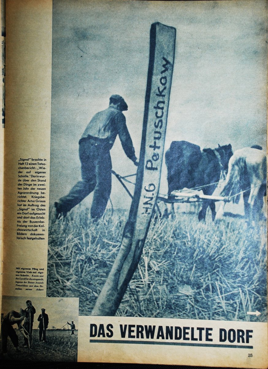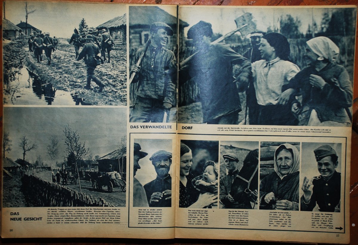 "Сигнал" Выпуск 2 за сентябрь 1941-го Комментарий к фото на обложке "Крестьянка освобожденной Украины крестит своих детей у немецкого священника из Вермахта". Но тут важно не столько это, а название этому фото, что дали немцы, размещая на обложке журнала (немецко-итальнский вариант, кстати). Оно размещено левее комментирующей подписи. Его можно просто перевести как "Возвращение к религии". Но есть одно но: в самом слове "возвращение", ибо на самом деле то слово, которое применили немцы имеет свою особую смысловую нагрузку. Это не просто "возвращение", для этого можно употребить слово Rückkehr, но здесь слово Heimkehr! Если посмотреть словарь, то мы узнаем, что оно означает "возвращение домой, на родину". Это от слова heim, от которого и происходит слово Heimet - Родина. Само же слово аналог оборота "nach Hause" - домой. От него же существительное Das Heim - родной очаг. Похоже немцы чувствовали, понимали, где может обретаться настоящая Русскость, с чего она начнет возрождаться для тех, кто не умер Душой, почему и употребили это слово, а не какое-то другое.