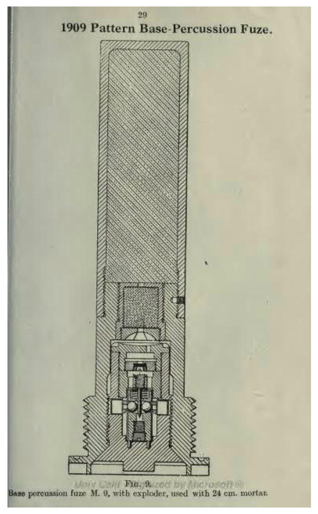 Он (донник) там и есть. Калибр (если верить схеме) у Вашей находки 10,4сm, а не "просто" 10cm. Т.к. у "10" донник скажем так открыт для обозрения (фото №№ 2- 4), а 10,4cm может быть закрыт привинтным дном "выпуклой формы" (такой же формы привинтное дно можно увидеть и на ряде 15cm снарядах). На схеме 15cm снаряда (фото №№ 5 и 6) приведено ДЛЯ ПРИМЕРА как там крепиться дно и донник. Думаю (но Х.З. честно говоря) в снаряде стоит М9. Вроде всё что есть, выложил.
