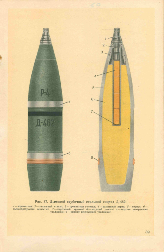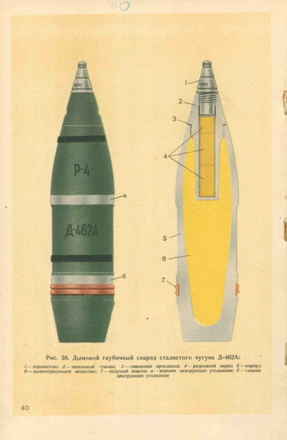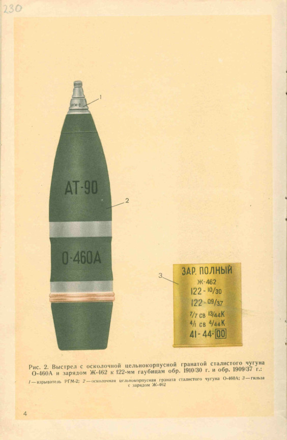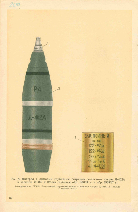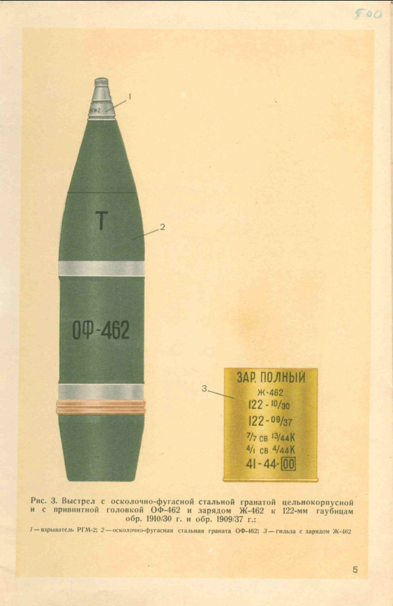 РККА. 122-мм осколочный либо осколочно-фугасный. В голове установлен РГМ-2 (99 %). ВВ внутри в пределах 3,5 кг. Кстати, снаряд может быть и дымовым! С начинкой в виде фосфора (что ни есть хорошо) и разрывного заряда ВВ в 160 грамм. Вот "460-ый" и "462-ые"