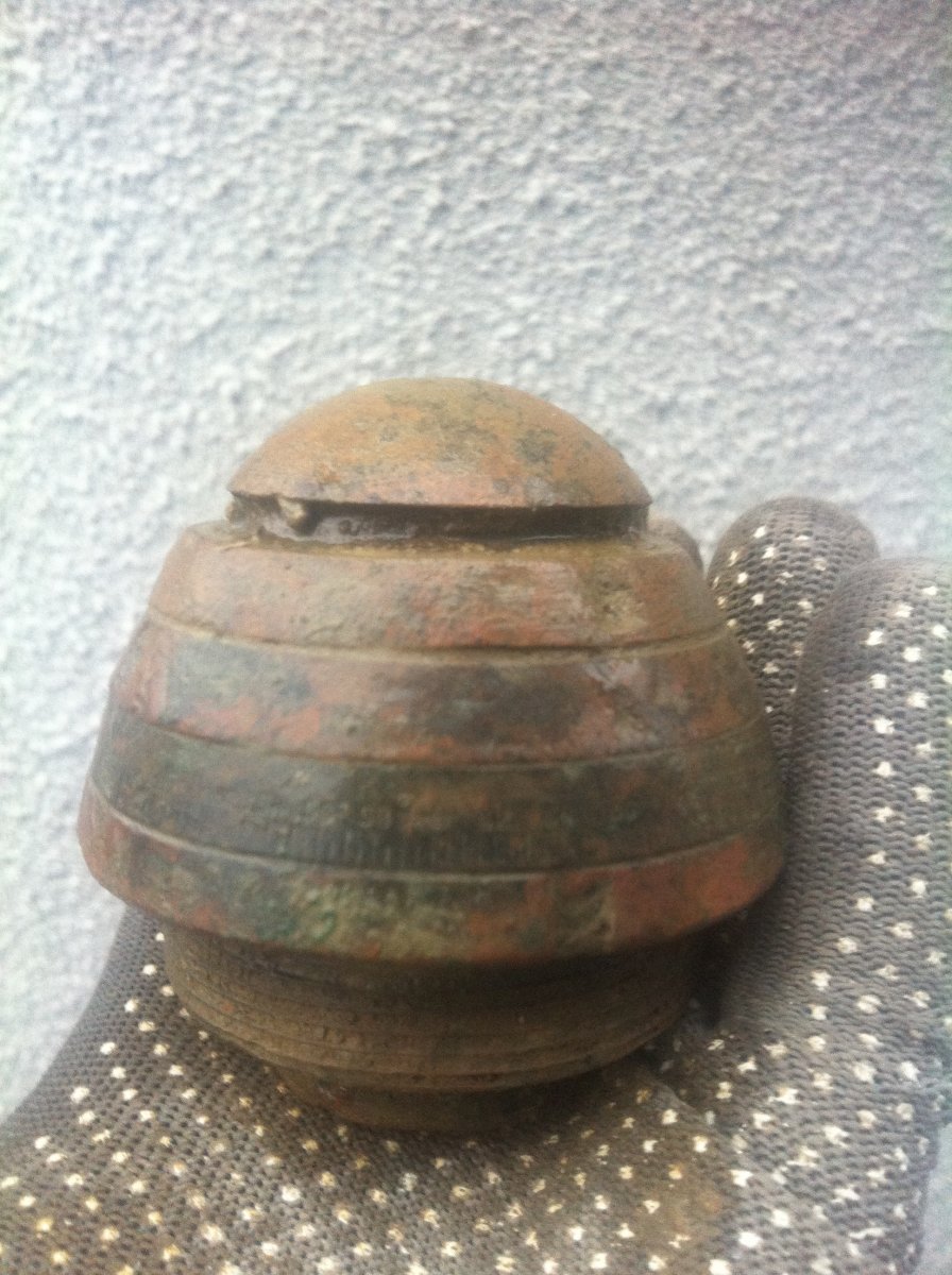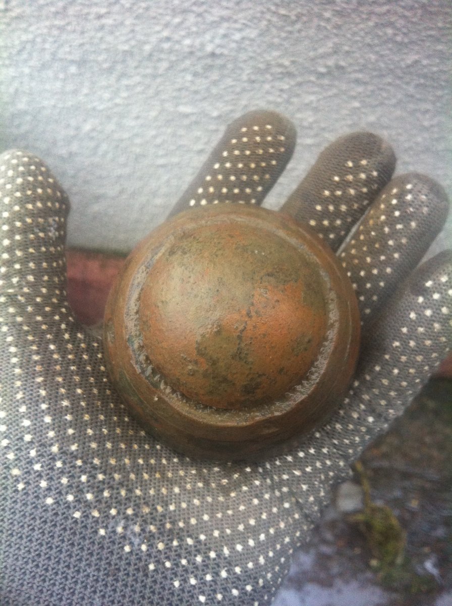 Добавлю еще одну голову по тому периоду. Насколько, понимаю, это с российского шрапнельника. Удивительно, что с песка такие попадались с гнилым алюминием, а эта, с земли, более-менее хорошо сохранилась..