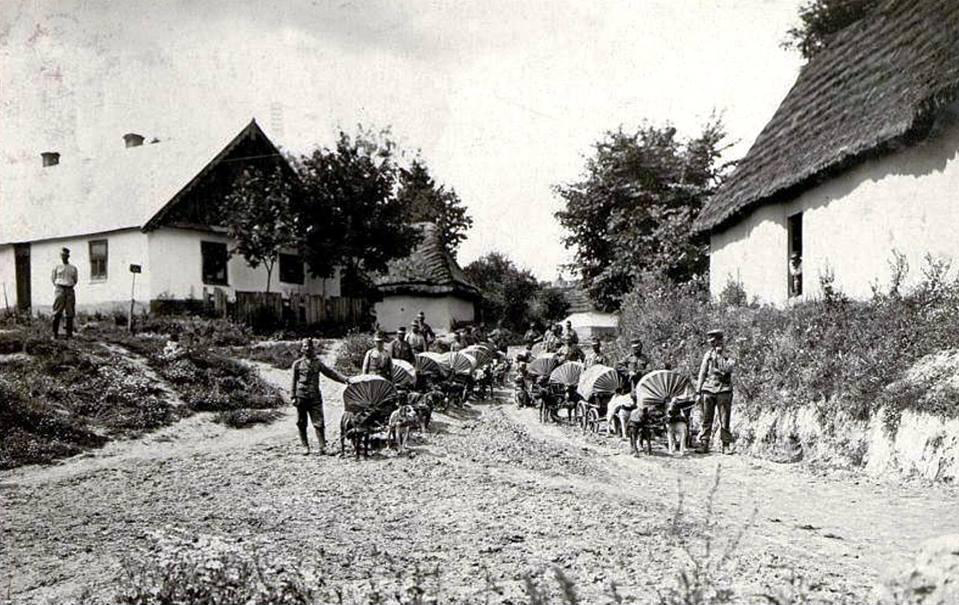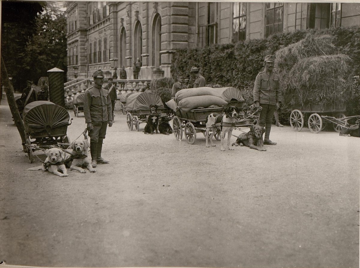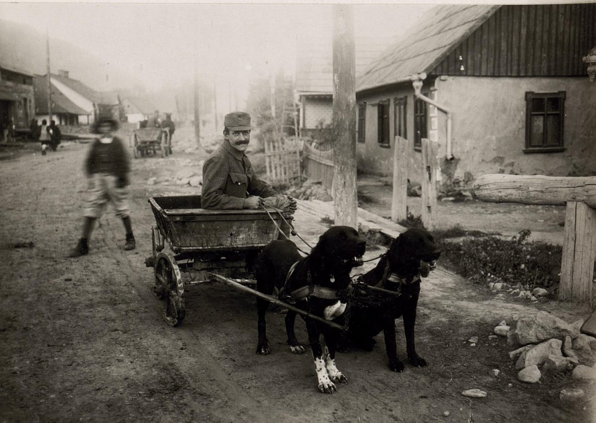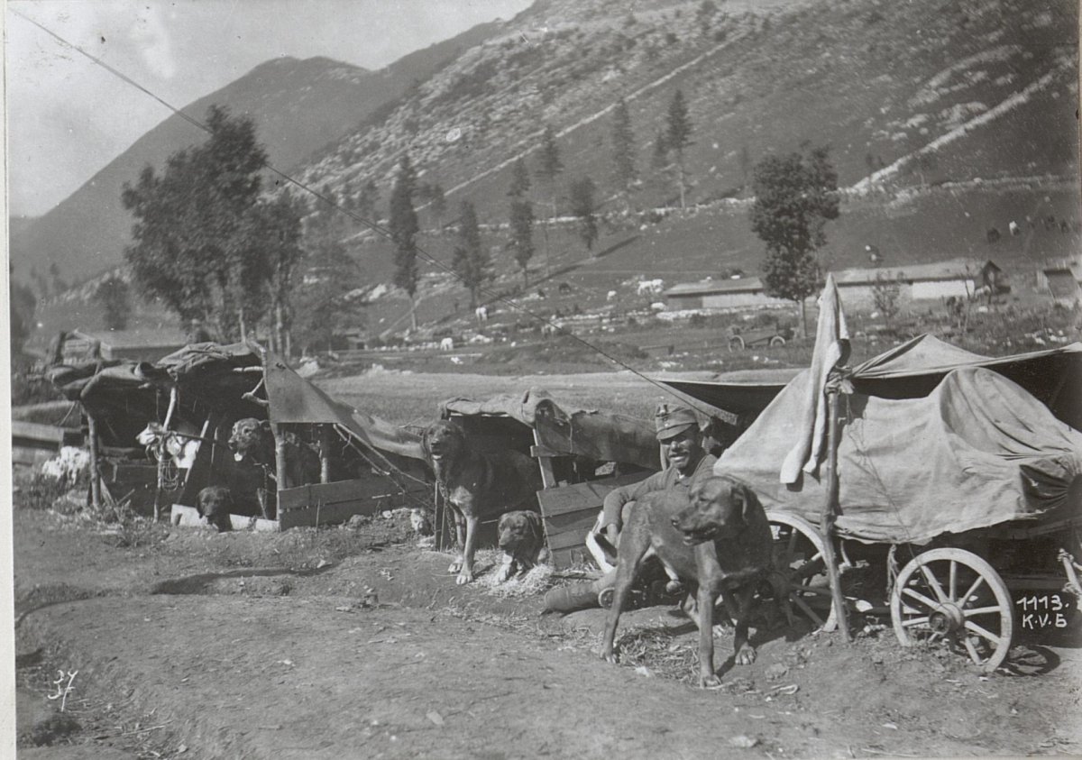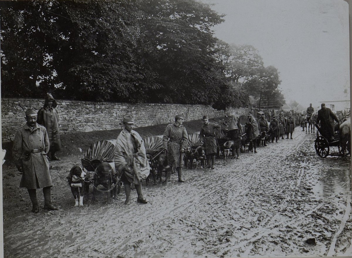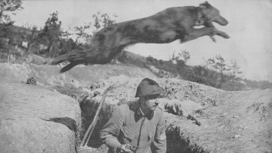 (Собака несется с донесением из штаба в германские окопы. Западный фронт, 1916 год.