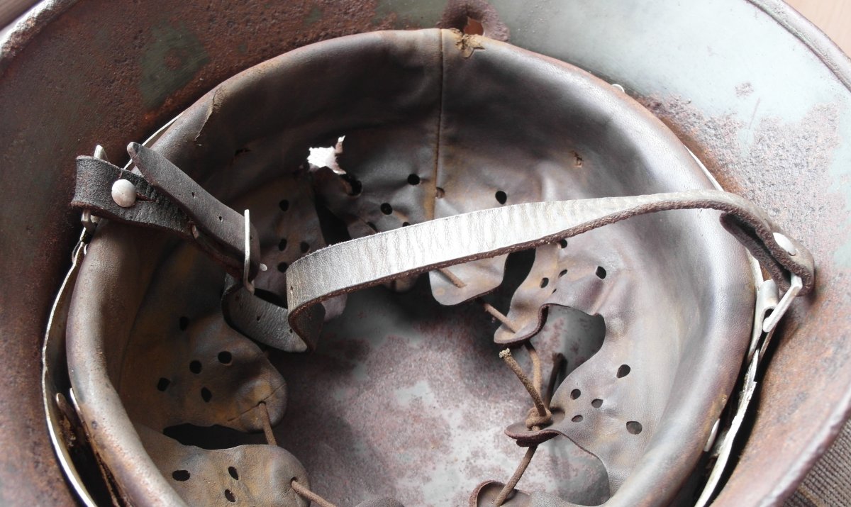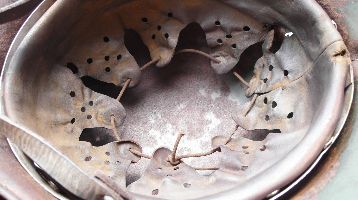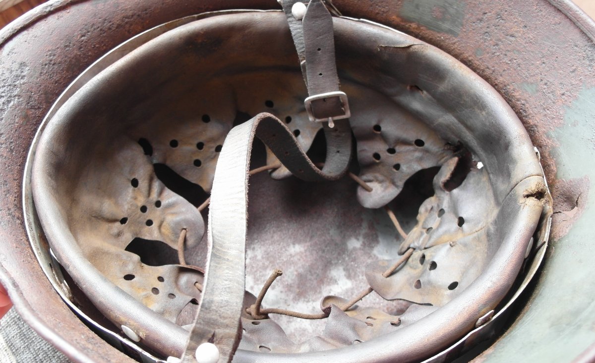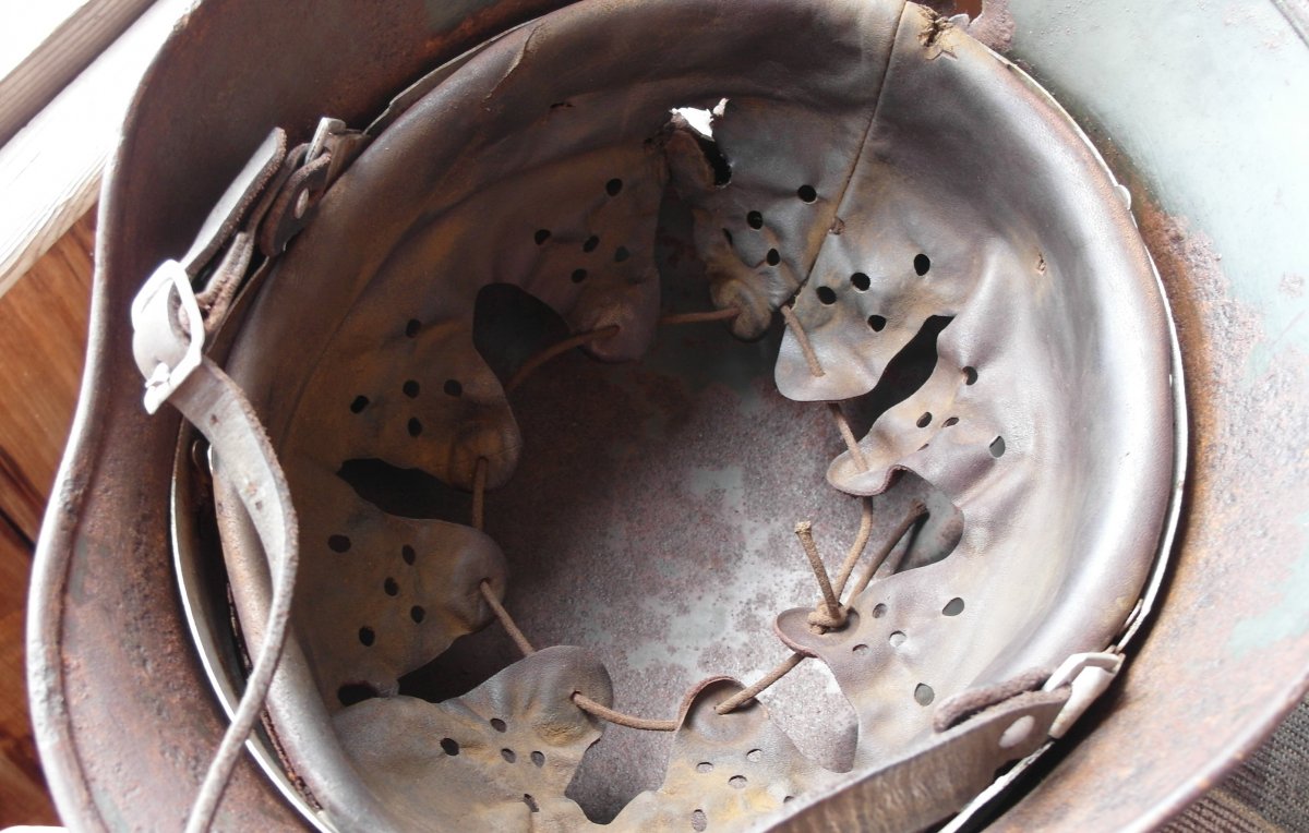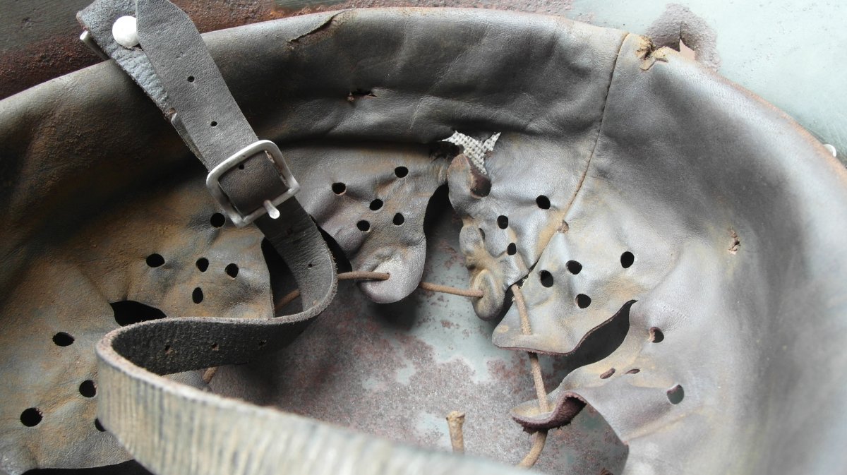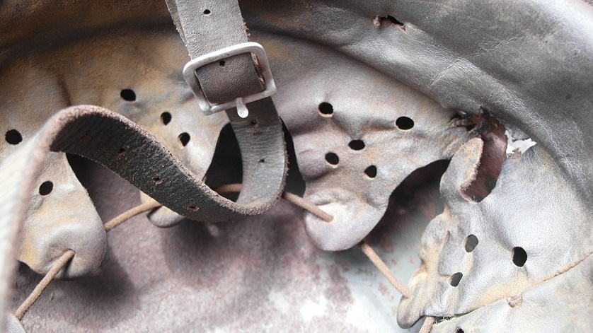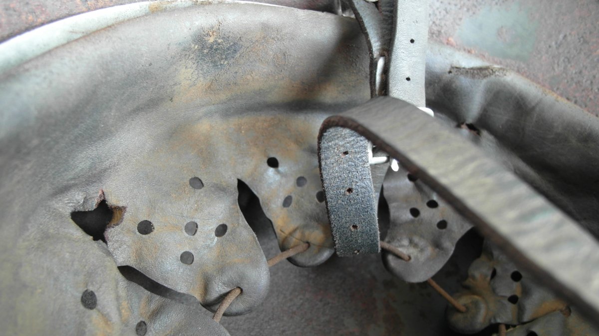 Кожу можно старить под домашний сохран,под чердак и т.д..Я застарил под копанину с осколочными попаданиями. Хоть и кожа была не лучшего качества,тоненькая очень,получилось хорошо думаю.Если бы еще и кожа получше была......В руках держу,прямо как копанная из земли,не разобранная.Точно как я и хотел.А то не смотрится когда на копанину ставят кожу новодельную не соответсвующую по виду.