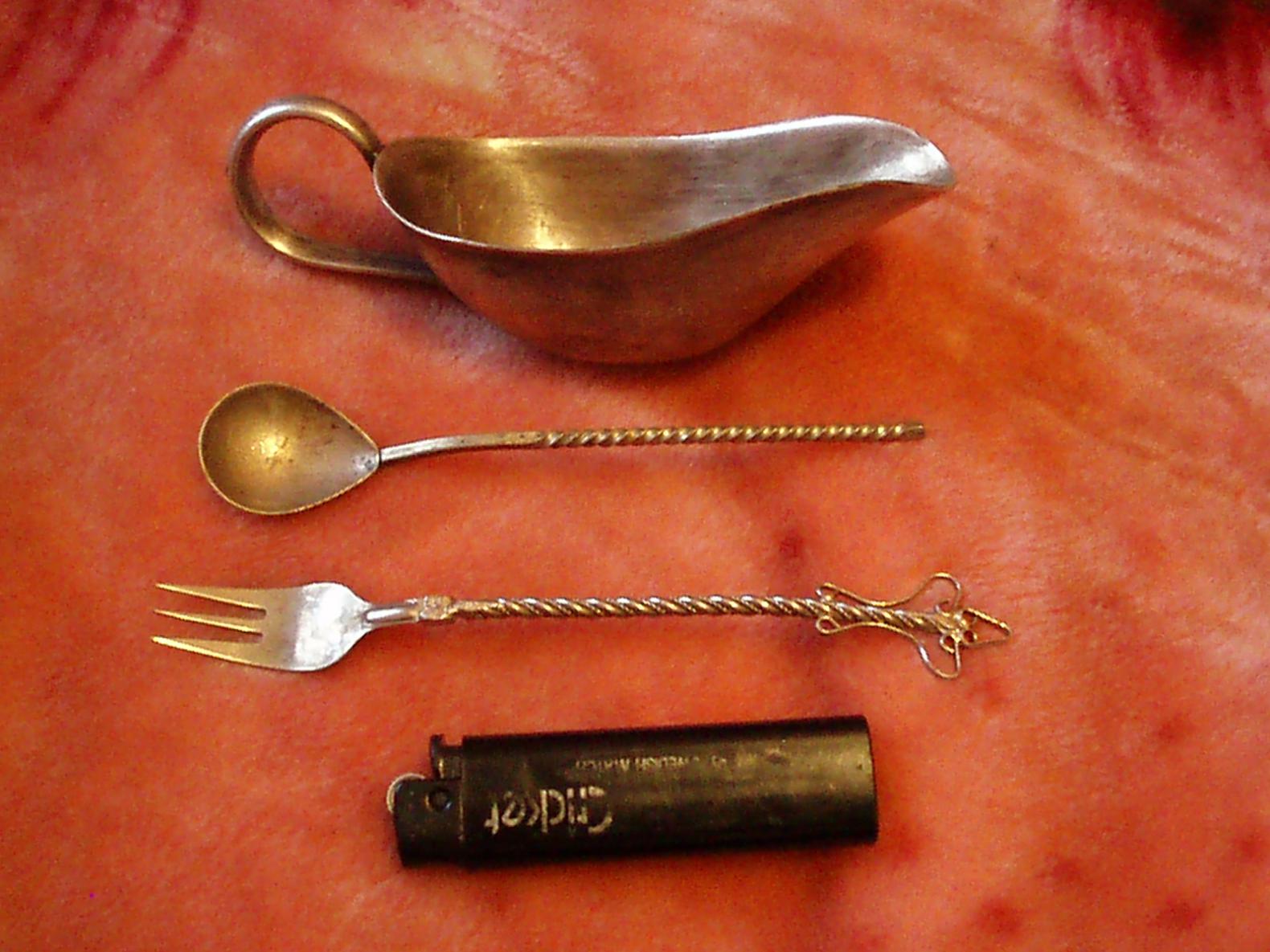 Нормальные такие предметы обеденного стола, на любителя: вилка и ложка по 30-50грн. соусник гдето 70-100грн. Ориентируюсь на цены Запрожских развалов -30%%