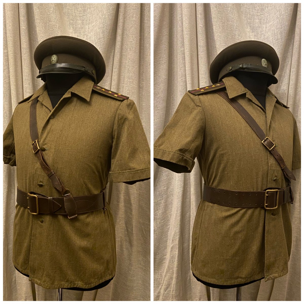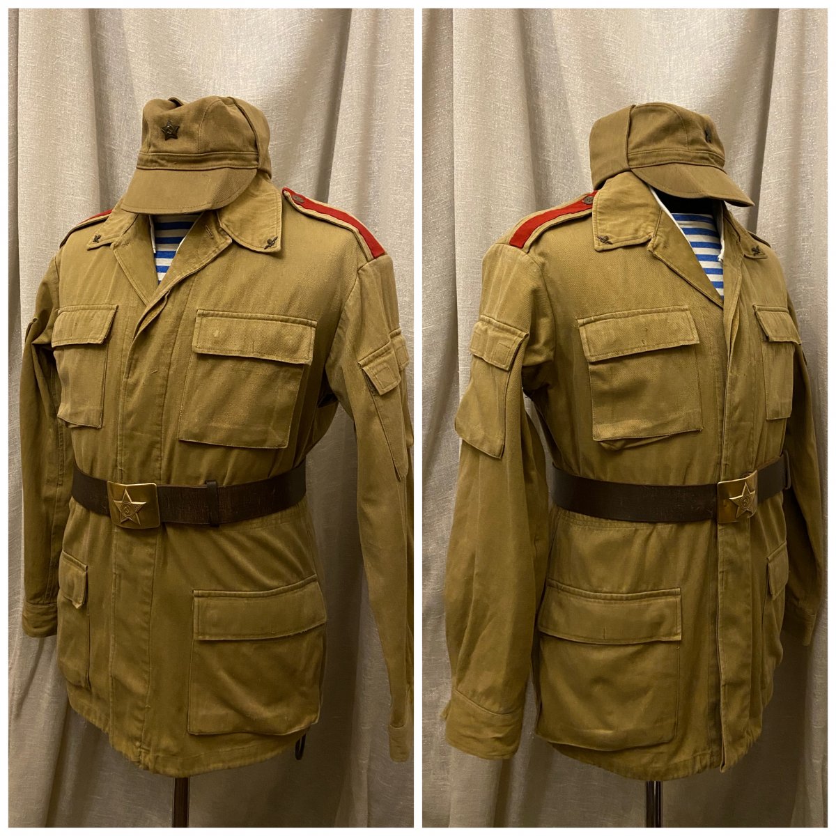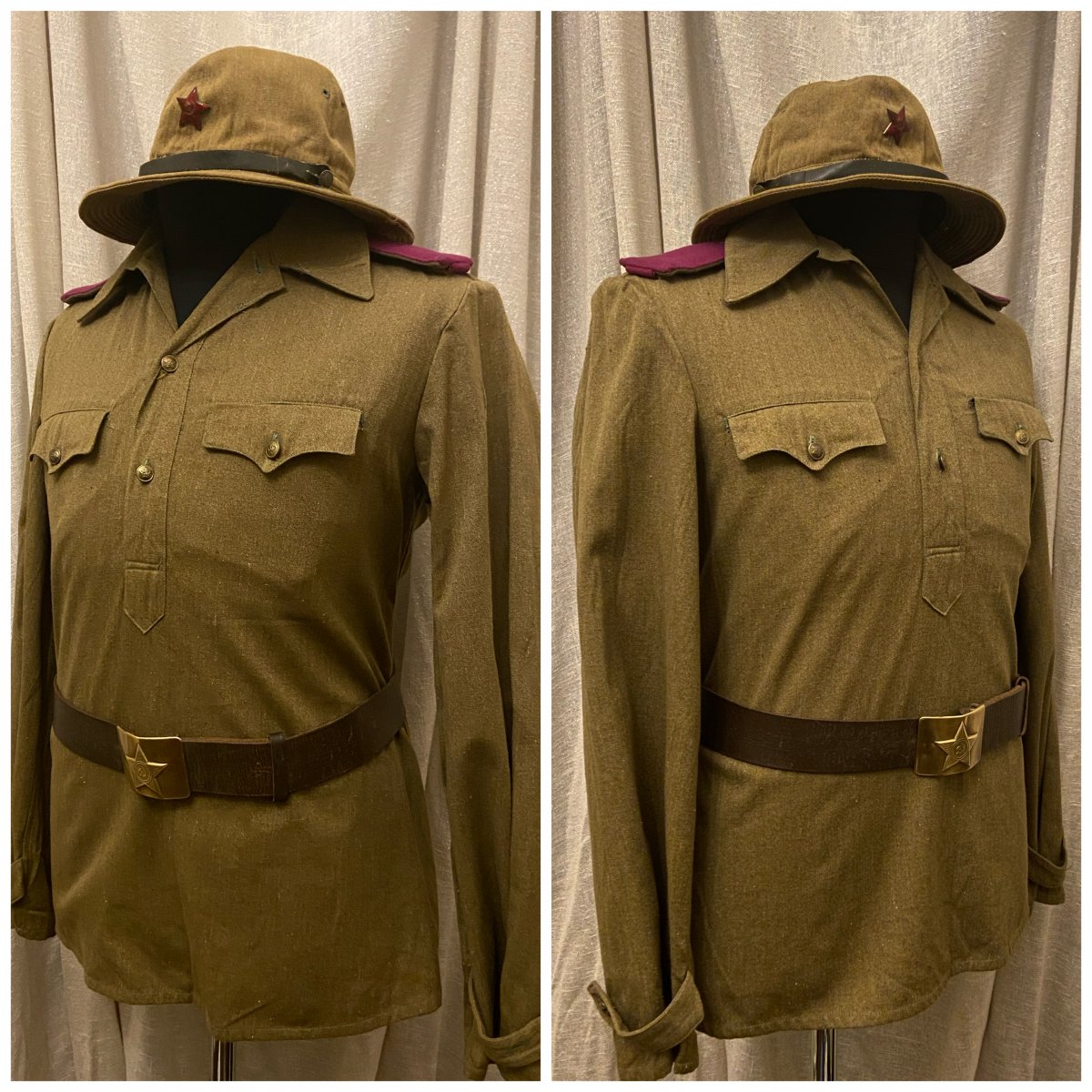 Что ж, начнём. Подсчитав все, что можно отснять в таком формате, вышло порядка 55 кителей (пиджаков, мундиров, рубашек) и около 10 предметов снаряжения. К сожалению не все подходит по размеру манекена, соотвественно не смогу показать все, что в коллекции имеется. Так же, сначала выложу тут, потом создам отдельную тему, где сообщения будут разделены по категориям. предметы униформы после 55 года и до 69 года. 1) Гимнастерка срочнослужащего для регионов с жарким климатом. Пехота, рядовой. Для Панамы должна идти маленькая звезда - исправлю 2) Гимнастерка срочнослужащего. Связь, рядовой. 3) Рубашка с коротким рукавом для жаркого климата. Пехота, капитан. По фотографиям - носилась как с Панамой, так и с фуражкой. Предположу, что вариант с панамой чаще встречался вне строя, на работах, учениях и т.д. 4) Гимнастерка срочнослужащего, полушерстяная. Внутренние войска, ефрейтор.