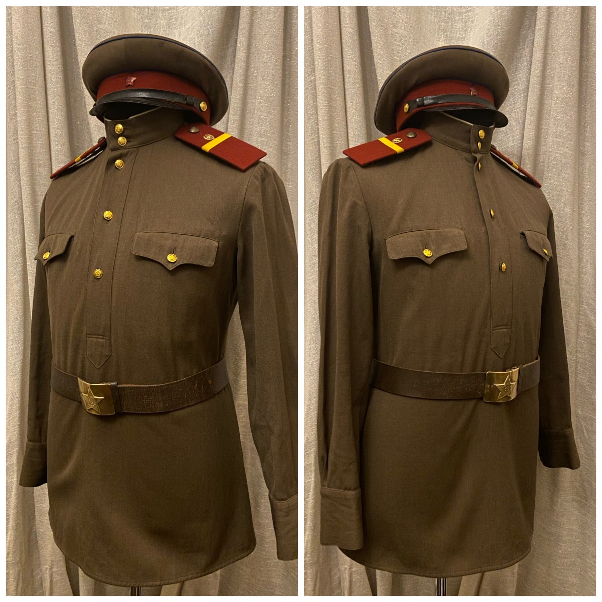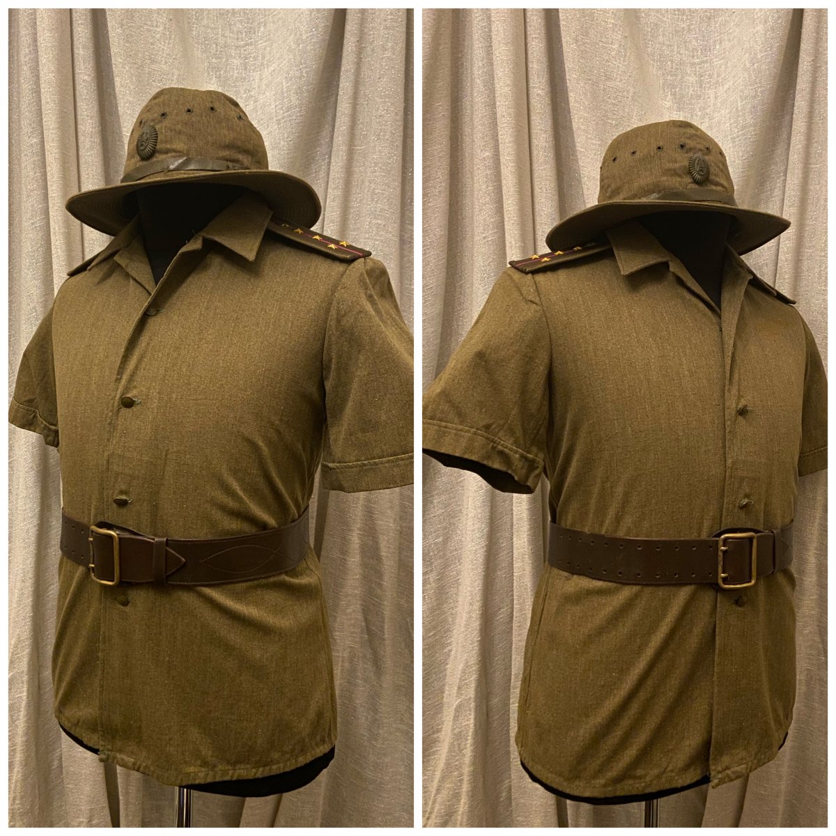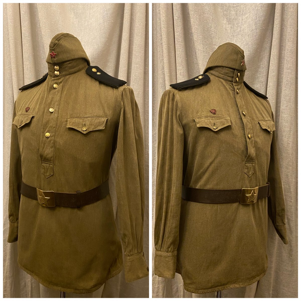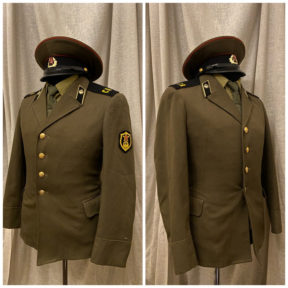 Что ж, начнём. Подсчитав все, что можно отснять в таком формате, вышло порядка 55 кителей (пиджаков, мундиров, рубашек) и около 10 предметов снаряжения. К сожалению не все подходит по размеру манекена, соотвественно не смогу показать все, что в коллекции имеется. Так же, сначала выложу тут, потом создам отдельную тему, где сообщения будут разделены по категориям. предметы униформы после 55 года и до 69 года. 1) Гимнастерка срочнослужащего для регионов с жарким климатом. Пехота, рядовой. Для Панамы должна идти маленькая звезда - исправлю 2) Гимнастерка срочнослужащего. Связь, рядовой. 3) Рубашка с коротким рукавом для жаркого климата. Пехота, капитан. По фотографиям - носилась как с Панамой, так и с фуражкой. Предположу, что вариант с панамой чаще встречался вне строя, на работах, учениях и т.д. 4) Гимнастерка срочнослужащего, полушерстяная. Внутренние войска, ефрейтор.