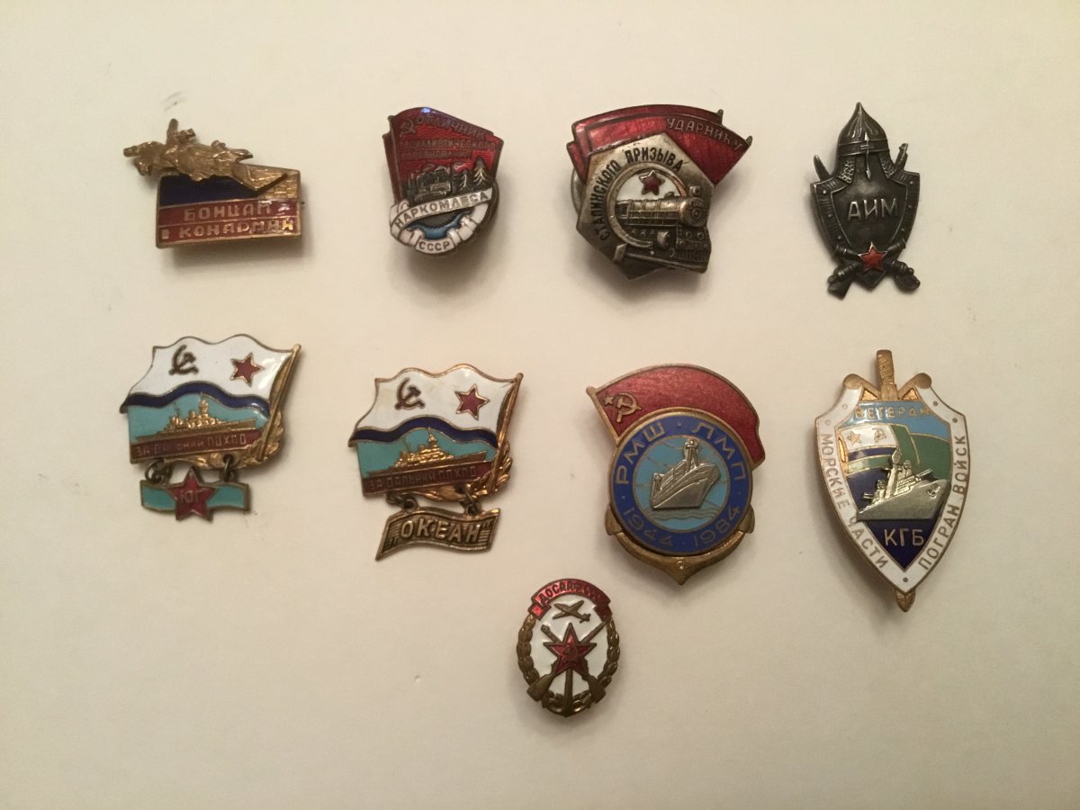 Добрый вечер уважаемые господа,попались вот такие значки, буду продавать на ebay хотелось бы узнать есть что-то ценное или нет . На мой взгляд отличник наркомлеса стоящий и может океан и юг , кто что думает ?