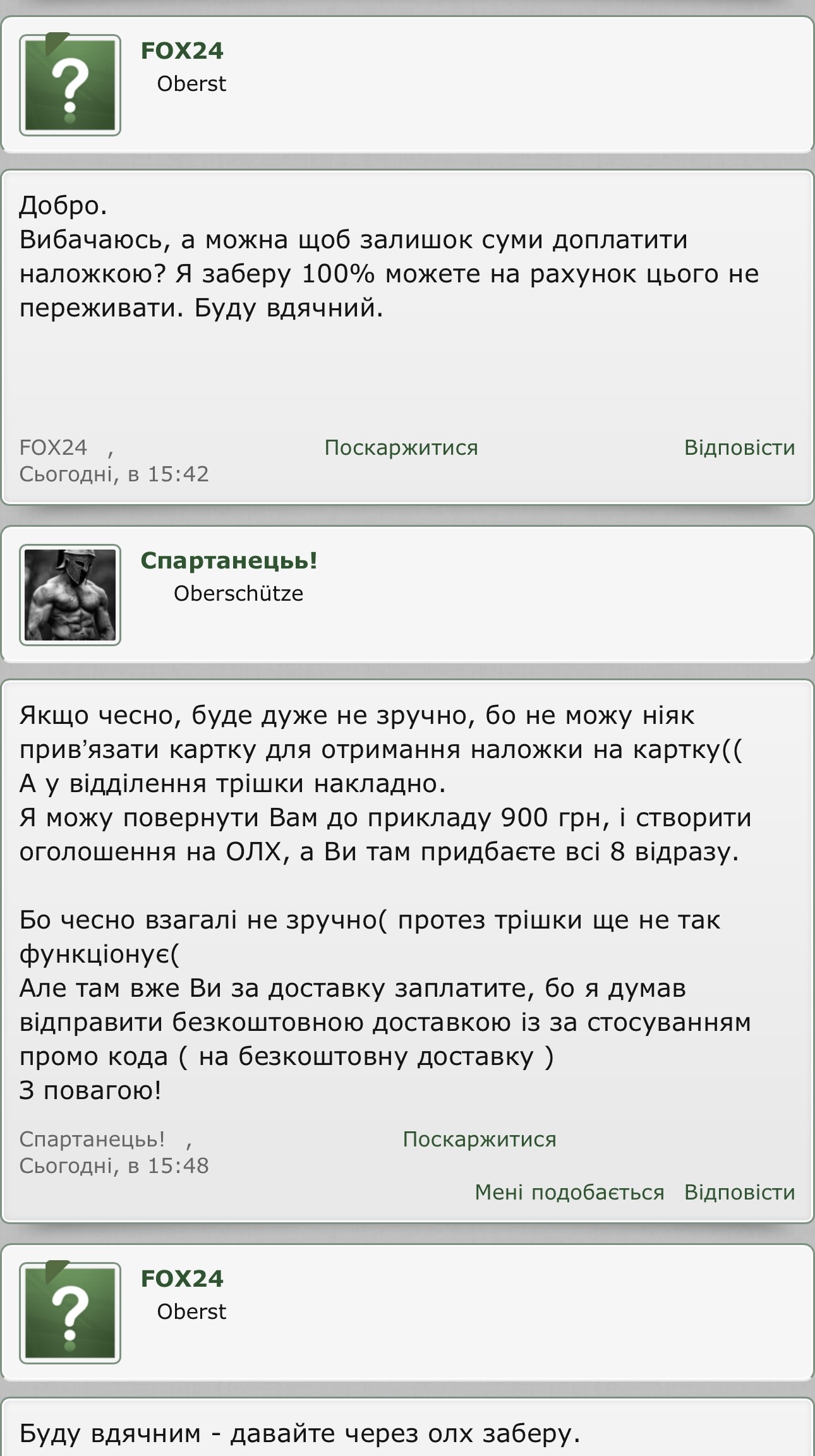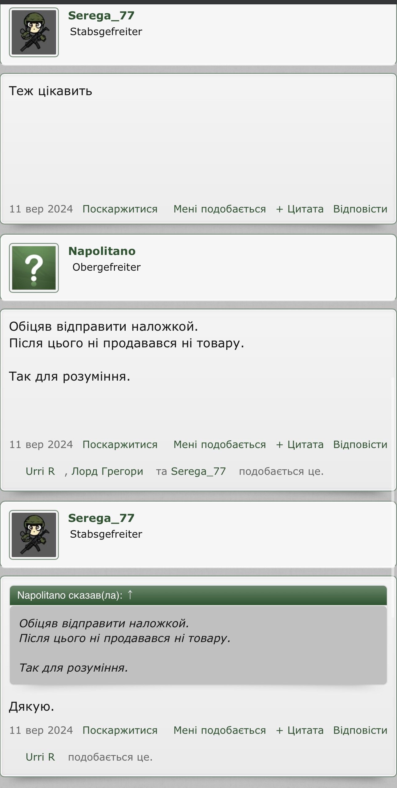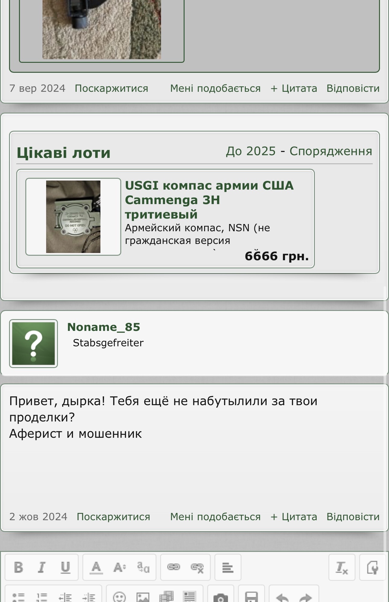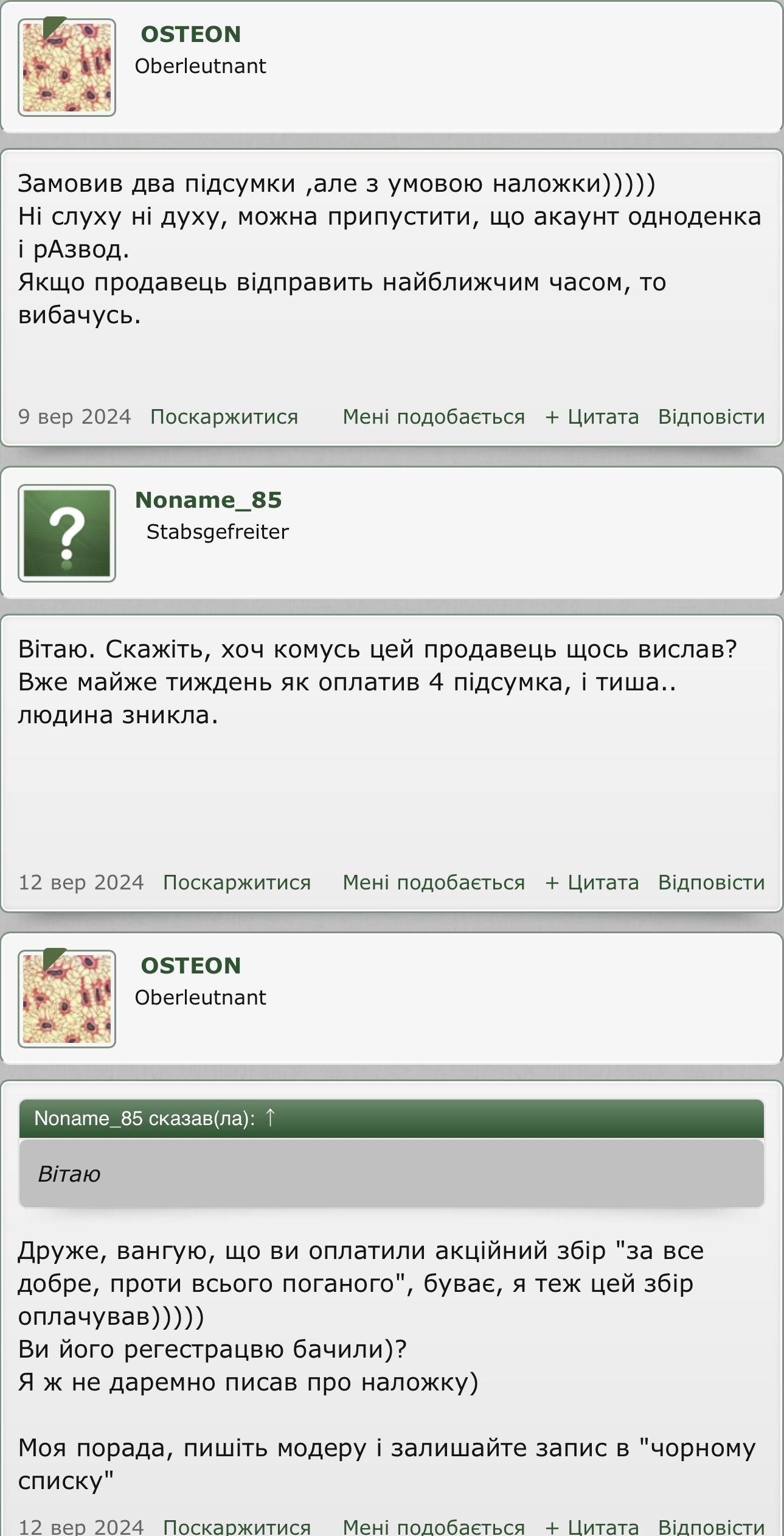 От і я попав на шахрая. За 16 років на форумі - перший раз. (https://reibert.info/members/spartanec.318164/ ) Продавав цей мудак магазини до АК. Написав в лічку йому, він відповів що є 3 шт, я глянув його реєстрацію - 2024 рік, ну, думаю, має бути все ок. Скинув 900 грн. Потім пише є ще. Ну, кажу, давай куплю ще. Щось не міг він визначитись, що в нього є і скільки. Але щось насторожило мене це, кажу, давай наложкою? Ні, не хоче він. Пише що він каліка, з протезом, не може ходити і тд. Навіть пропонував повернути гроші і оформити це все олх доставкою. Кажу йому - давай! Нє, не хоче. Пропав він загалом. А я то потім лише почитав його теми, що там пишуть. Виявляється - таких як я повно, ще з 2024 року. І до цих пір від не в бані. Він вчора знову пару тем створив. Фотки там всі з інтернету! Так от, пропоную всіх, кого він кинув написати мені в особисті, напишемо заяву в кіберполіцію та в службу безпеки Укрсиббанку, хай вживають заходів. Таке от. Не ведіться на цього окуня, та й взагалі менше кидайте передоплат. Хай йому ці гроші реально на протез підуть. Я щоб не був зараз на позиціях, з радістю би йому допоміг з цим. Але то таке. Хай ці курви повиздихають. Модератору готовий відкрити переписку. Бережіть себе. Номер карти: Укрсиббанк 5354328075657516