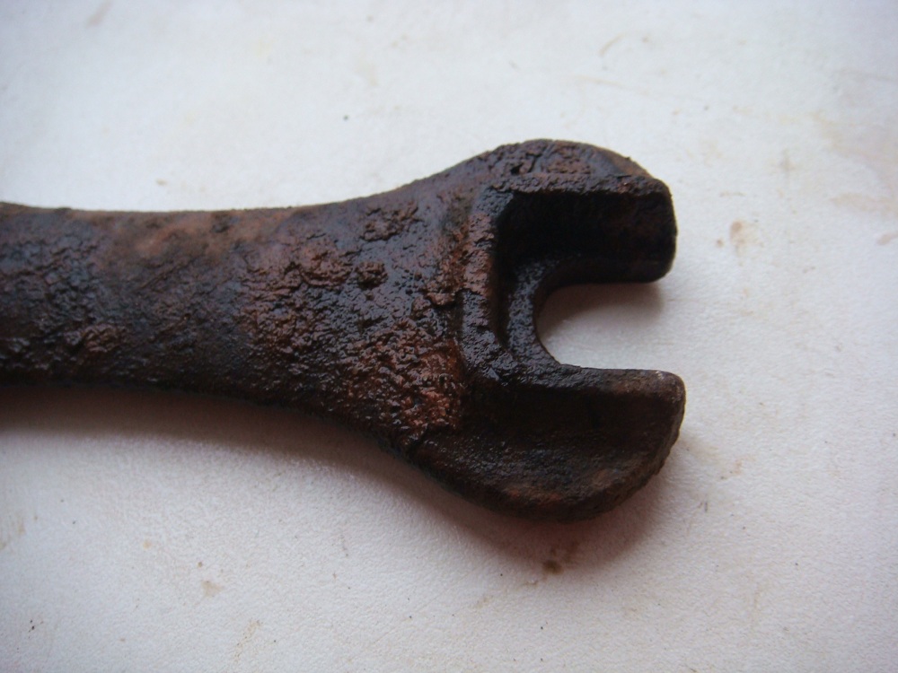 Вот и мой ключик. Нашел на заре своего копа, на немецком аэродроме, был весь ржавый, но так как тогда тащил домой все то и он попал ко мне. Потом я на нём пробовал щавелевую кислоту и был просто в шоке увидев её действие. Ключ оказался никелированным. Жалко только клеймо попало в очаг глубокой ржавчины. Может кто встречал подобный?