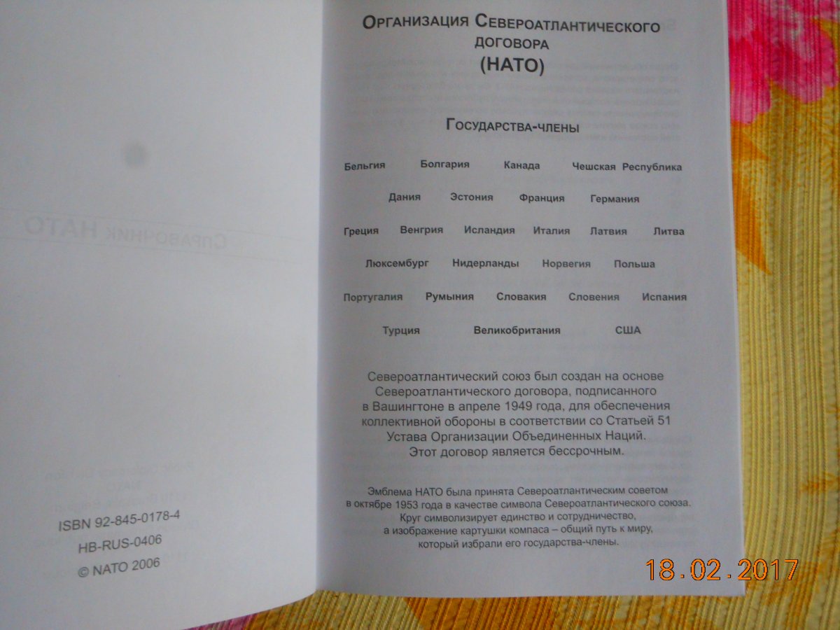 Предложу книгу почти в идеальном состоянии (новая, но слегка заломился уголок при перевозке) - справочник стран НАТО. Издано в Брюсселе на русском языке(2006 год) Это самая подробная книга о структуре НАТО( на то время). 440 с. Цена 30 гр.Доставка новая почта или укр почта.
