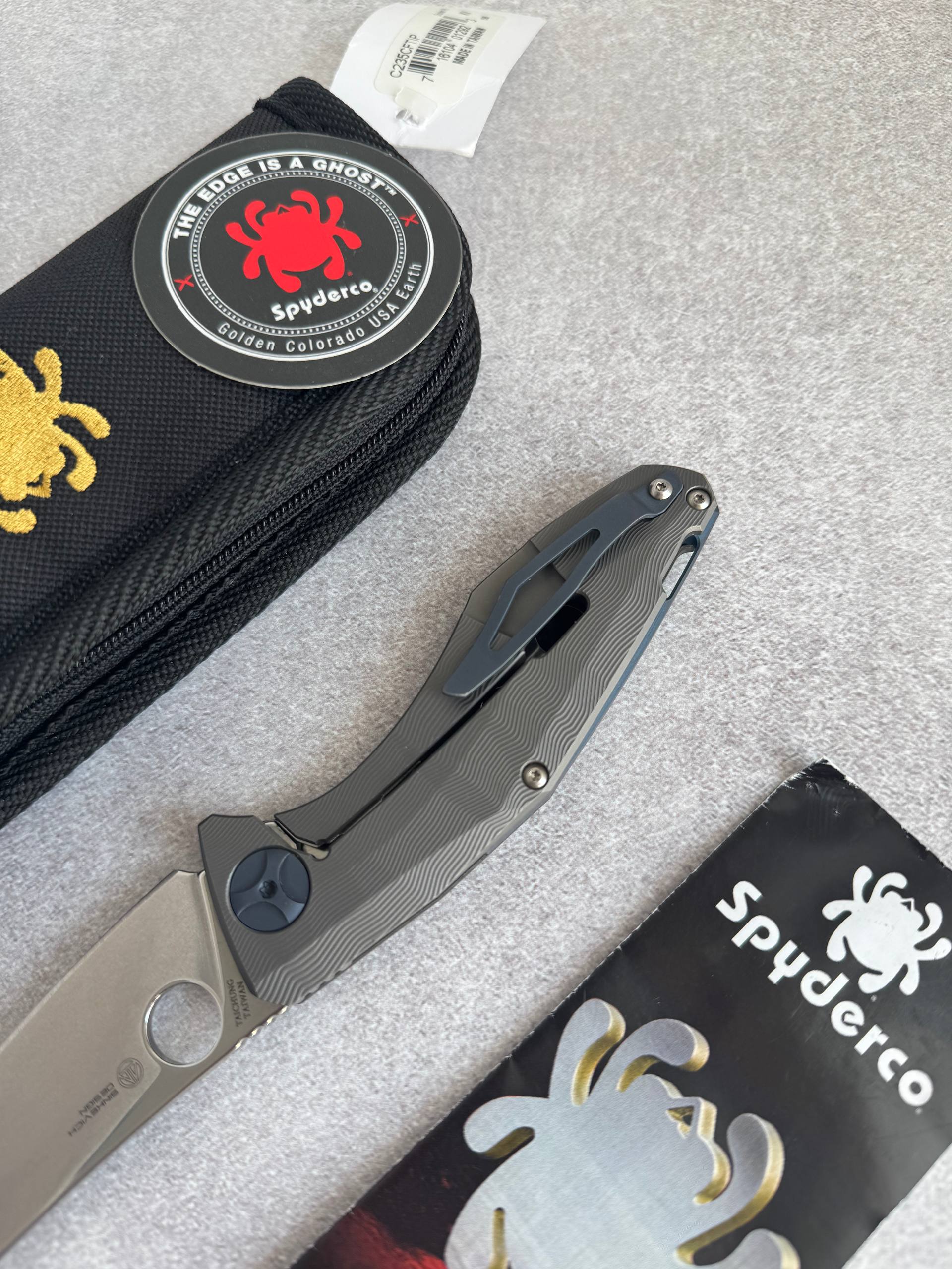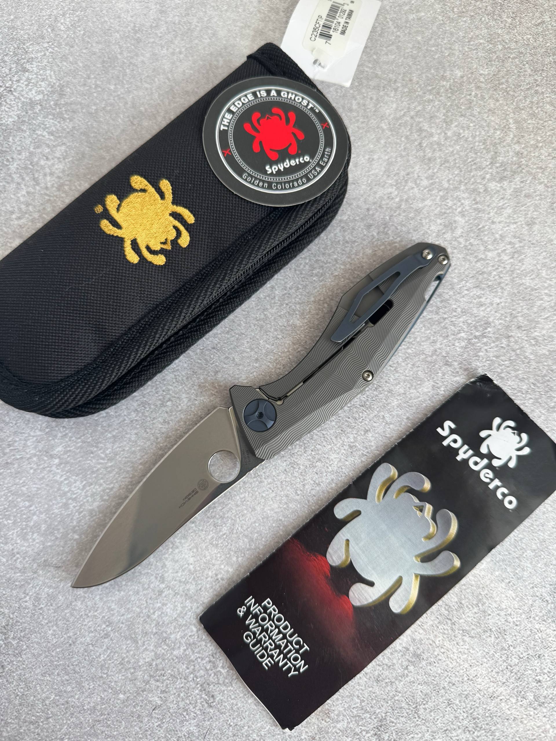 Spyderco Drunken Преміальний фолдер від Spyderco. Drunken одразу впадає в око завдяки унікальній текстурі титану в поєднанні з карбоновою плашкою. Ергономіка на висоті — ніж ідеально лежить у руці, а чудова механіка (на шайбах) дарує справжнє задоволення при кожному відкритті. Клинок із преміальної сталі S90V забезпечує відмінне утримання ріжучої кромки та високу зносостійкість. Стан — ідеальний (мікро слід на кліпсі) Ціна — 19800 грн Технічні характеристики: Загальна довжина — ~209 мм Довжина клинка — ~89 мм Товщина клинка — ~3.0 мм Сталь — CPM S90V Руківʼя — титан + карбон Замок — Frame Lock Вага — ~116 г